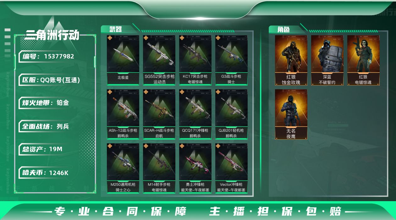 [15377982]19m总资产-1246k哈伏币-60烽火等级-铂金-11战场等级-列兵 【干员外观】:红狼-蚀金玫瑰,无名-夜鹰,深蓝-不破誓约,红狼-电锯惊魂 【近战皮肤】:近战-北极星,近战-黑鹰 【传说外观】:M4A1突击步枪-蚀金玫瑰,M4A1突击步枪-阿米娅,ASh-12战斗步枪-鹅鸭杀,SG552突击步枪-运动员,AK-12突击步枪-夜鹰,AK-12突击步枪-特斯拉线圈,SCAR-H战斗步枪-启航,G3战斗步枪-骑士,CAR-15突击步枪-黑鹰坠落,K437突击步枪-北极星,KC17突击步枪-电锯惊魂,Vector冲锋枪-能天使-午夜邮差,UZI冲锋枪-特斯拉线圈,SMG-45冲锋枪-骑士,SR-3M紧凑突击步枪-特斯拉线圈,勇士冲锋枪-能天使-午夜邮差,QCQ171冲锋枪-北极星,QCQ171冲锋枪-鹅鸭杀,M250通用机枪-骑士之心,QJB201轻机枪-鹅鸭杀,M14射手步枪-电锯惊魂 【史诗外观】:AKM突击步枪-林中猎手,ASh-12战斗步枪-守夜人,ASh-12战斗步枪-无极限,AUG突击步枪-蝮蛇,SG552突击步枪-尖端治疗,SG552突击步枪-深海恐惧,SCAR-H战斗步枪-囚徒,AS Val突击步枪-尖端治疗,AS Val突击步枪-百步穿杨,腾龙突击步枪-猎鳄行动,K437突击步枪-守护者,MP5冲锋枪-深海恐惧,MP5冲锋枪-战术竞备,Vector冲锋枪-阿萨拉文明,Vector冲锋枪-异域战争,SR-3M紧凑突击步枪-战术竞备,勇士冲锋枪-工业狂潮,MP7冲锋枪-守护者,M1014霰弹枪-林中猎手,S12K霰弹枪-曙光,PKM通用机枪-蝮蛇,PKM通用机枪-守夜人,M250通用机枪-囚徒,Mini-14射手步枪-守护者,SVD狙击步枪-阿萨拉工艺,M14射手步枪-黑鹰坠落,SR-25射手步枪-尖端治疗,SR-25射手步枪-聚光灯,SV-98狙击步枪-囚徒,M700狙击步枪-守夜人,AWM狙击步枪-无极限,.357左轮-幸运时刻,复合弓-守护者 【稀有外观】:PKM通用机枪-极地勘察队,AKM突击步枪-战术演练,QBZ95-1突击步枪-公平竞技,K416突击步枪-黑骑士,M16A4突击步枪-远航,M7战斗步枪-捣蛋鬼,SCAR-H战斗步枪-童趣,SCAR-H战斗步枪-远航,SCAR-H战斗步枪-荣耀列队,SCAR-H战斗步枪-黄昏,G3战斗步枪-战