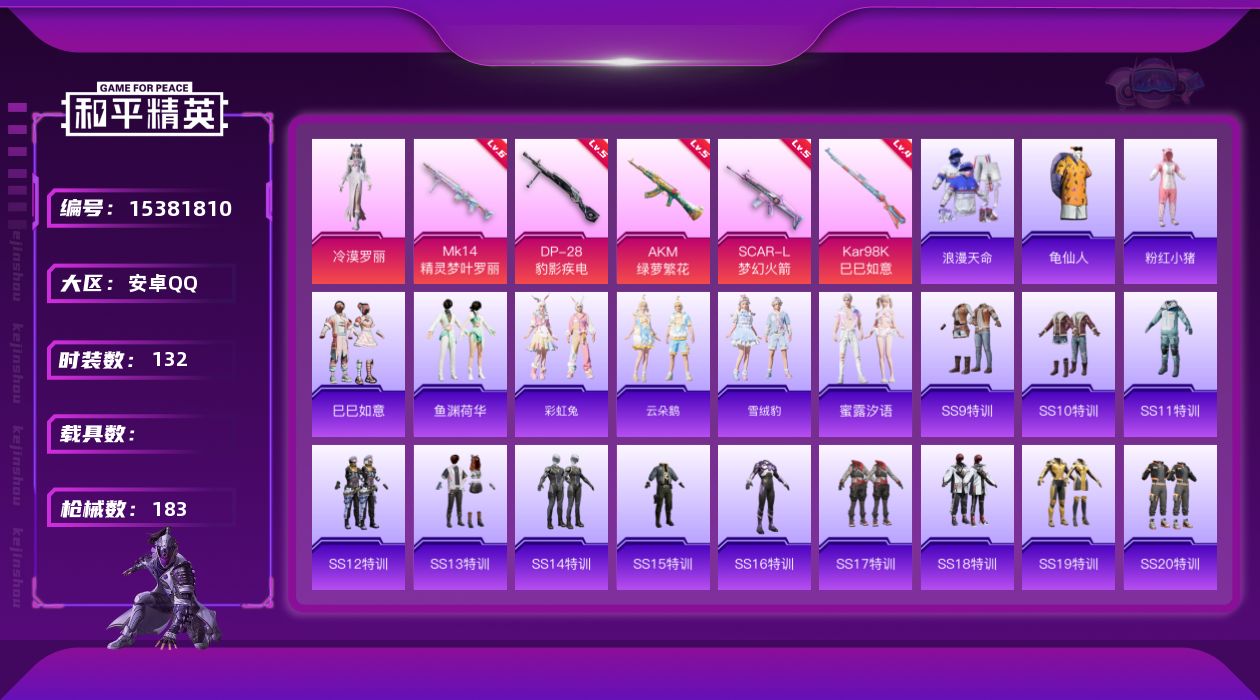 - [13576433]可二次【店主推荐捡漏号!可直接换绑】/素材身法号/地铁满天赋 安卓 手Q-12粉装-9特效枪-4载具-4粉色飞行器-9.3w热力值-12王牌印记-201套装-261枪皮【热门品类】:套装-龟仙人,套装-暗影哥特【粉色载具】:特斯拉Model X(珍珠白),特斯拉Roadster(沁心粉),仰望U9(赤霞丹朱),宝马M4(圣保罗黄)【粉色套装】:粉装-金属狂野,粉装-智能音符,粉装-PEL轰鸣竞梦者,粉装-古堡领主,粉装-草莓生巧,粉装-冰霜白皇,粉装-炙焰红王,粉装-绮梦青鸾,粉装-闲梦青缨,角色-樱桃泡泡,角色-冷漠罗丽,角色-绯穹魔姬【粉色枪皮等级】:AKM-炫紫旋律(七级),AKM-绿萝繁花(五级),GROZA-镜光银凌(五级),AUG-暖羊咩咩(五级),Vector-绯穹魔姬(六级),P90-冷漠罗丽(五级),Kar98K-巳巳如意(五级),Mk14-樱桃泡泡(七级),DP-28-豹影疾电(五级)【粉色飞行器】:炫紫旋律飞行器,PEL轰鸣竞梦者飞行器,神秘黑猫飞行器,夏日绵绵冰飞行器