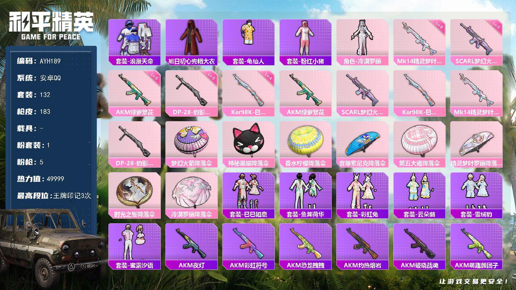[15381810]地铁满天赋 【特价出售/店主推荐】安卓 手Q-1粉装-5特效枪-0载具-0粉色飞行器-49999热力值-3王牌印记-132套装-183枪皮【热门品类】:套装-浪漫天命,旭日初心兜帽大衣,套装-龟仙人,套装-粉红小猪【粉色套装】:角色-冷漠罗丽【粉色枪皮等级】:AKM-绿萝繁花(五级),SCAR-L-梦幻火箭(五级),Kar98K-巳巳如意(四级),Mk14-精灵梦叶罗丽(六级),DP-28-豹影疾电(五级)【粉色枪皮】:AKM-绿萝繁花,SCAR-L-梦幻火箭,Kar98K-巳巳如意,Mk14-精灵梦叶罗丽,DP-28-豹影疾电