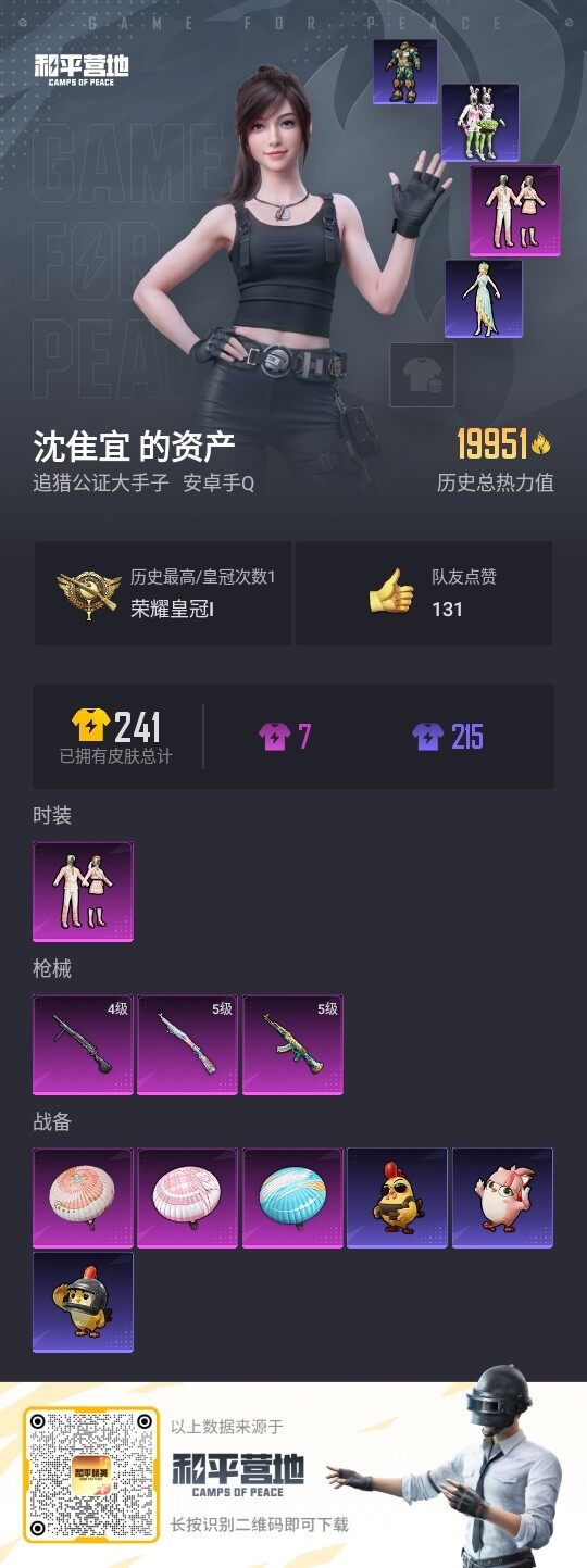 - [14232728]【店主推荐捡漏号!可直接换绑】/地铁满天赋 安卓 手Q-5特效枪-1粉色飞行器-1.8w热力值-2王牌印记-54套装-66枪皮【粉色枪皮等级】:GROZA-镜光银凌(五级),AUG-暖羊咩咩(五级),Kar98K-巳巳如意(五级),Mk14-甜梦熊击(五级),DP-28-豹影疾电(五级)