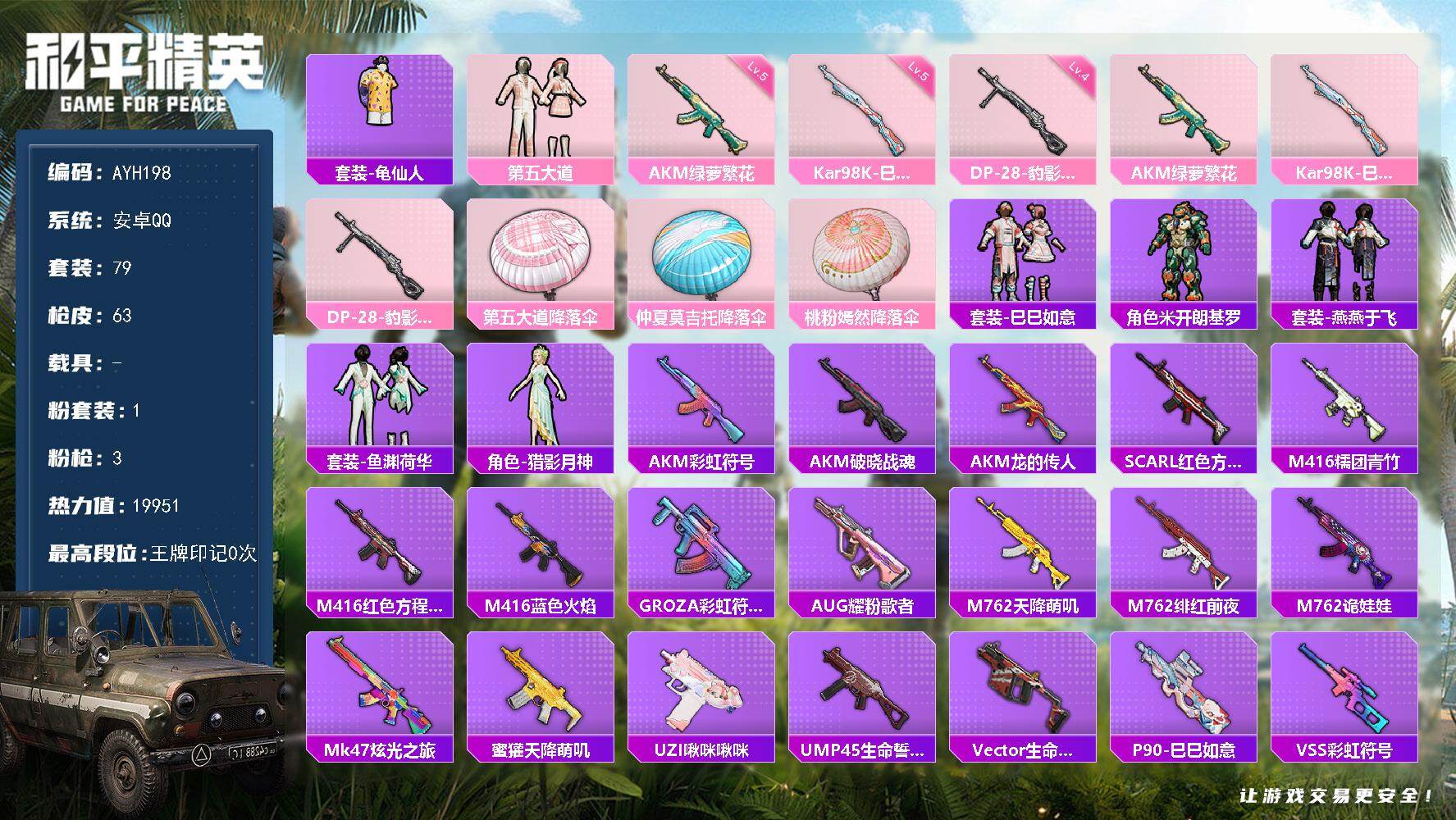 [15381984]【特价出售/店主推荐】安卓 手Q-1粉装-3特效枪-0载具-0粉色飞行器-19951热力值-1王牌印记-79套装-63枪皮【热门品类】:套装-龟仙人【粉色套装】:粉装-第五大道【粉色枪皮等级】:AKM-绿萝繁花(五级),Kar98K-巳巳如意(五级),DP-28-豹影疾电(四级)【粉色枪皮】:AKM-绿萝繁花,Kar98K-巳巳如意,DP-28-豹影疾电