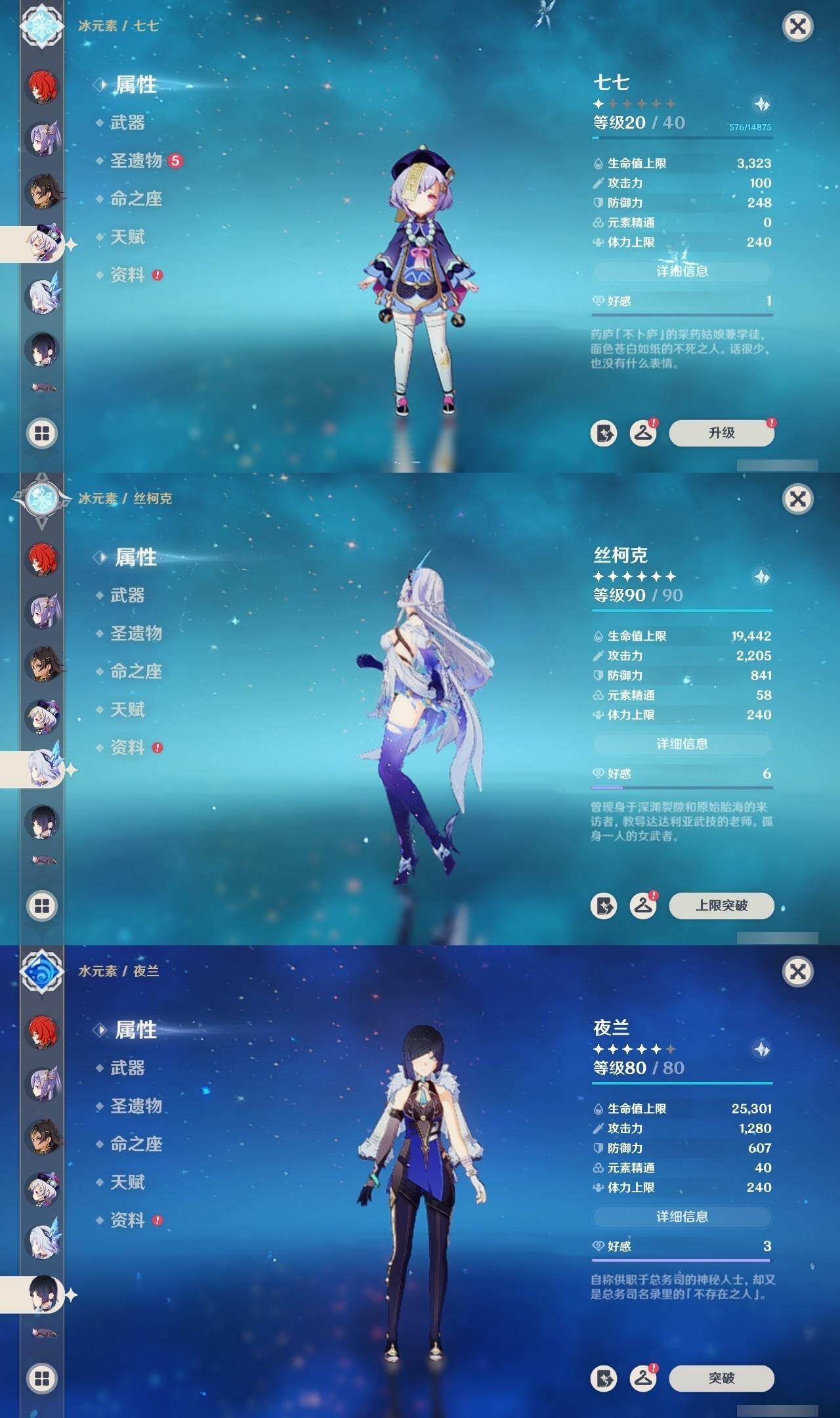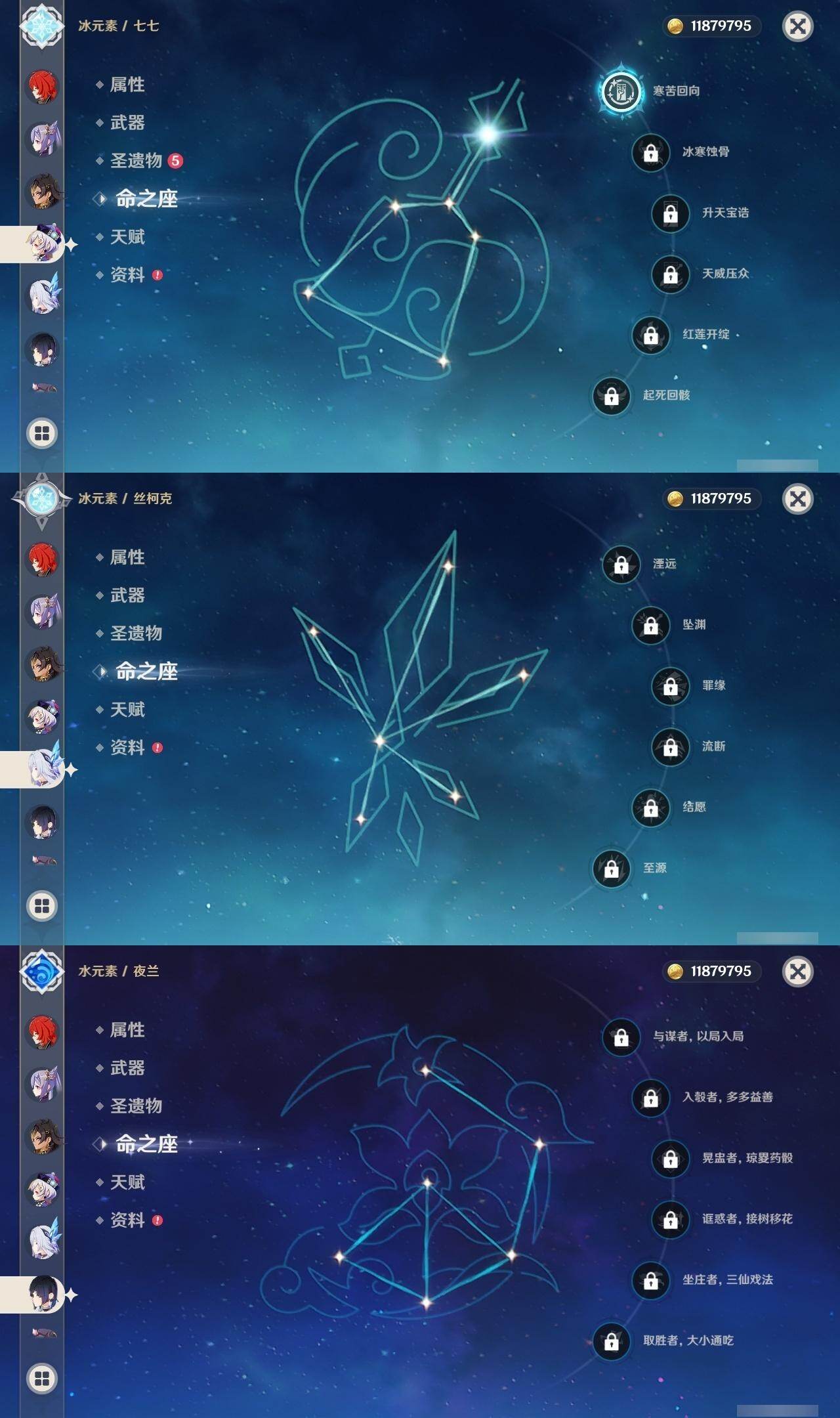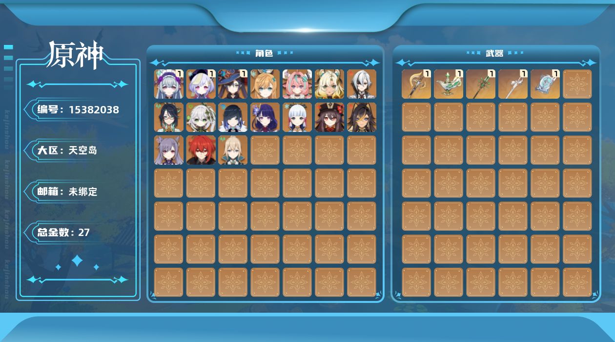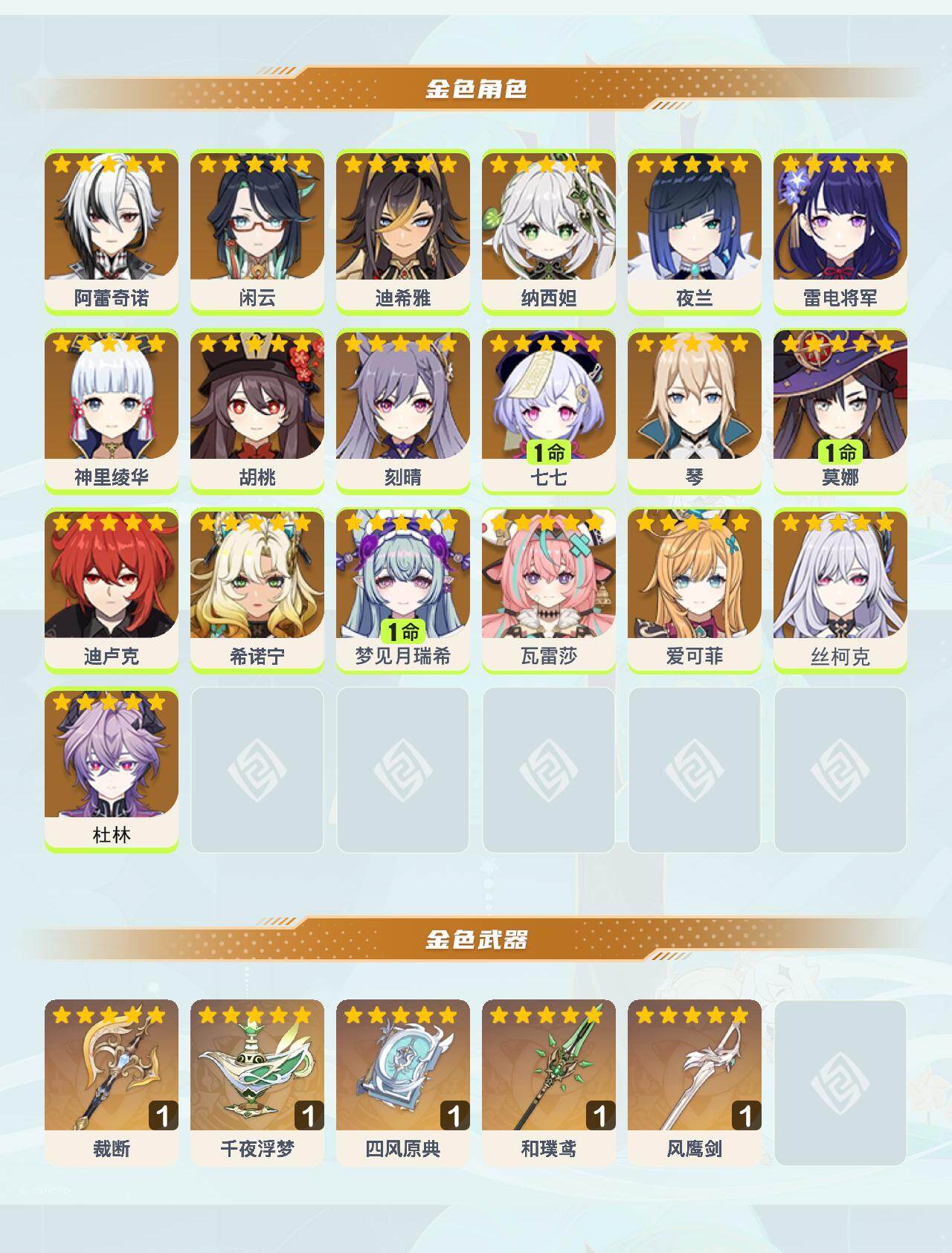 0命阿蕾奇诺,0命闲云,0命迪希雅,0命纳西妲,0命夜兰,0命雷电将军,0命神里绫华,0命胡桃,0命刻晴,1命七七,0命琴,1命莫娜,0命迪卢克,0命希诺宁,1命梦见月瑞希,0命瓦雷莎,0命爱可菲,0命丝柯克,0命杜林,精1裁断,精1千夜浮梦,精1四风原典,精1和璞鸢,精1风鹰剑