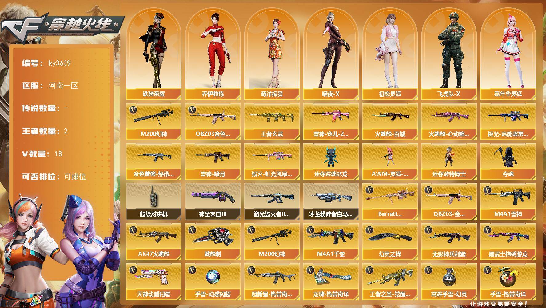 [15382069]河南一区-18V-2王者-0炫金 【热门武器】:QBZ03-金色蔷薇,M200-幻神 【王者炫金武器】:王者玄武 【皮肤】:金色蔷薇-热带奇洋 皮肤,雷神-暗月,雷神-宠儿-2019MVP,火麒麟-百城,火麒麟-心动糖果,毁灭-虹光风暴 皮肤,极光-高能霹雳 皮肤 【角色】:奇洋探员,乔伊教练,暗夜-X,初恋灵狐,飞虎队-X,嘉年华灵狐,娟娟,0号玩家,灵狐-花神,灵狐者-X,龙儿,麻雀,曼陀罗-X,曼陀罗-礼服,萌儿,潘多拉-X,潘多拉-甜心教官,斯沃特-X,铁骑荣耀,兔囡囡,维纳斯,新娜塔莎,雪莉杨,雪莉杨-摸金校尉,樱-战斗天使,游珑儿 【人偶武器】:AWM-灵狐-15周年嘉年华,迷你深渊冰龙,迷你波特博士,夺魂 【暴走生化】:超级对讲机 【挑战大师】:冰龙粉碎者-白马银枪,激光毁灭者III-白马银枪*2,神圣爆裂者-末日III*2 【英雄级武器】:M4A1-千变,AK47-火麒麟,M4A1-雷神,无影-神兵利器,黑武士-锦绣游龙,超新星-热带奇洋,QBZ03-金色蔷薇,王者之圣-觉醒版,M200-幻神,Barrett-金色蔷薇,天神-动感闪耀,麒麟刺*2,幻灵之锋,龙啸-热带奇洋,高爆手雷-幻灵,手雷-动感闪耀,手雷-热带奇洋,闪光弹-幻灵,烟雾弹-幻灵 【道具】:CFS限定背包,云山科技背包,奇洋探员-海龟背包,炫彩背包,热带奇洋炫彩背包,超级背包,女皇终结者-魔龙之吻,绿色巨人,灵魂忍者*2,变异宝贝,迷雾幽灵*2,生化弹匣,夺命之镰,防化服*3,金色流光-枪王排位*2,星辰流光-枪王排位,流光-鎏金之域,枪王排位28赛季金色流光,枪王排位29赛季金色流光,热带奇洋表情,C4-红龙,防弹头盔*4,防弹衣*4,C4工具钳*4,手雷包*4 【特殊枪械】: