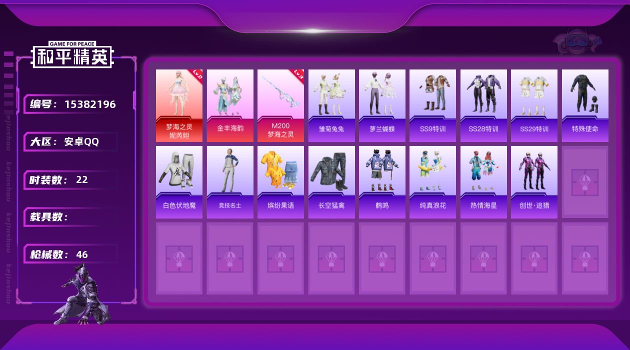 [15382196]地铁满天赋【特价出售/店主推荐】安卓 手Q-1神装-1粉装-1特效枪-0载具-1粉色飞行器-13920热力值-2王牌印记-22套装-46枪皮【红色神装等级】:梦海之灵-妮芮妲(二级)【红色角色神装】:梦海之灵-妮芮妲【粉色套装】:粉装-金丰海韵【粉色枪皮等级】:M200-梦海之灵(三级)【粉色枪皮】:M200-梦海之灵【粉色飞行器】:幻海精灵飞行器