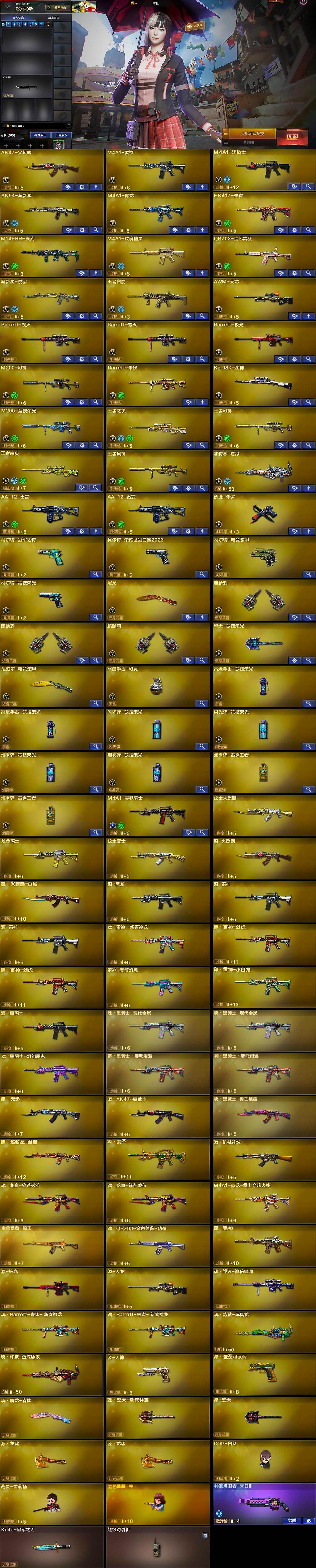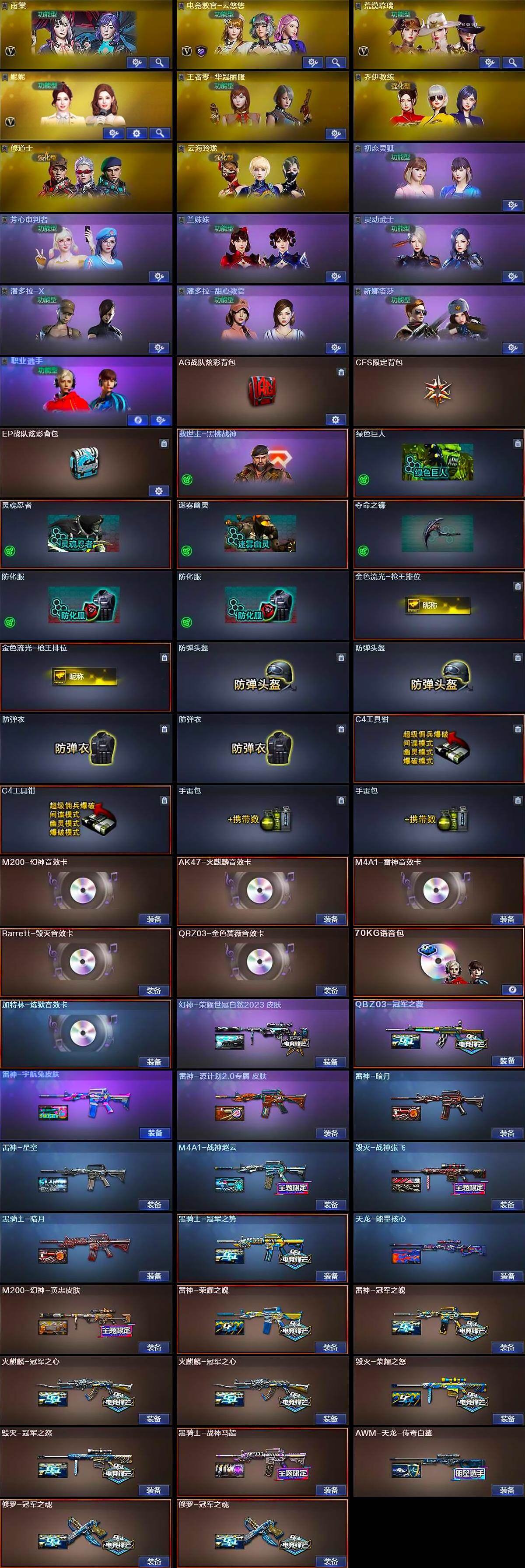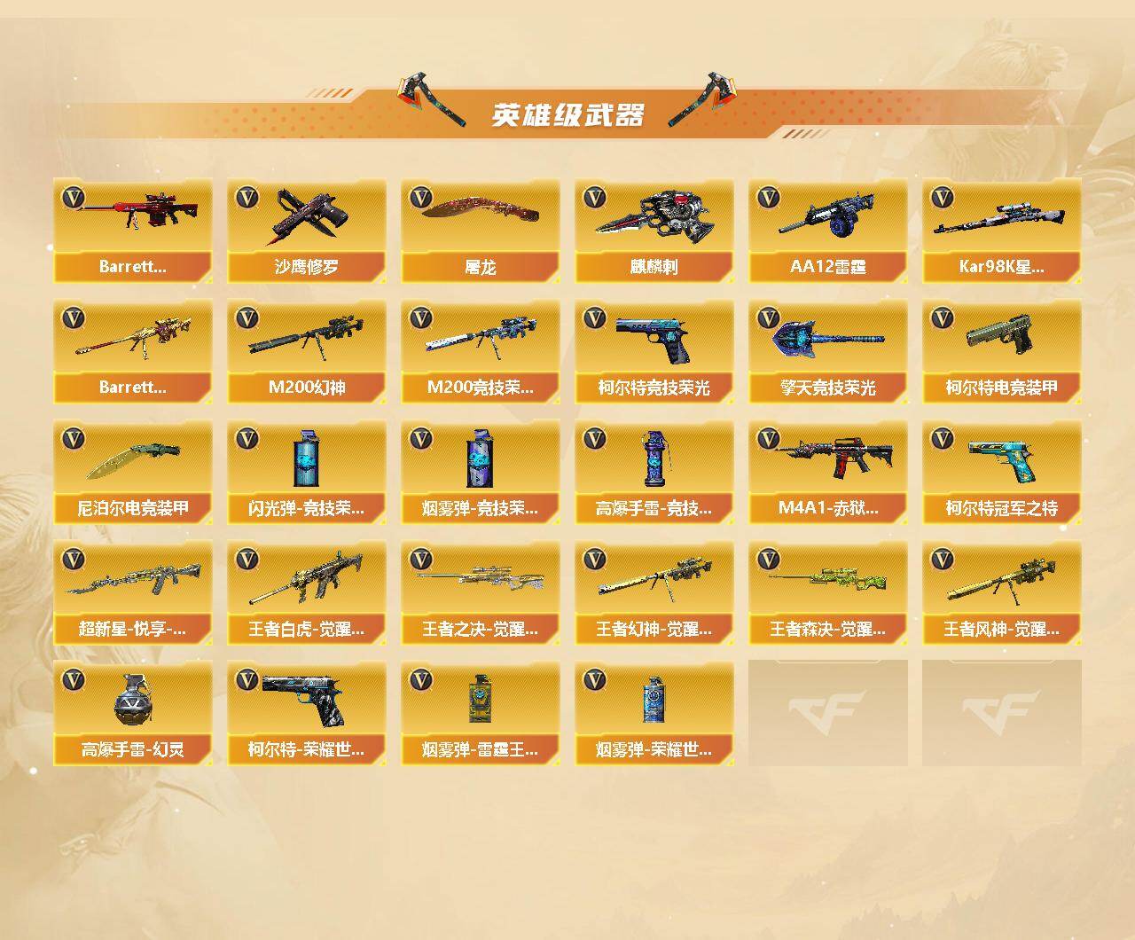【英雄级武器】:AK47-火麒麟,M4A1-雷神,M4A1-黑骑士,AN94-超新星,M4A1-青龙,HK417-朱雀,M14EBR-玄武,M4A1-玫瑰精灵,QBZ03-金色蔷薇,超新星-悦享-觉醒版,王者白虎-觉醒版,AWM-天龙,Barrett-毁灭*2,Barrett-极光,M200-幻神,Barrett-朱雀,Kar98K-星神,M200-竞技荣光,王者之决-觉醒版,王者幻神-觉醒版,王者森决-觉醒版,王者风神-觉醒版,加特林-炼狱,AA-12-雷霆*2,沙鹰-修罗,柯尔特-冠军之特,柯尔特-电竞装甲,柯尔特-荣耀世冠白鲨2023,柯尔特-竞技荣光,屠龙,麒麟刺*3,擎天-竞技荣光,尼泊尔-电竞装甲,高爆手雷-幻灵,高爆手雷-竞技荣光*2,闪光弹-竞技荣光*2,烟雾弹-竞技荣光*2,烟雾弹-雷霆王者-觉醒版*2,烟雾弹-荣耀