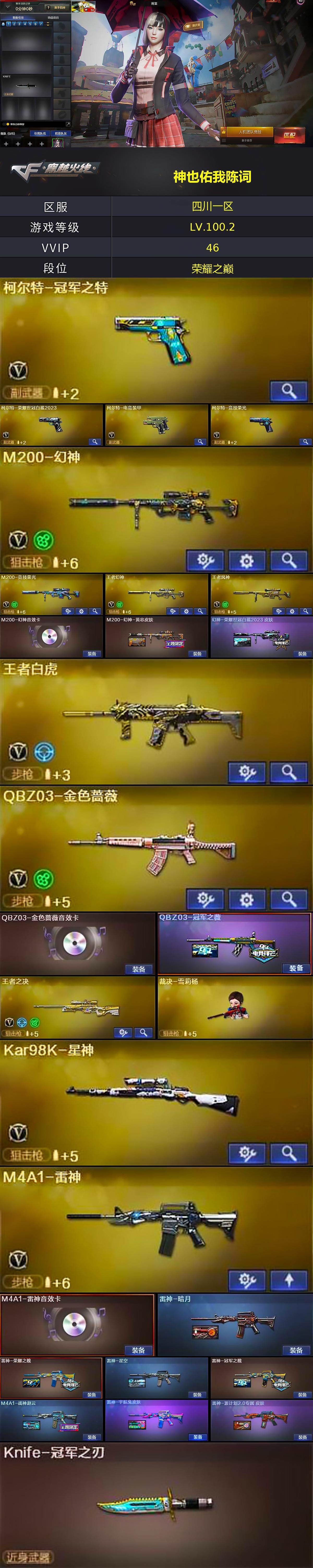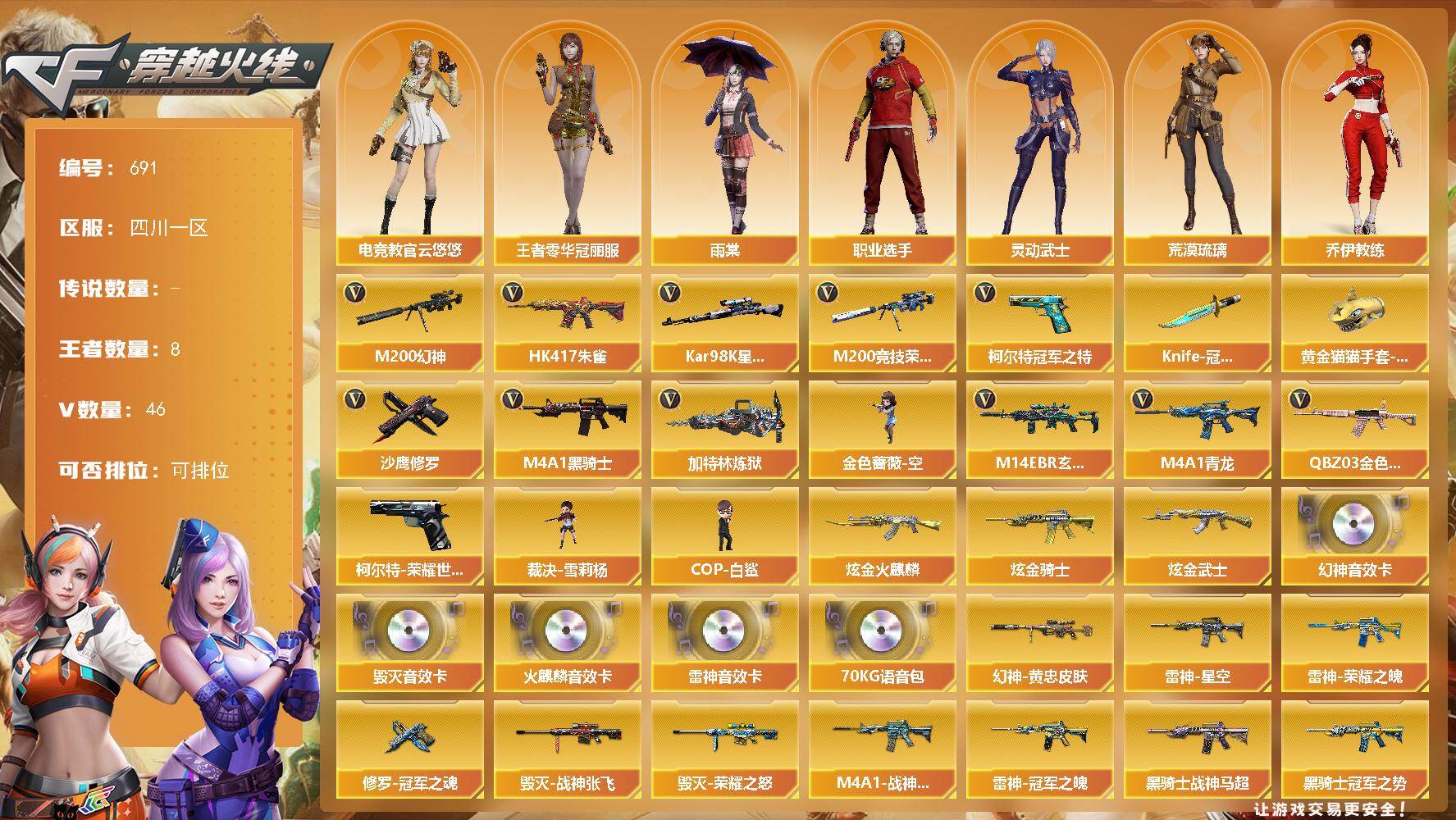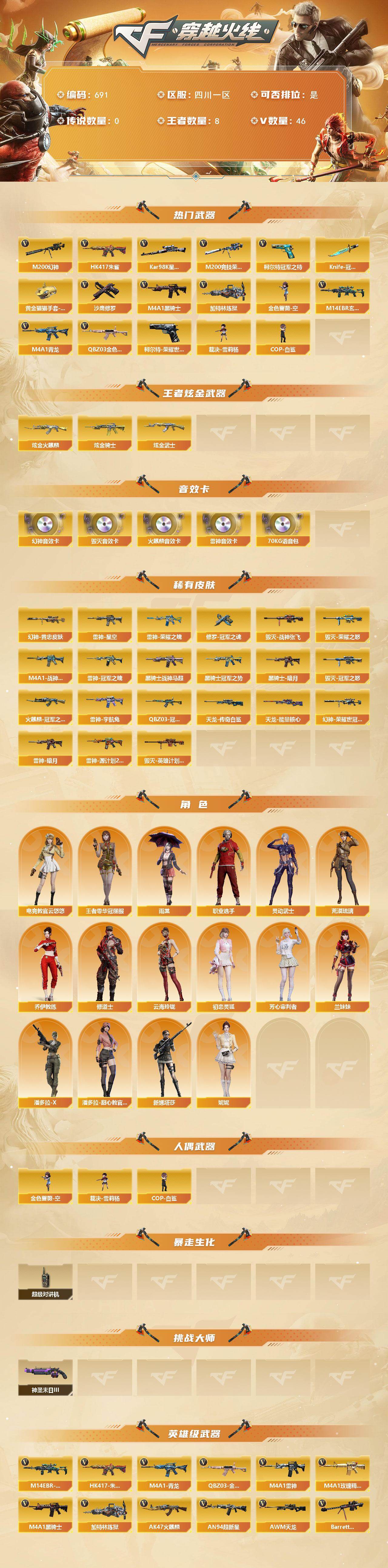 [15382285]四川一区-46V-8王者-3炫金 【热门武器】:QBZ03-金色蔷薇,M14EBR-玄武,HK417-朱雀,M4A1-青龙,M200-幻神,柯尔特-荣耀世冠白鲨2023,M200-竞技荣光,柯尔特-冠军之特,Kar98K-星神,M4A1-黑骑士,加特林-炼狱,金色蔷薇-空,裁决-雪莉杨,COP-白鲨,沙鹰-修罗,Knife-冠军之刃,黄金猫猫手套-白鲨 【王者炫金武器】:炫金火麒麟,炫金骑士,炫金武士 【音效卡】:M200-幻神音效卡,AK47-火麒麟音效卡,M4A1-雷神音效卡,Barrett-毁灭音效卡,70KG语音包 【皮肤】:M200-幻神-黄忠皮肤,幻神-荣耀世冠白鲨2023 皮肤,QBZ03-冠军之薇,雷神-暗月,雷神-荣耀之魄,雷神-星空,雷神-冠军之魄,M4A1-战神赵云,雷神-宇航兔皮肤,雷神-源计划2.0专属 皮肤,火麒麟-冠军之心*2,毁灭-荣耀之怒,毁灭-冠军之怒,毁灭-战神张飞,毁灭-英雄计划 皮肤,黑骑士-暗月,黑骑士-冠军之势,黑骑士-战神马超,天龙-能量核心,AWM-天龙-传奇白鲨,修罗-冠军之魂*2 【角色】:雨棠,电竞教官-云悠悠,荒漠琉璃,妮妮,王者零-华冠丽服,乔伊教练,修道士,云海玲珑,初恋灵狐,芳心审判者,兰妹妹,灵动武士,潘多拉-X,潘多拉-甜心教官,新娜塔莎,职业选手 【人偶武器】:COP-白鲨,裁决-雪莉杨,金色蔷薇-空 【暴走生化】:超级对讲机 【挑战大师】:神圣爆裂者-末日III 【英雄级武器】:AK47-火麒麟,M4A1-雷神,M4A1-黑骑士,AN94-超新星,M4A1-青龙,HK417-朱雀,M14EBR-玄武,M4A1-玫瑰精灵,QBZ03-金色蔷薇,超新星-悦享-觉醒版,王者白虎-觉醒版,AWM-天龙,Barrett-毁灭*2,Barrett-极光,M200-幻神,Barrett-朱雀,Kar98K-星神,M200-竞技荣光,王者之决-觉醒版,王者幻神-觉醒版,王者森决-觉醒版,王者风神-觉醒版,加特林-炼狱,AA-12-雷霆*2,沙鹰-修罗,柯尔特-冠军之特,柯尔特-电竞装甲,柯尔特-荣耀世冠白鲨2023,柯尔特-竞技荣光,屠龙,麒麟刺*3,擎天-竞技荣光,尼泊尔-电竞装甲,高爆手雷-幻灵,高爆手雷-竞技荣光*2,闪光弹-竞技荣光*2,烟雾弹-竞技荣光*2,烟雾弹-雷霆王者-觉醒版*2,烟雾弹-荣耀