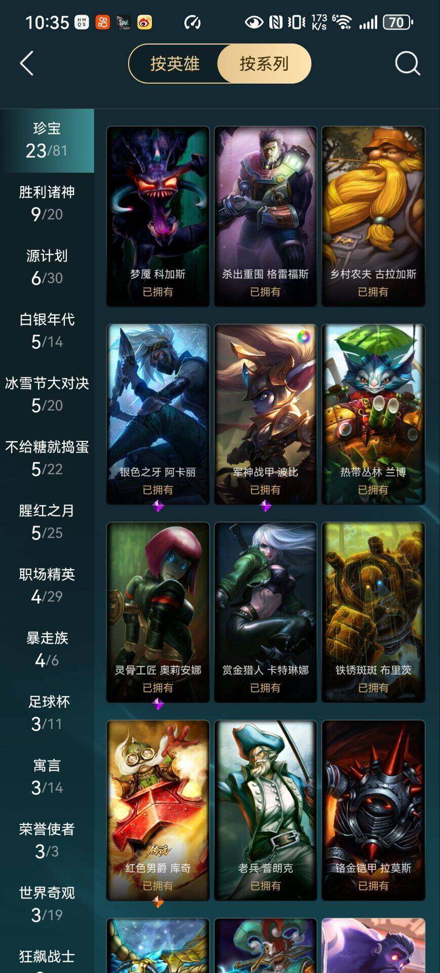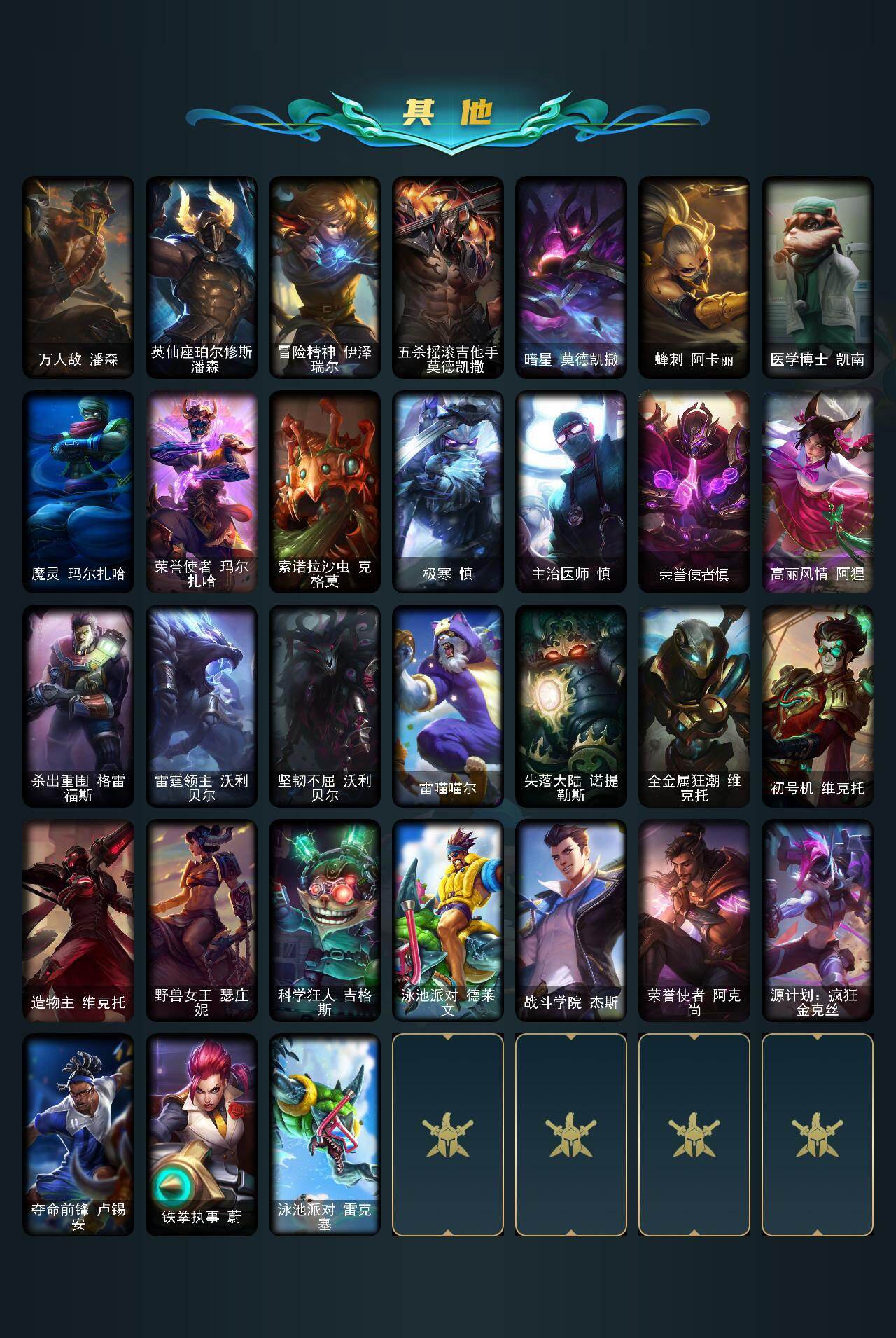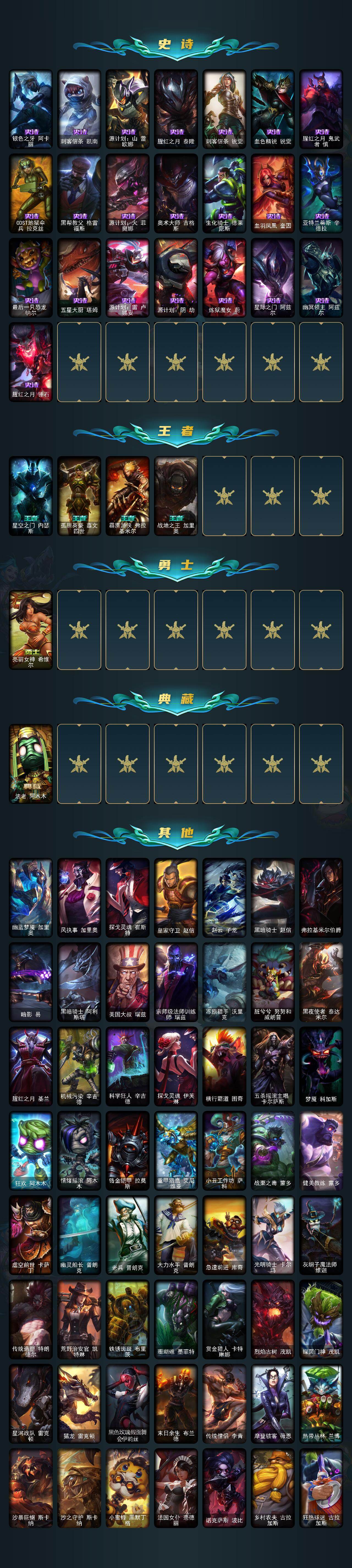 【史诗皮肤】:科学怪熊的新娘安妮,铁钩船长费德提克,圣光审判凯尔,火箭达人崔丝塔娜,荒野豺狼沃里克,法国皇室厄运小姐,紫晶射手艾希,国王泰达米尔,百夫长贾克斯,刀锋女王莫甘娜,黑色荆棘莫甘娜,炼金狂士辛吉德,侏罗纪化石科加斯,战争血统蒙多,海克斯科技迦娜,无畏号墨菲特,枯萎之壤雷克顿,腥红之月伊莉丝,灵骨工匠奥莉安娜,V字仇杀者布兰德,至高之拳李青,地下拳王李青,深海妖姬卡西奥佩娅,法老王朝内瑟斯,军神战甲波比,飞车暴走族古拉加斯,冰川勇者伊泽瑞尔,死亡领主莫德凯撒,银色之牙阿卡丽,刺客信条凯南,源计划山蕾欧娜,腥红之月泰隆,刺客信条锐雯,血色精锐锐雯,腥红之月鬼武者慎,ODST地狱伞兵拉克丝,黑帮教父格雷福斯,源计划火菲奥娜,奥术大师吉格斯,生化骑士德莱厄斯,血羽凤凰奎因,亚特兰蒂斯辛德拉,最后一只恐龙纳尔,五星大厨塔姆,源计划雷卢锡安,源计划阴劫,炼狱魔女蔚,星际之门阿兹尔,幽冥领主阿兹尔,腥红之月锤石