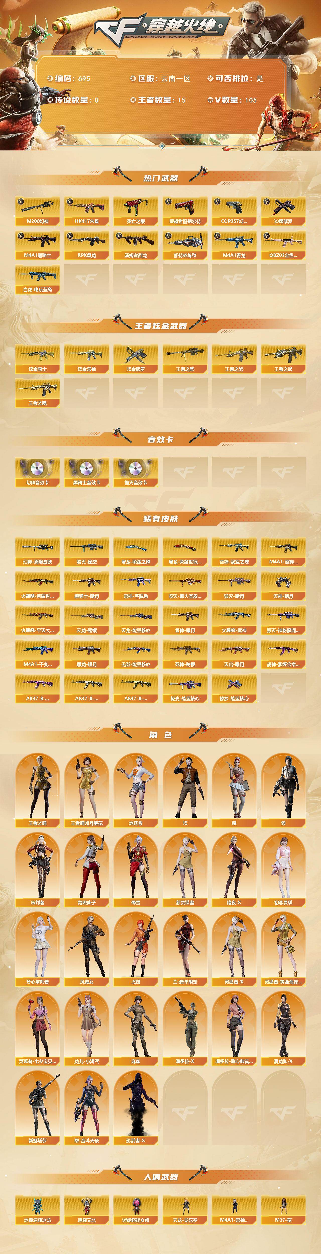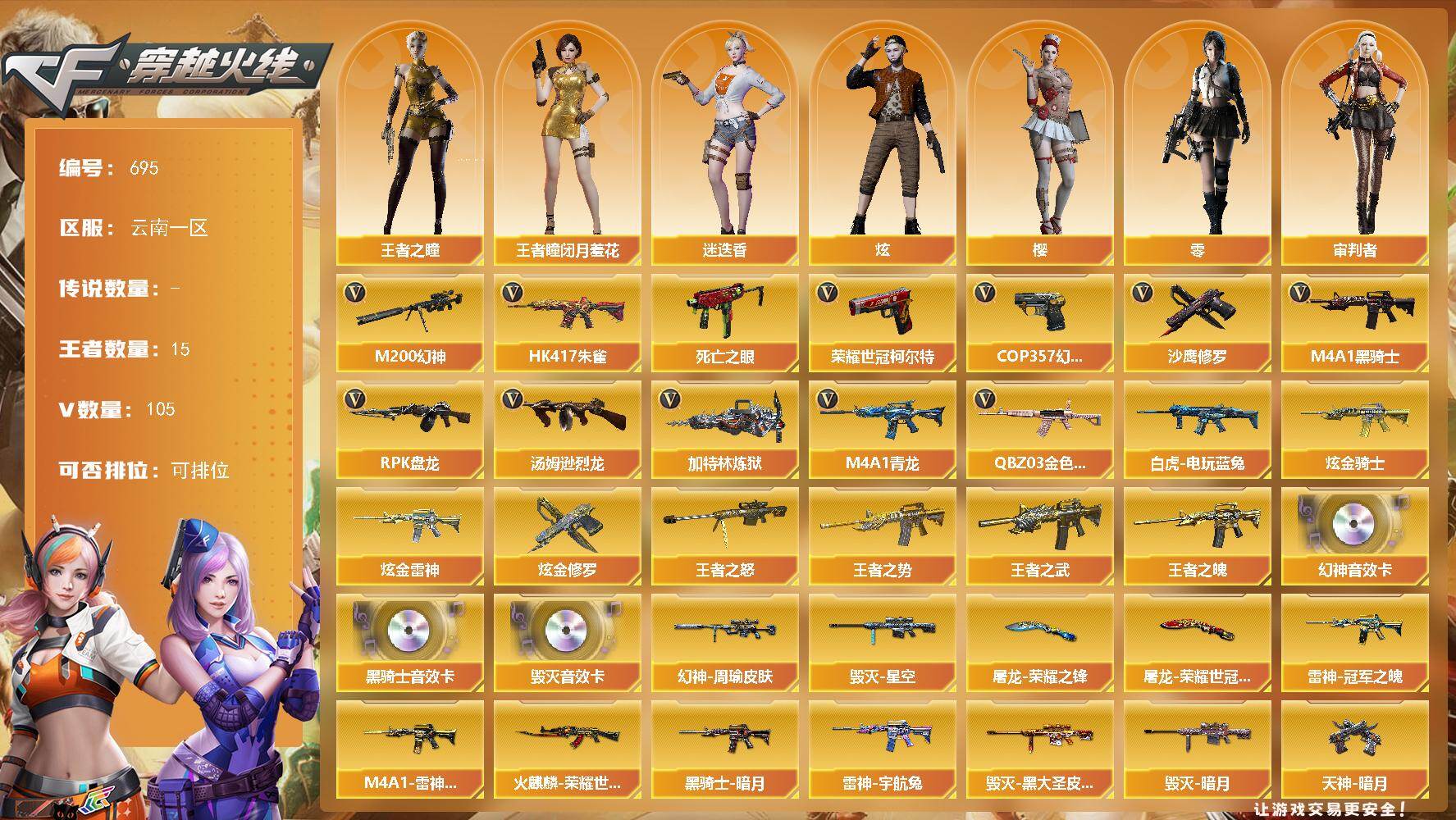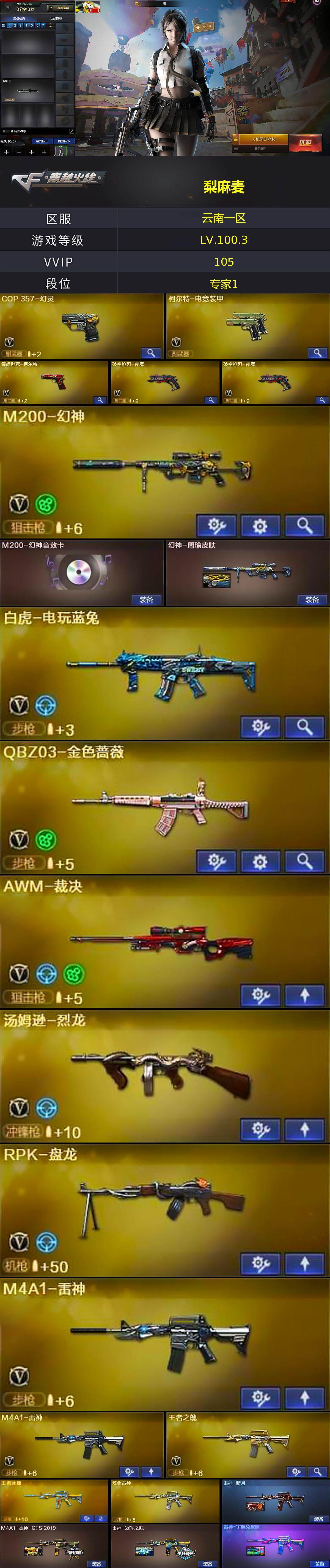 [15383582]云南一区-105V-15王者-3炫金 【热门武器】:QBZ03-金色蔷薇,HK417-朱雀,M4A1-青龙,M200-幻神,死亡之眼*3,白虎-电玩蓝兔,荣耀世冠-柯尔特,M4A1-黑骑士*2,汤姆逊-烈龙,RPK-盘龙,加特林-炼狱,COP 357-幻灵,沙鹰-修罗*2 【王者炫金武器】:王者之势,王者之武,王者之魄,王者之怒,炫金骑士,炫金雷神,炫金修罗 【音效卡】:M200-幻神音效卡,M4A1-黑骑士音效卡,Barrett-毁灭音效卡 【皮肤】:幻神-周瑜皮肤,雷神-暗月,M4A1-雷神-CFS 2019,雷神-冠军之魄,雷神-宇航兔皮肤,火麒麟-雷神,火麒麟-平天大圣,火麒麟-荣耀世冠AG,毁灭-暗月,毁灭-星空,毁灭-黑大圣皮肤,毁灭-神秘黑洞皮肤,M4A1-千变-孔明皮肤,黑龙-暗月,黑骑士-暗月*2,无影-能量核心,死神-秘银,天启-暗月,战神-紫绶金章皮肤,AK47-B-常胜将军-曹操,AK47-B-常胜将军-刘备,AK47-B-常胜将军-孙权,天龙-秘银*2,天龙-能量核心,极光-能量核心,修罗-能量核心,天神-暗月*5,屠龙-荣耀之锋*2,屠龙-荣耀世冠AG 【角色】:零,樱,炫,迷迭香,审判者,王者-瞳-闭月羞花,王者之瞳,暗夜-X,初恋灵狐,芳心审判者,风暴女*2,虎妞,兰-新年限定,灵狐者-X,灵狐者-黄金海岸,灵狐者-七夕宝贝,龙儿-小淘气,麻雀,潘多拉-X,潘多拉-甜心教官,潜龙队-X,青霞仙子,蜀雪,新灵狐者,新娜塔莎,樱-战斗天使,影武者-X 【人偶武器】:天龙-曼陀罗,M4A1-雷神-精英刀锋,M37-葵,COP-旗袍,迷你深渊冰龙,迷你裂空之翼*3,迷你牛魔王,夺魂,迷你牛牛,深渊终结者手雷,闪光弹-小乔,闪光弹-貂蝉,高爆手雷-大乔,迷你艾比,迷你超能女侍 【暴走生化】:死亡之眼*3,超级对讲机 【挑战大师】:神圣爆裂者III,AK47-冰龙粉碎者,冰龙粉碎者-白马银枪,激光毁灭者III-白马银枪,VEPR-12-金魔,激光毁灭者III,神圣爆裂者-末日III,阐释者III 【英雄级武器】:M4A1-千变,AK47-火麒麟*2,M4A1-黑龙,M4A1-雷神*2,M4A1-黑骑士*2,AK47-无影,M4A1-死神*3,AK47-黑武士,AK12-天启*2,M4A1-武圣,AK47-机械迷城,AK47-黑鲨,M4A1-龙血
