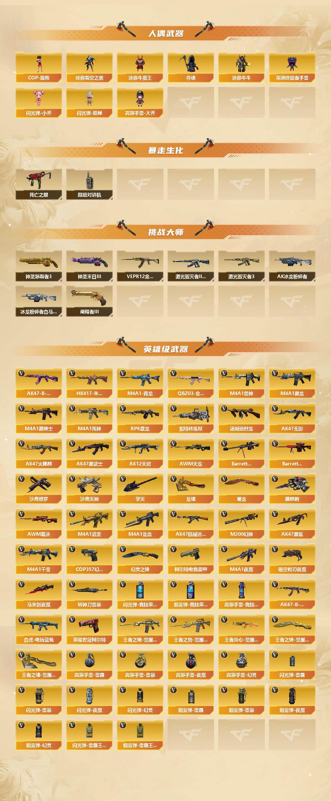 【英雄级武器】:M4A1-千变,AK47-火麒麟*2,M4A1-黑龙,M4A1-雷神*2,M4A1-黑骑士*2,AK47-无影,M4A1-死神*3,AK47-黑武士,AK12-天启*2,M4A1-武圣,AK47-机械迷城,AK47-黑鲨,M4A1-龙血