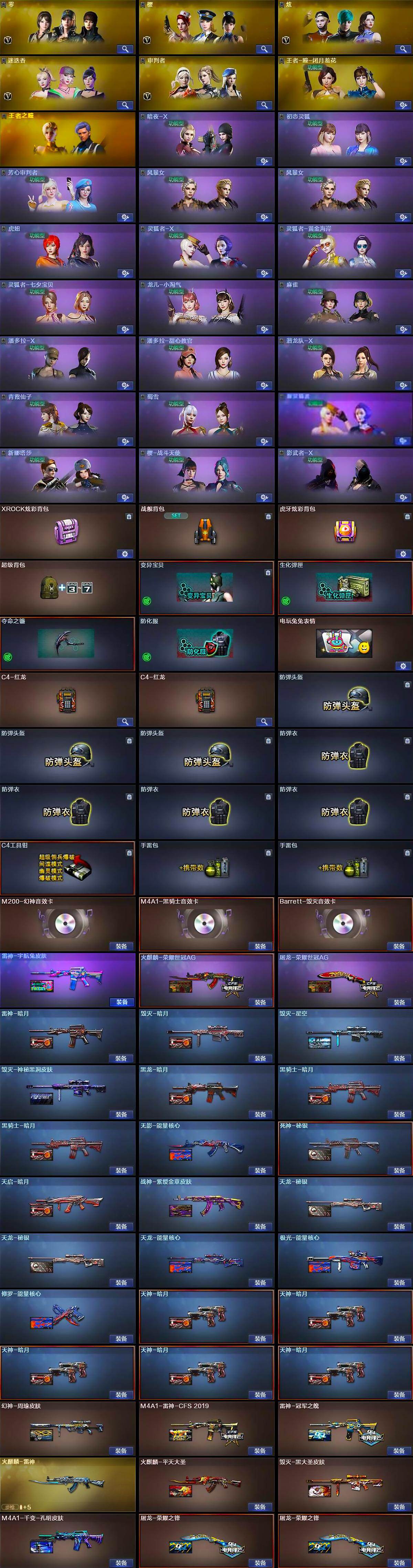 【皮肤】:幻神-周瑜皮肤,雷神-暗月,M4A1-雷神-CFS 2019,雷神-冠军之魄,雷神-宇航兔皮肤,火麒麟-雷神,火麒麟-平天大圣,火麒麟-荣耀世冠AG,毁灭-暗月,毁灭-星空,毁灭-黑大圣皮肤,毁灭-神秘黑洞皮肤,M4A1-千变-孔明皮肤,黑龙-暗月,黑骑士-暗月*2,无影-能量核心,死神-秘银,天启-暗月,战神-紫绶金章皮肤,AK47-B-常胜将军-曹操,AK47-B-常胜将军-刘备,AK47-B-常胜将军-孙权,天龙-秘银*2,天龙-能量核心,极光-能量核心,修罗-能量核心,天神-暗月*5,屠龙-荣耀之锋*2,屠龙-荣耀世冠AG