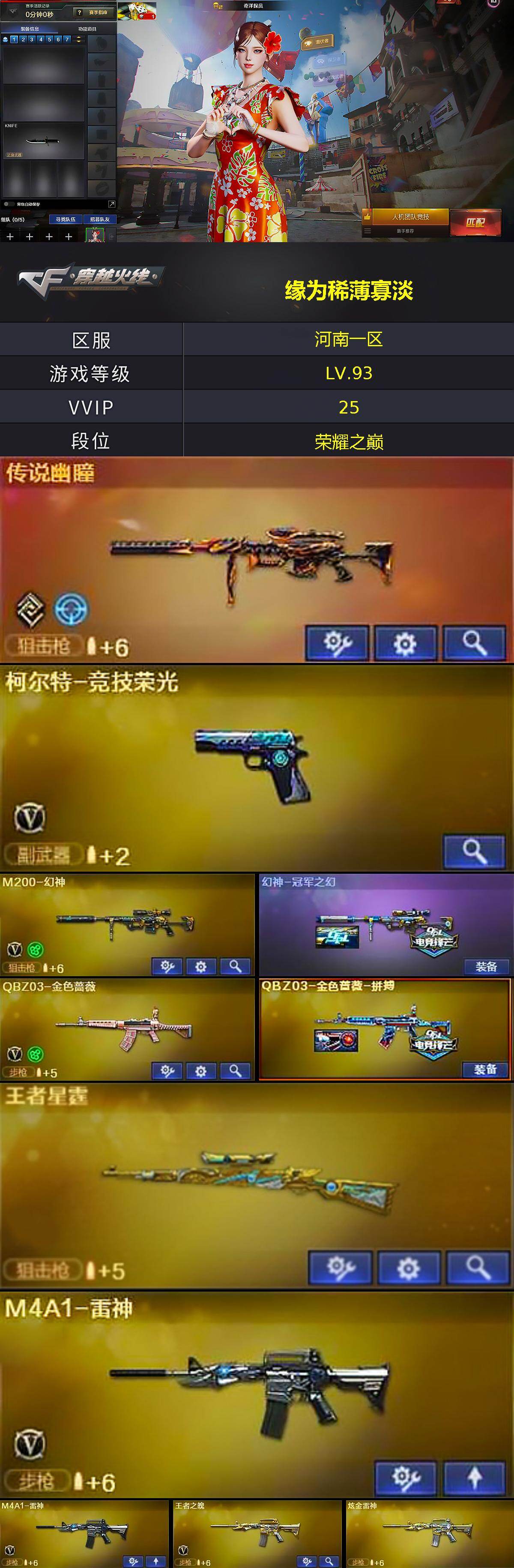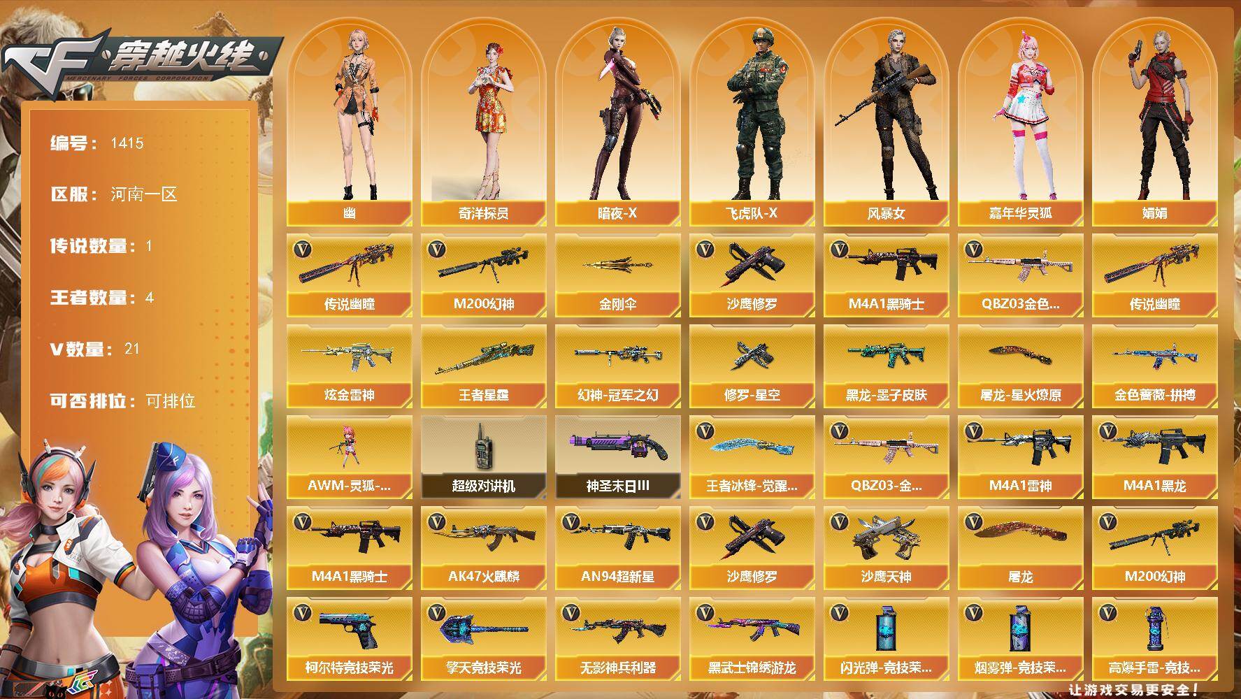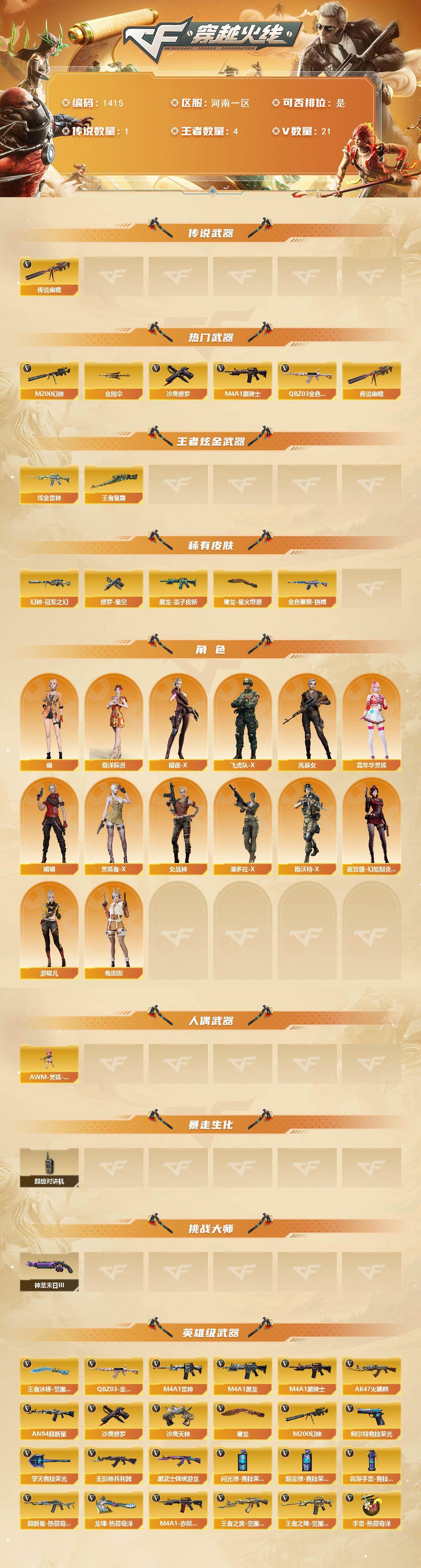 [15383773]河南一区-21V-4王者-1炫金 【传说武器】:传说幽瞳 【热门武器】:传说幽瞳,QBZ03-金色蔷薇,M200-幻神,M4A1-黑骑士,沙鹰-修罗,金刚伞 【王者炫金武器】:王者星霆,炫金雷神 【皮肤】:幻神-冠军之幻,QBZ03-金色蔷薇-拼搏,黑龙-墨子皮肤,修罗-星空,屠龙-星火燎原 【角色】:奇洋探员,暗夜-X,飞虎队-X,风暴女,嘉年华灵狐,娟娟,灵狐者-X,女战神,潘多拉-X,斯