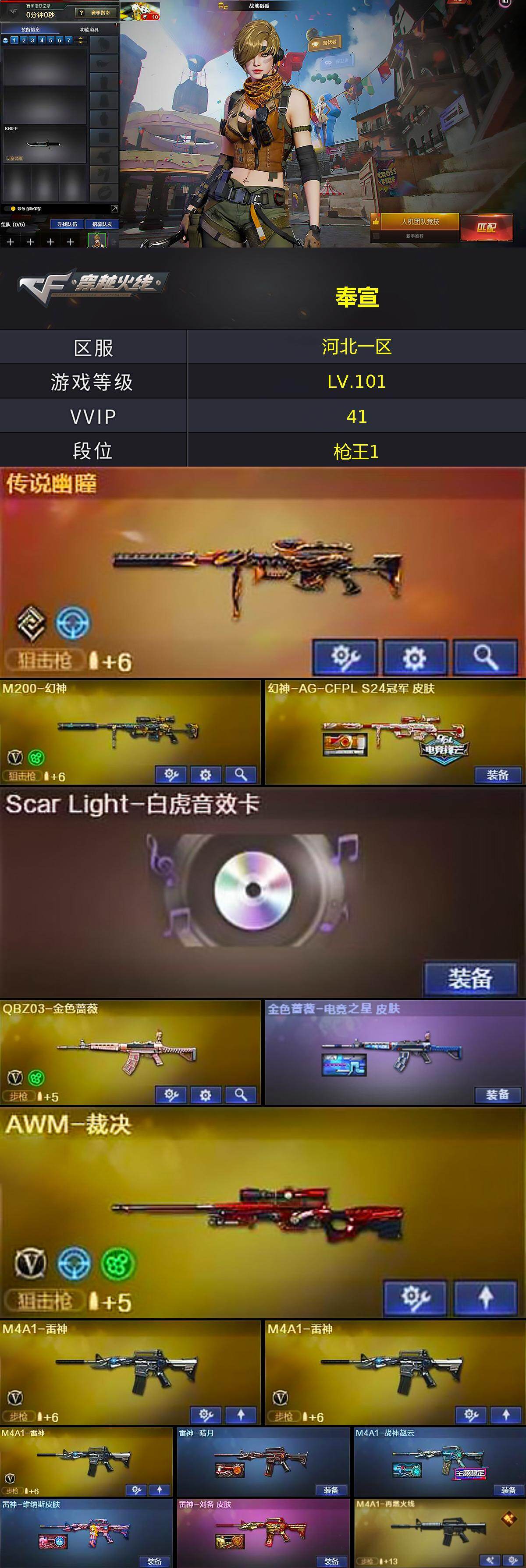 【音效卡】:M4A1-黑骑士音效卡,Scar Light-白虎音效卡,M14EBR-玄武音效卡,炼狱-百战金芒-庆典舞曲音效卡,死神-雪域霜狐-怀旧音效卡
