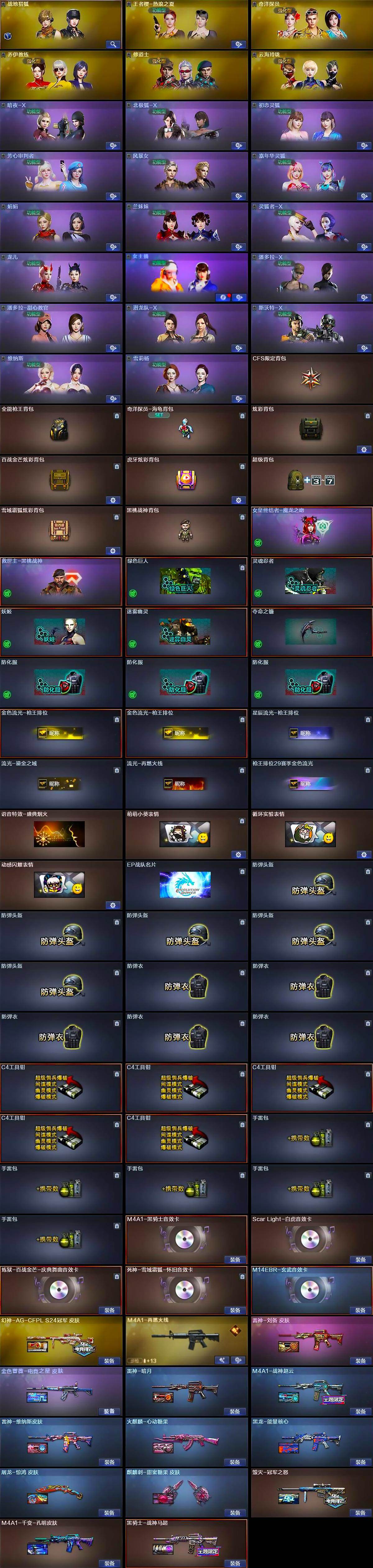 【道具】:CFS限定背包,全能枪王背包,奇洋探员-海龟背包,炫彩背包,百战金芒炫彩背包,虎牙炫彩背包,超级背包,雪域霜狐炫彩背包,黑桃战神背包,哔哩哔哩名片,女皇终结
