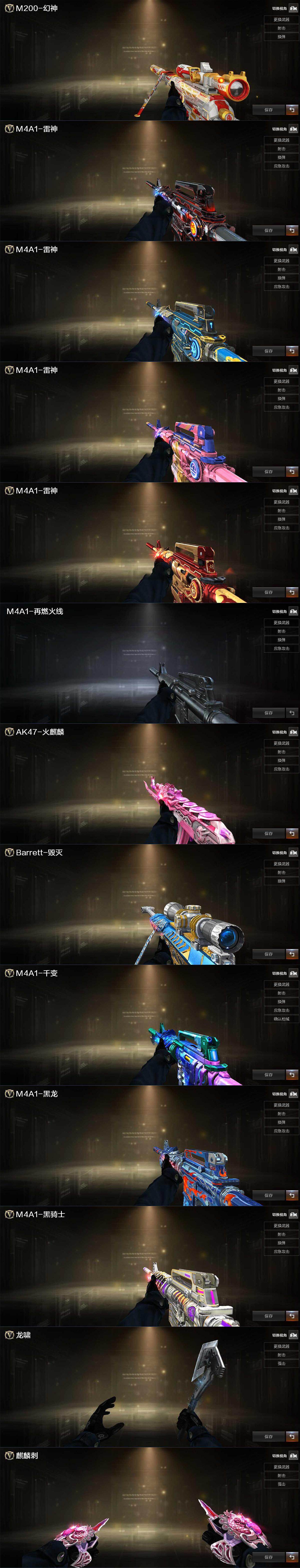 【英雄级武器】:AK47-火麒麟*2,M4A1-雷神*3,M4A1-黑骑士,AK47-机械迷城,无影-神兵利器,M4A1-玫瑰精灵,QBZ03-金色蔷薇,烈火-动感闪耀,王者之影-觉醒版,王者猎神-觉醒版,Barrett-毁灭,AWM-裁决,M200-幻神,炼狱-百战金芒,天神-动感闪耀,屠龙,龙啸,擎天,幻灵之锋,屠龙-动感闪耀,麒麟刺-百战金芒,高爆手雷-幻灵,手雷-动感闪耀,闪光弹-幻灵,烟雾弹-幻灵*2,M4A1-赤狱骑士