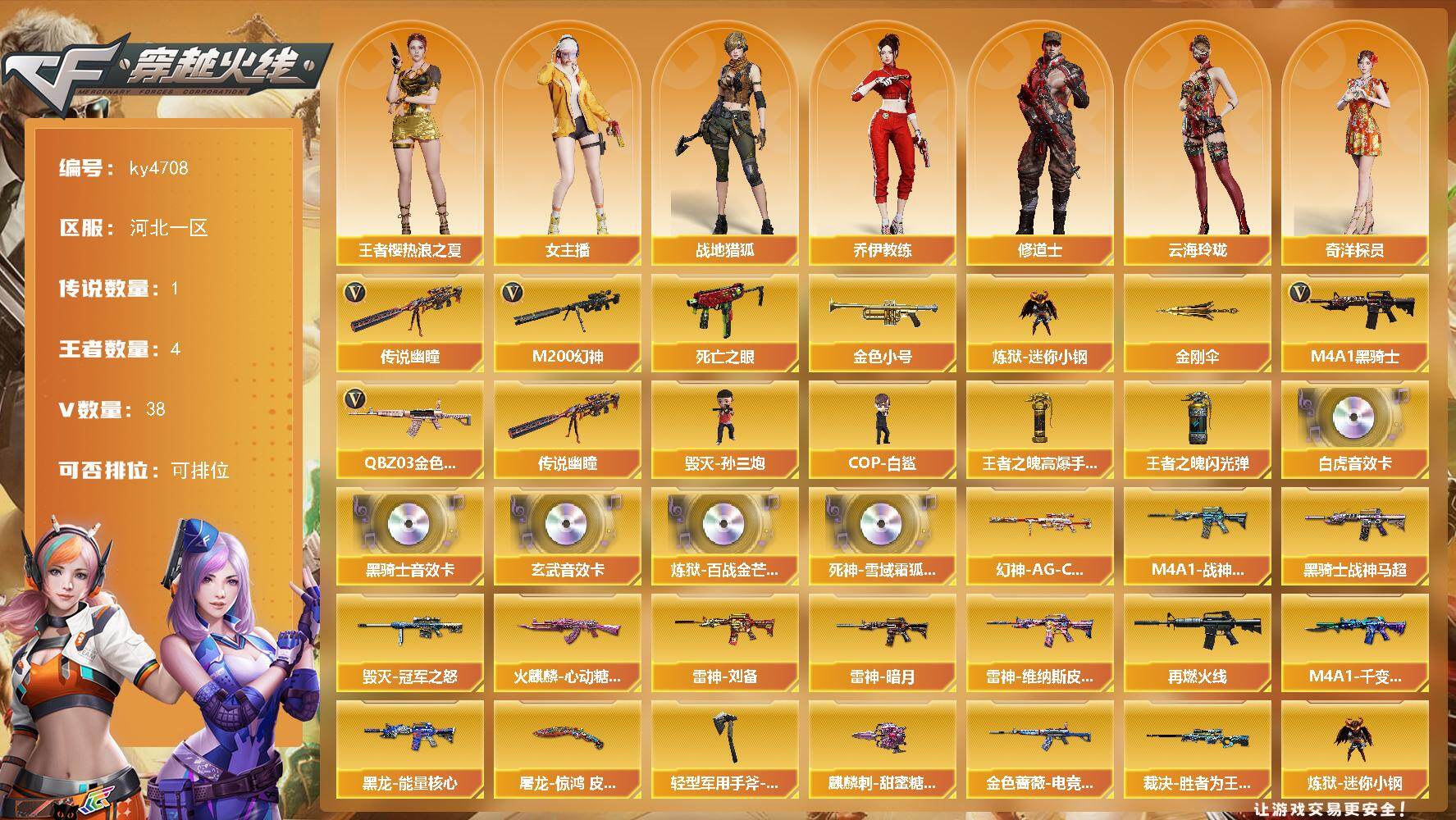 [15386048]河北一区-38V-4王者-0炫金 【传说武器】:传说幽瞳 【热门武器】:传说幽瞳,QBZ03-金色蔷薇,M200-幻神,死亡之眼*2,金色小号,炼狱-迷你小钢,M4A1-黑骑士,毁灭-孙三炮,COP-白鲨,金刚伞 【王者炫金武器】:王者之魄高爆手雷,王者之魄闪光弹 【音效卡】:M4A1-黑骑士音效卡,Scar Light-白虎音效卡,M14EBR-玄武音效卡,炼狱-百战金芒-庆典舞曲音效卡,死神-雪域霜狐-怀旧音效卡 【皮肤】:幻神-AG-CFPL S24冠军 皮肤,金色蔷薇-电竞之星 皮肤,裁决-胜者为王 皮肤,雷神-暗月,M4A1-战神赵云,雷神-维纳斯皮肤,雷神-刘备 皮肤,M4A1-再燃火线,火麒麟-心动糖果,毁灭-冠军之怒,M4A1-千变-孔明皮肤,黑龙-能量核心,黑骑士-战神马超,屠龙-惊鸿 皮肤,轻型军用手斧-再燃火线,麒麟刺-甜蜜糖果 皮肤 【角色】:战地猎狐,王者樱-热浪之夏,奇洋探员,乔伊教练,修道士,云海玲珑,暗夜-X,北极狐-X,初恋灵狐,芳心审判者,风暴女,嘉年华灵狐,娟娟,兰妹妹,灵狐者-X,龙儿,女主播,潘多拉-X,潘多拉-甜心教官,潜龙队-X,斯沃特-X,兔囡囡,维纳斯,雪莉杨 【人偶武器】:COP-白鲨,毁灭-孙三炮,炼狱-迷你小钢,Scar Light-马枪,AWM-灵狐-15周年嘉年华,迷你波特博士,夺魂,迷你牛牛,生化手雷-机甲核心*2,深渊终结者手雷,迷你艾比,迷你巨石泰坦-魔花研究所 【暴走生化】:KAC-狂怒咆哮,黑龙吞噬者,双面神,死亡之眼*2,超级对讲机 【挑战大师】:激光毁灭者III,神圣爆裂者-末日III,阐释者III 【英雄级武器】:AK47-火麒麟*2,M4A1-雷神*3,M4A1-黑骑士,AK47-机械迷城,无影-神兵利器,M4A1-玫瑰精灵,QBZ03-金色蔷薇,烈火-动感闪耀,王者之影-觉醒版,王者猎神-觉醒版,Barrett-毁灭,AWM-裁决,M200-幻神,炼狱-百战金芒,天神-动感闪耀,屠龙,龙啸,擎天,幻灵之锋,屠龙-动感闪耀,麒麟刺-百战金芒,高爆手雷-幻灵,手雷-动感闪耀,闪光弹-幻灵,烟雾弹-幻灵*2,M4A1-赤狱骑士 【道具】:CFS限定背包,全能枪王背包,奇洋探员-海龟背包,炫彩背包,百战金芒炫彩背包,虎牙炫彩背包,超级背包,雪域霜狐炫彩背包,黑桃战神背包,哔哩哔哩名片,女皇终结