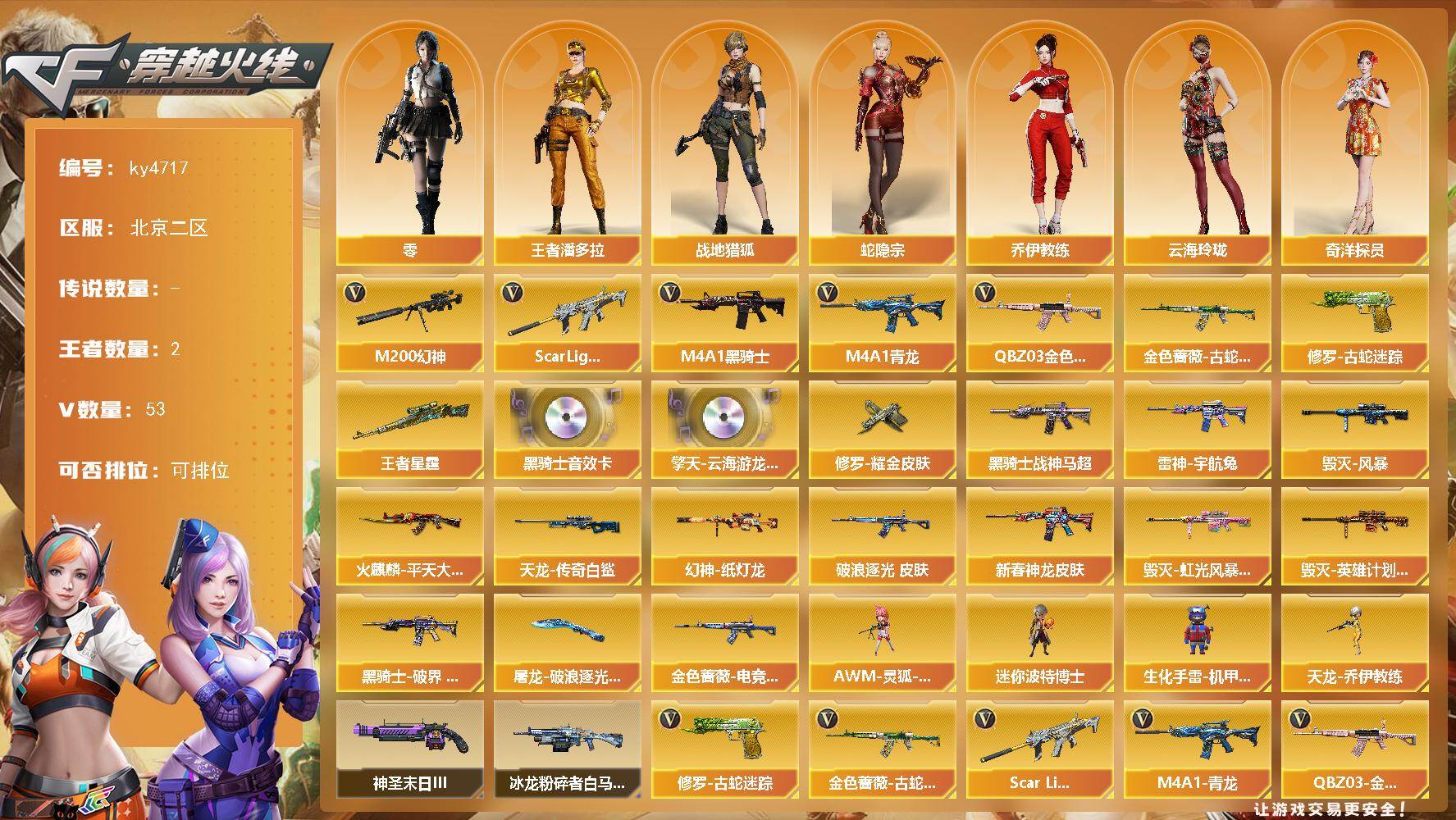 [15386285]北京二区-53V-2王者-0炫金 【热门武器】:QBZ03-金色蔷薇,Scar Light-白虎,M4A1-青龙,M200-幻神,金色蔷薇-古蛇迷踪,修罗-古蛇迷踪,M4A1-黑骑士 【王者炫金武器】:王者星霆 【音效卡】:擎天-云海游龙音效卡,M4A1-黑骑士音效卡 【皮肤】:幻神-纸灯龙皮肤,金色蔷薇-破浪逐光 皮肤,金色蔷薇-电竞之星 皮肤,雷神-宇航兔皮肤,M4A1-雷神-新春神龙皮肤,火麒麟-平天大圣,毁灭-风暴,毁灭-虹光风暴 皮肤,毁灭-英雄计划 皮肤,黑骑士-战神马超,黑骑士-破界 皮肤,AWM-天龙-传奇白鲨,修罗耀金皮肤,屠龙-破浪逐光 皮肤 【角色】:零,战地猎狐,王者潘多拉,蛇隐宗,奇洋探员,乔伊教练,云海玲珑,电竞少女,飞虎队-X,风暴女,嘉年华灵狐,兰妹妹,猎狐者-追月,0号玩家,灵狐者-X,灵狐者-七夕宝贝,潘多拉-甜心教官,蛇姬,斯沃特-X,新娜塔莎,樱-战斗天使,游珑儿 【人偶武器】:天龙-乔伊教练,AWM-灵狐-15周年嘉年华,迷你波特博士,生化手雷-机甲核心 【挑战大师】:冰龙粉碎者-白马银枪*2,神圣爆裂者-末日III 【英雄级武器】:AK47-火麒麟,M4A1-雷神,M4A1-黑骑士,AK12-天启,M4A1-青龙,Scar Light-白虎,无影-神兵利器,黑武士-锦绣游龙,超新星-热带奇洋,金色蔷薇-古蛇迷踪,QBZ03-金色蔷薇,烈火-动感闪耀,王者之武-觉醒版,AK-47-猩红传说,Barrett-毁灭,AWM-裁决,M200-幻神,沙鹰-天神,COP 357-云龙,USP-神工天巧,天神-动感闪耀,修罗-古蛇迷踪,屠龙,擎天*3,擎天-竞技荣光,屠龙-动感闪耀,擎天-云海游龙,龙啸-热带奇洋,高爆手雷-雷霆,高爆手雷-竞技荣光,高爆手雷-神工天巧*4,手雷-动感闪耀,手雷-云海游龙,手雷-热带奇洋,高爆手雷-古蛇迷踪,闪光弹-雷霆*2,闪光弹-幻灵,闪光弹-竞技荣光,闪光弹-神工天巧*3,烟雾弹-雷霆,烟雾弹-竞技荣光,烟雾弹-神工天巧*3,烟雾弹-云龙,烟雾弹-古蛇迷踪,M4A1-赤狱骑士 【道具】:CFS限定背包,云山科技背包,亚洲杯纪念炫彩背包,全能枪王背包,古蛇迷踪炫彩背包,奇洋探员-海龟背包,热带奇洋炫彩背包,超级背包,救世主-黑桃战神,绿色巨人,灵魂忍者*2,变异宝贝,迷雾幽灵*2,夺命之镰,防化服*
