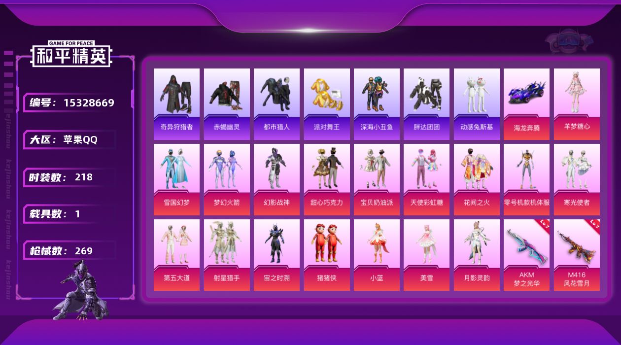 - PX_2056821- 苹果手Q-18王牌印记-7粉装-4特效枪-1载具-110801热力值-265套装-343枪皮-0卓越印记-0传奇印记 【7粉装】,缤纷油彩,第五大道,雪月幻音,金曜白虎,暗夜玫瑰,炫光之旅,创世·救赎 【4特效枪】AKM-炫紫旋律-7级 M416-五爪金龙-7级 AUG-暖羊咩咩-5级 Kar98K-巳巳如意-5级 【7稀有紫装】,奇异狩猎者,暗影哥特,浪漫天命,雪山精英