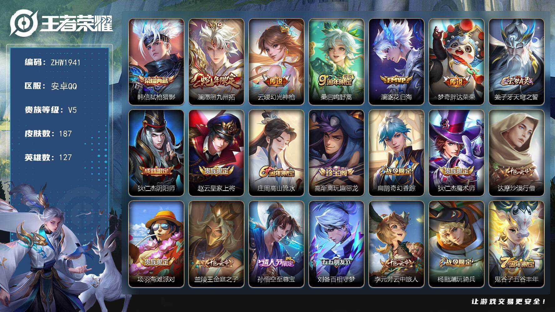 [15156311]可二次【店主推荐捡漏号!可直接换绑】安卓Q-V5-至尊星耀III段位-127英雄-187皮肤-1典藏皮肤-5传说-54史诗 【荣耀典藏】:韩信弑枪猎影 【传说皮肤】:澜愿照九州拓,云缨幻光神枪,桑启鸣野蒿,澜逐花归海,梦奇胖达荣荣 【限定皮肤】:姜子牙天穹之誓,狄仁杰阴阳师,赵云皇家上将,庄周高山流水,高渐离玩趣恶龙,扁鹊奇幻香踪,狄仁杰魔术师,达摩沙漠行僧,项羽海滩派对,兰陵王金庭之子,孙悟空至尊宝,刘备百相守梦,李元芳云中旅人,杨戬潮玩骑兵,鬼谷子五谷丰年,苏烈千军破阵,梦奇顽趣,沈梦溪大漠名商,裴擒虎李小龙,裴擒虎擒涛扼浪,云中君纤云弄巧,嫦娥拒霜思,鲁班大师探海日志,桑启海盐诗旅,艾琳女武神,阿古朵江河有灵,张良古海寻踪,蒙犽百解令,鬼谷子天穹祈灯,伽罗琥珀纪元,大乔乘龙忆丹青,沈梦溪龙舞盛年,鲁班七号蔬乡物语,李元芳蔬乡物语,刘邦剑破天穹,上官婉儿群星魔术团,程咬金群星魔术团,镜青焰无极,项羽苍威无极,刘备异域游侠,芈月浮光幕影 【年限皮肤】:大乔乘龙忆丹青 【赛季限定】:达摩沙漠行僧,兰陵王金庭之子,张良古海寻踪,李元芳云中旅人,苏烈千军破阵,梦奇顽趣,沈梦溪大漠名商,裴擒虎擒涛扼浪,鲁班大师探海日志,桑启海盐诗旅,鬼谷子天穹祈灯,刘邦剑破天穹,姜子牙天穹之誓 【战令限定】:扁鹊奇幻香踪,杨戬潮玩骑兵,鲁班七号蔬乡物语,李元芳蔬乡物语,镜青焰无极,项羽苍威无极 【史诗皮肤】:露娜紫霞仙子,阿轲暗夜猫娘,赵云皇家上将,赵云未来纪元,貂蝉圣诞恋歌,甄姬冰雪圆舞曲,王昭君偶像歌手,狄仁杰魔术师,宫本武藏鬼剑武藏,孙尚香水果甜心,嬴政摇滚巨星,妲己魅力维加斯,妲己女仆咖啡,墨子金属风暴,吕布圣诞狂欢,刘禅绅士熊喵,张飞乱世虎臣,孙悟空至尊宝,花木兰水晶猎龙者,夏侯惇乘风破浪,小乔缤纷独角兽,兰陵王暗隐猎兽者,诸葛亮黄金分割率,雅典娜冰冠公主,百里守约特工魅影,铠曙光守护者,蔡文姬舞动绿茵,刘禅天才门将,阿轲节奏热浪,孙策猫狗日记,大乔猫狗日记,狄仁杰鹰眼统帅,娜可露露晚萤,裴擒虎李小龙,云中君纤云弄巧,百里玄策热力回旋,庄周高山流水,嫦娥拒霜思,鬼谷子五谷丰年,梦奇顽趣,扁鹊奇幻香踪,刘备百相守梦,阿古朵江河有灵,蒙犽百解令,伽罗琥珀纪元,大乔乘龙忆丹青,鲁班七号蔬乡物语,上官婉儿群星魔术团,镜青焰无极,黄忠怒海争锋,芈月浮光幕影,阿轲化蝶舞,黄忠百相守梦,公