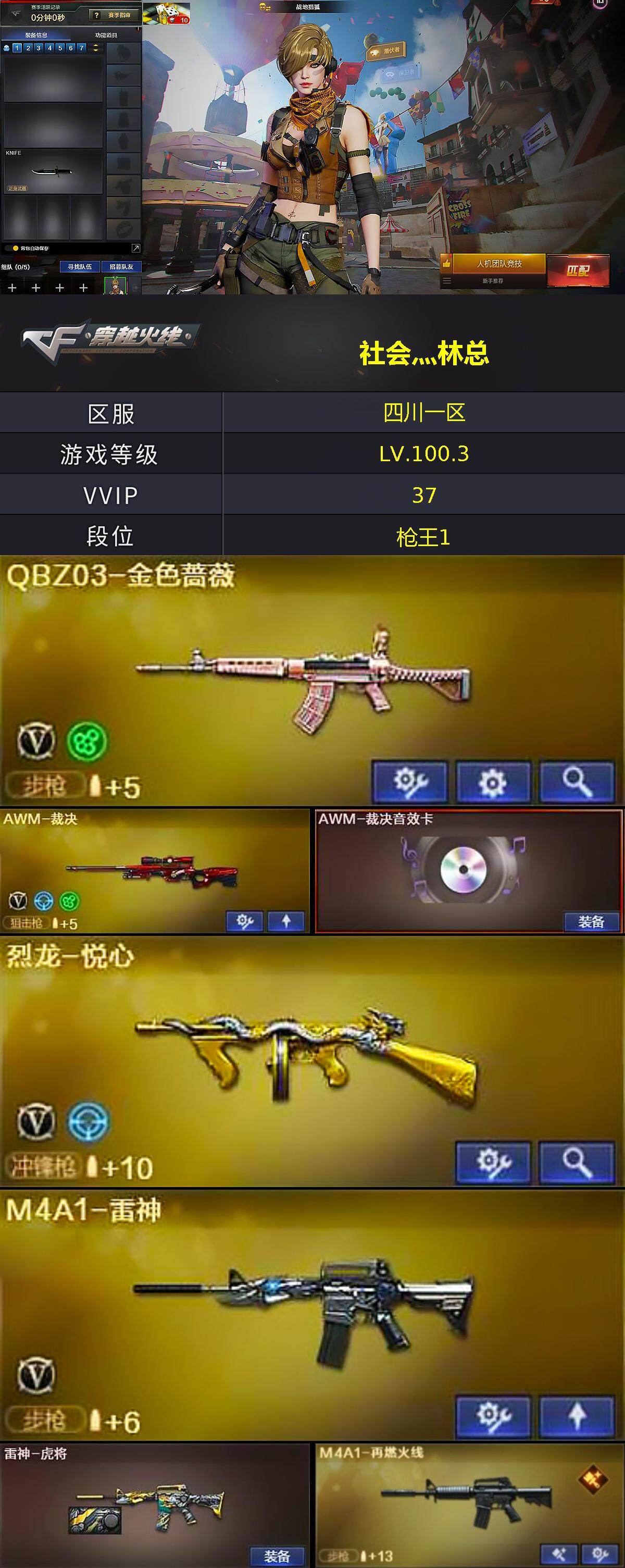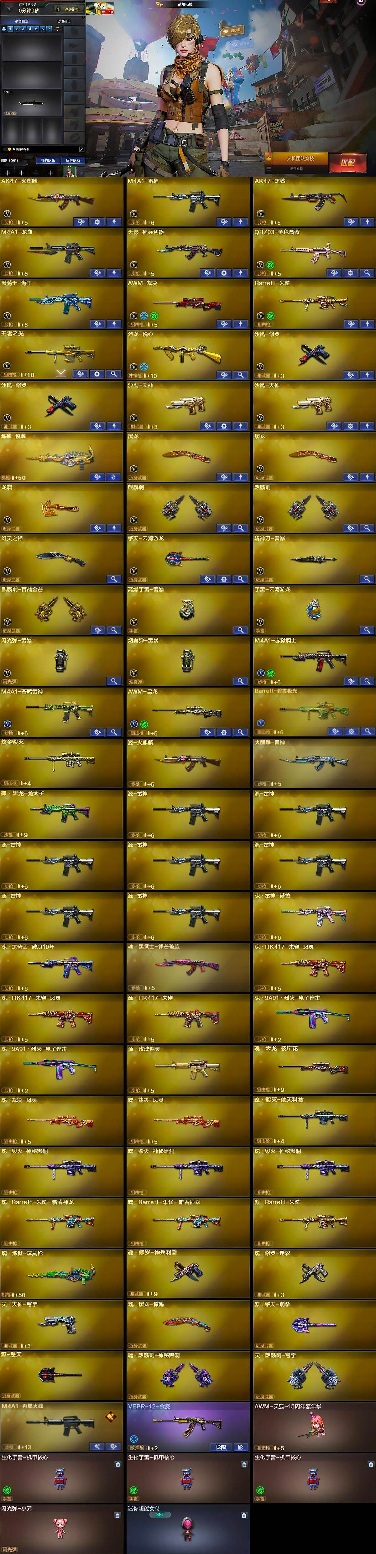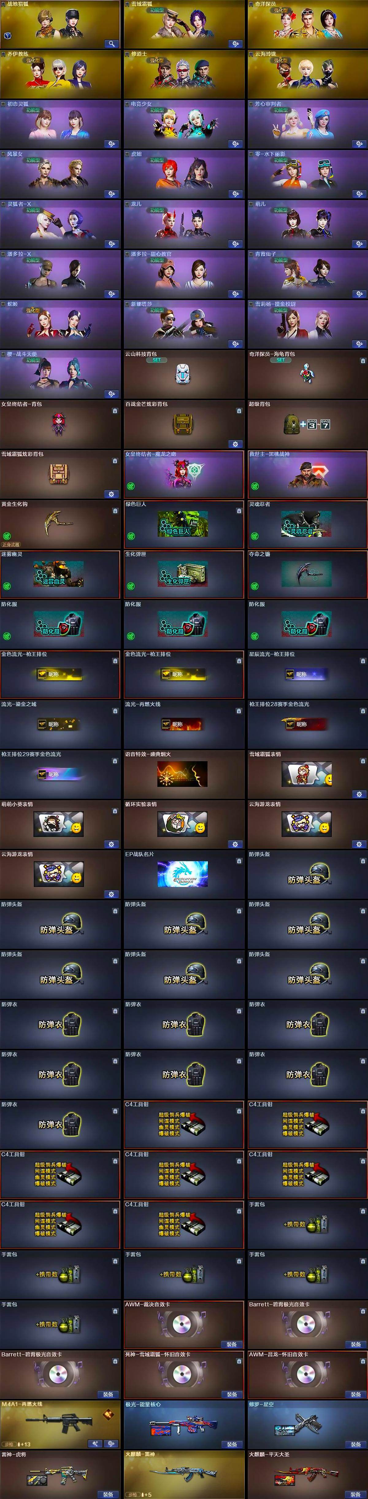 [15386916]四川一区-36V-3王者-1炫金 【热门武器】:QBZ03-金色蔷薇,沙鹰-修罗*2 【王者炫金武器】:炼狱-悦蓝,炫金毁灭 【音效卡】:Barrett-碧霄极光音效卡*2,死神-雪域霜狐-怀旧音效卡,AWM-昌龙-怀旧音效卡 【皮肤】:雷神-虎将,M4A1-再燃火线,火麒麟-雷神,火麒麟-平天大圣,极光-能量核心,修罗-星空,轻型军用手斧-再燃火线 【角色】:战地猎狐,雪域霜狐,奇洋探员,乔伊教练,修道士,云海玲珑,初恋灵狐,电竞少女,芳心审判者,风暴女,虎妞,零-水下丽影,灵狐者-X,龙儿,萌儿,潘多拉-X,潘多拉-甜心教官,青霞仙子,蛇姬,兔囡囡,新娜塔莎,雪莉杨-摸金校尉,樱-战斗天使 【人偶武器】:AWM-灵狐-15周年嘉年华,生化手雷-机甲核心*3,闪光弹-小乔,迷你超能女侍,灵狐娃娃手雷 【挑战大师】:VEPR-12-金魔 【英雄级武器】:AK47-火麒麟,M4A1-雷神,AK47-黑鲨,M4A1-龙血,无影-神兵利器,QBZ03-金色蔷薇,黑骑士-海王,AWM-裁决,Barrett-朱雀,王者之光-觉醒版,烈龙-悦心-觉醒版,沙鹰-修罗*2,沙鹰-天神*2,屠龙*2,龙啸,麒麟刺*2,幻灵之锋,擎天-云海游龙,斩神刀-雷暴,麒麟刺-百战金芒,高爆手雷-雷暴,手雷-云海游龙,闪光弹-雷暴,烟雾弹-雷暴,M4A1-赤狱骑士,M4A1-苍鸣雷神,AWM-昌龙,Barrett-碧霄极光 【道具】:云山科技背包,奇洋探员-海龟背包,女皇终结者-背包,百战金芒炫彩背包,超级背包,雪域霜狐炫彩背包,哔哩哔哩名片,女皇终结者-魔龙之吻,救世主-黑桃战神,黄金生化钩,绿色巨人,灵魂忍者,迷雾幽灵,生化弹匣,夺命之镰,防化服*3,金色流光-枪王排位*2,星辰流光-枪王排位,流光-鎏金之域,流光-再燃火线,枪王排位28赛季金色流光,枪王排位29赛季金色流光,语音特效-盛典烟火,雪域霜狐表情,萌萌小葵表情,循环实验表情,云海游龙表情*2,EP战队名片,防弹头盔*7,防弹衣*7,C4工具钳*7,手雷包*5 【特殊枪械】:
