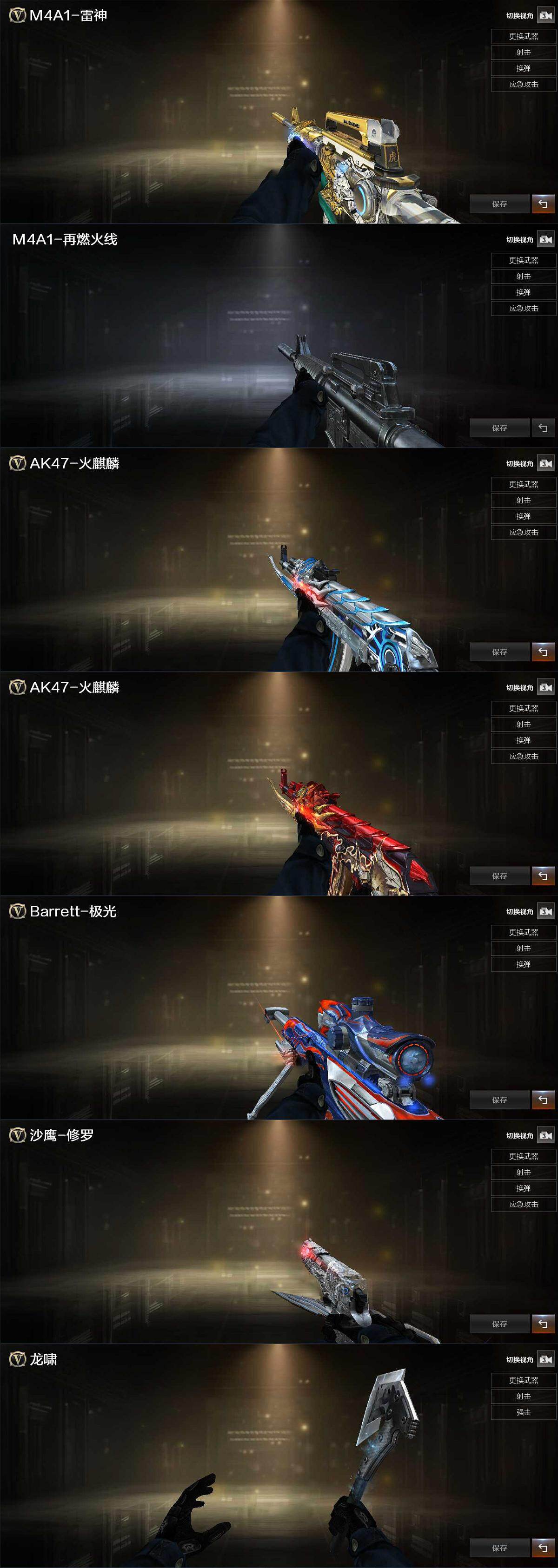 【英雄级武器】:AK47-火麒麟,M4A1-雷神,AK47-黑鲨,M4A1-龙血,无影-神兵利器,QBZ03-金色蔷薇,黑骑士-海王,AWM-裁决,Barrett-朱雀,王者之光-觉醒版,烈龙-悦心-觉醒版,沙鹰-修罗*2,沙鹰-天神*2,屠龙*2,龙啸,麒麟刺*2,幻灵之锋,擎天-云海游龙,斩神刀-雷暴,麒麟刺-百战金芒,高爆手雷-雷暴,手雷-云海游龙,闪光弹-雷暴,烟雾弹-雷暴,M4A1-赤狱骑士,M4A1-苍鸣雷神,AWM-昌龙,Barrett-碧霄极光