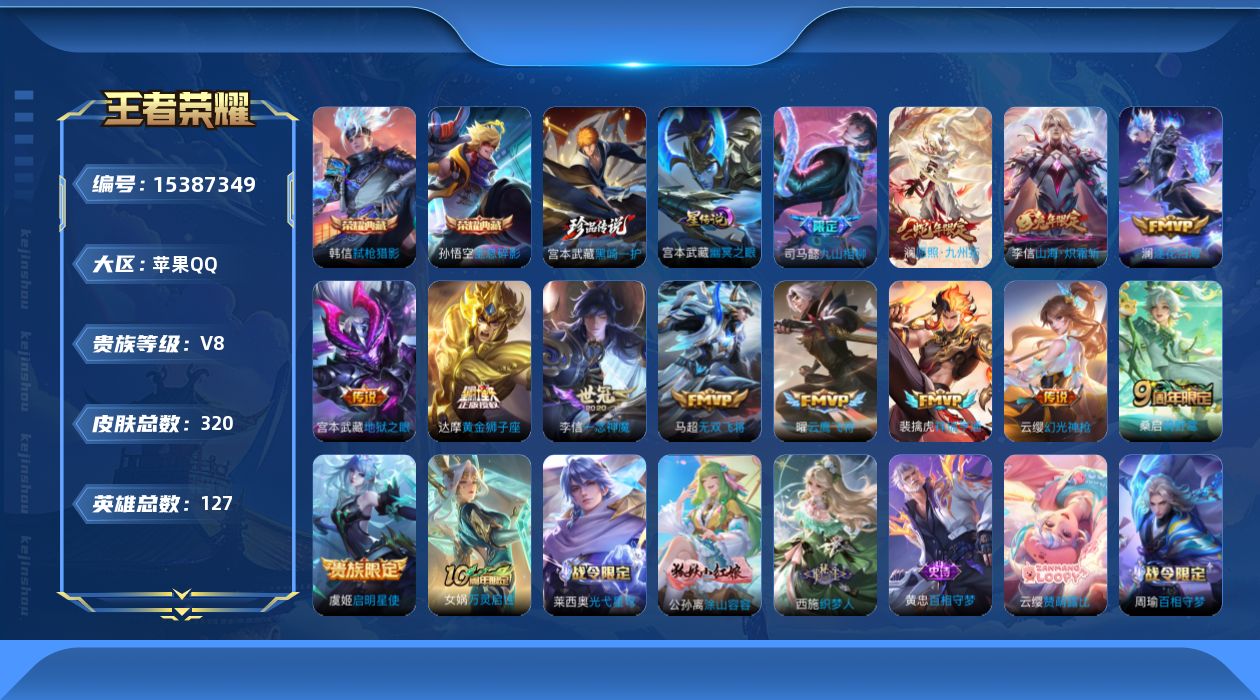 [15387349]【特价出售/店主推荐】4金标 苹果Q-V8-最强王者段位-127英雄-320皮肤-2典藏皮肤-1珍品传说-14传说-98史诗-1星元