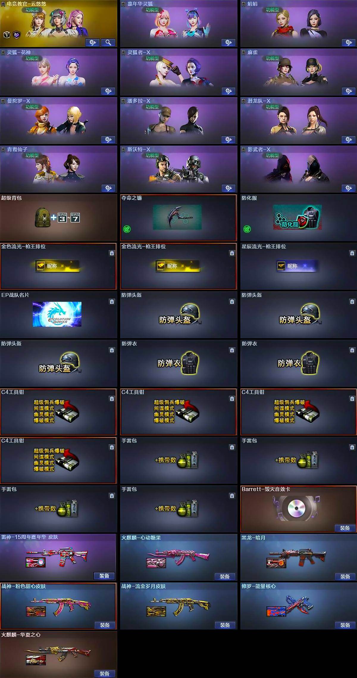 【道具】:超级背包,夺命之镰,防化服,金色流光-枪王排位*2,星辰流光-枪王排位,EP战队名片,防弹头盔*3,防弹衣*2,C4工具钳*4,手雷包*4