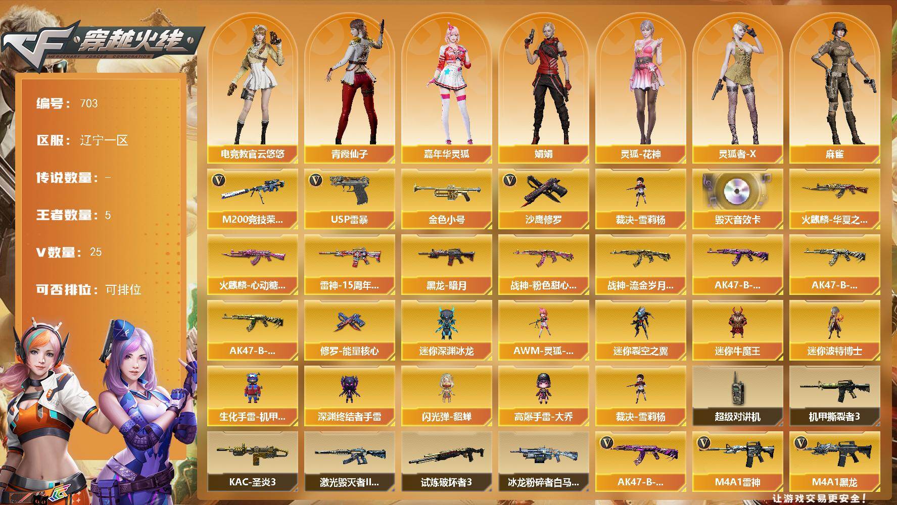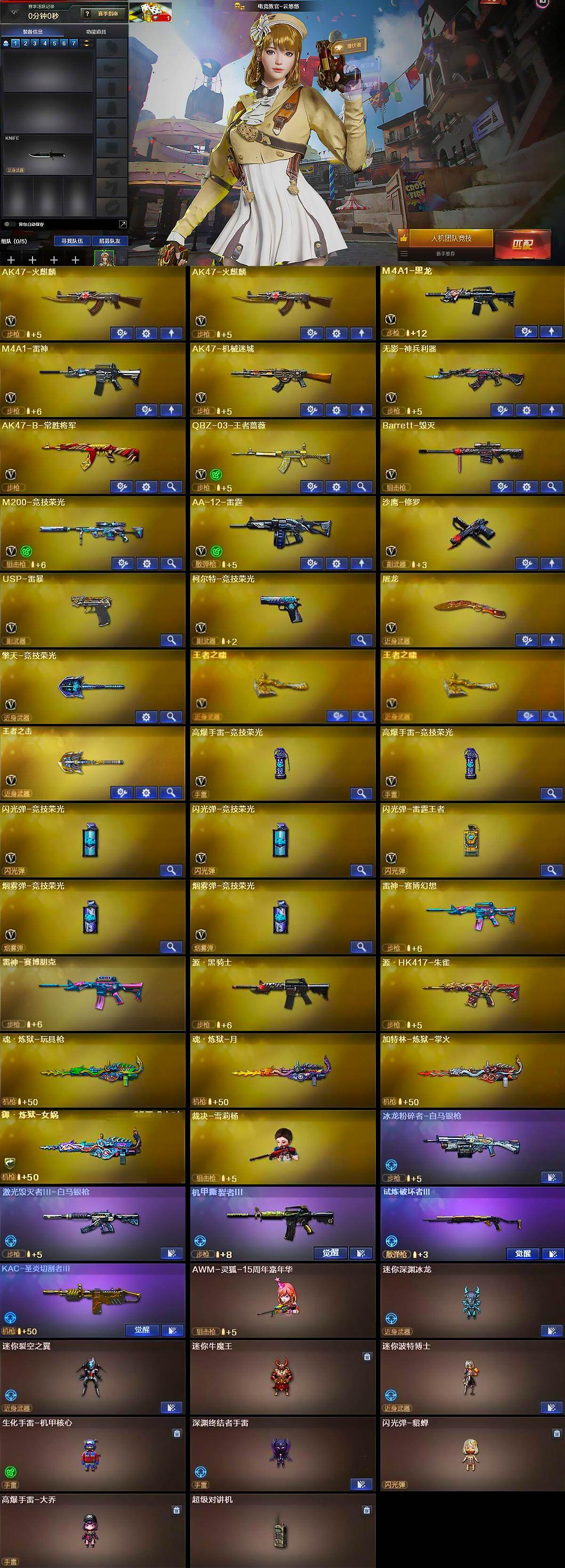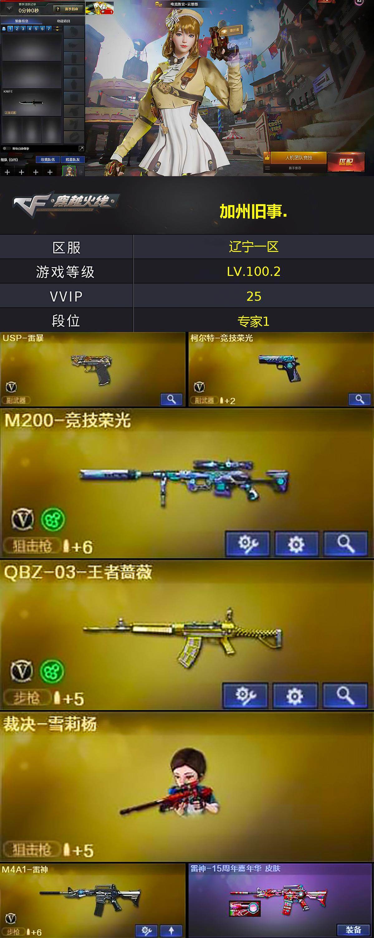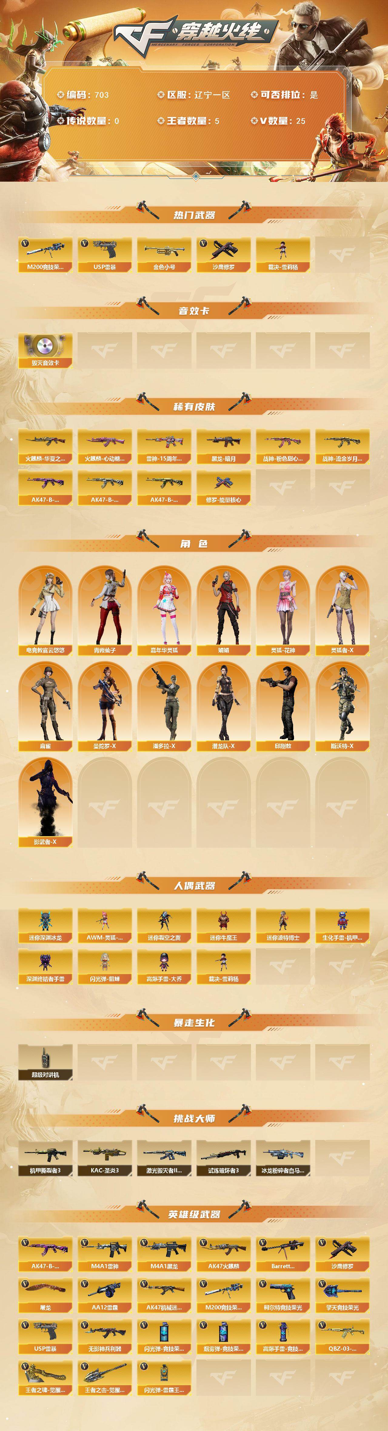 [15387288]辽宁一区-25V-5王者-0炫金 【热门武器】:M200-竞技荣光,金色小号,裁决-雪莉杨,USP-雷暴,沙鹰-修罗 【音效卡】:Barrett-毁灭音效卡 【皮肤】:雷神-15周年嘉年华 皮肤,火麒麟-华夏之心,火麒麟-心动糖果,黑龙-暗月,战神-粉色甜心皮肤,战神-流金岁月皮肤,AK47-B-常胜将军-曹操,AK47-B-常胜将军-刘备,AK47-B-常胜将军-孙权*2,修罗-能量核心 【角色】:电竞教官-云悠悠,嘉年华灵狐,娟娟,灵狐-花神,灵狐者-X,麻雀,曼陀罗-X,潘多拉-X,潜龙队-X,邱刚敖,青霞仙子,斯沃特-X,影武者-X 【人偶武器】:裁决-雪莉杨,AWM-灵狐-15周年嘉年华,迷你深渊冰龙,迷你裂空之翼,迷你牛魔王,迷你波特博士,生化手雷-机甲核心,深渊终结者手雷,闪光弹-貂蝉,高爆手雷-大乔 【暴走生化】:超级对讲机 【挑战大师】:冰龙粉碎者-白马银枪,激光毁灭者III-白马银枪,机甲撕裂者III,试炼破坏者III,KAC-圣炎切割者III 【英雄级武器】:AK47-火麒麟*2,M4A1-黑龙,M4A1-雷神,AK47-机械迷城,无影-神兵利器,AK47-B-常胜将军,QBZ-03-王者蔷薇-觉醒版,Barrett-毁灭,M200-竞技荣光,AA-12-雷霆,沙鹰-修罗,USP-雷暴,柯尔特-竞技荣光,屠龙,擎天-竞技荣光,王者之啸-觉醒版*2,王者之击-觉醒版,高爆手雷-竞技荣光*2,闪光弹-竞技荣光*2,闪光弹-雷霆王者-觉醒版,烟雾弹-竞技荣光*2 【道具】:超级背包,夺命之镰,防化服,金色流光-枪王排位*2,星辰流光-枪王排位,EP战队名片,防弹头盔*3,防弹衣*2,C4工具钳*4,手雷包*4 【特殊枪械】: