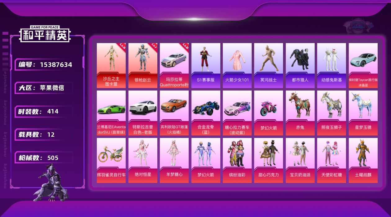 - PX_2110672- 苹果微信-27王牌印记-29粉装-12特效枪-3载具-热力值-332套装-416枪皮-6卓越印记-4传奇印记 【29粉装】,梦幻火箭,蝶舞迷情,洛天依,玩偶服-猪猪侠,盖世英雄,草莓生巧,蔷薇星,复仇流浪者,精灵娃娃,星云暗核,宙之时溯,紫电风暴,狩月元帅,炙焰牛王,傲雪凌霜,寒光使者,馨动时刻,樱桃泡泡,冰霜白皇,炙焰红王,锦绣火鲤,山涧鹿灵,暗夜鎏金,苍蓝魅影,未来歌姬