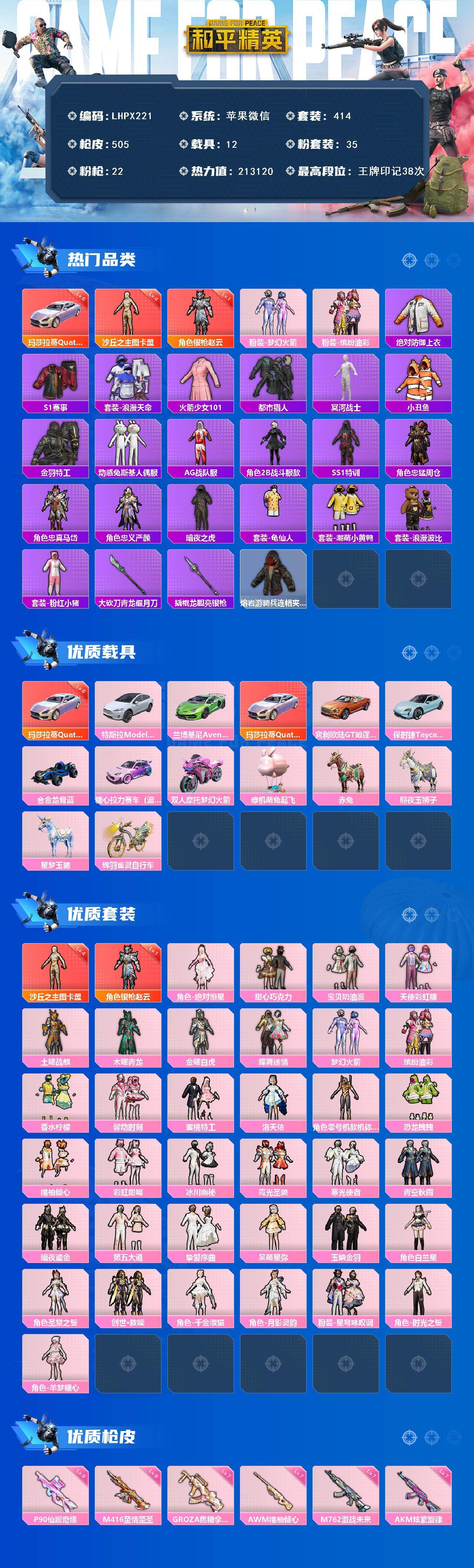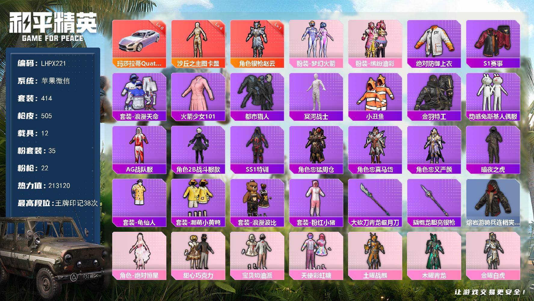 [15387634]可二次【特价出售/店主推荐】苹果 微信-2神装-35粉装-22特效枪-12载具-19粉色飞行器-213120热力值-38王牌印记-414套装-505枪皮