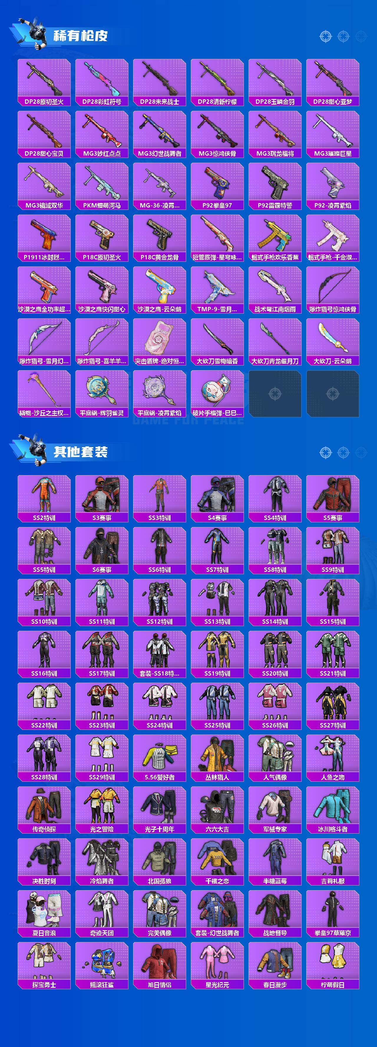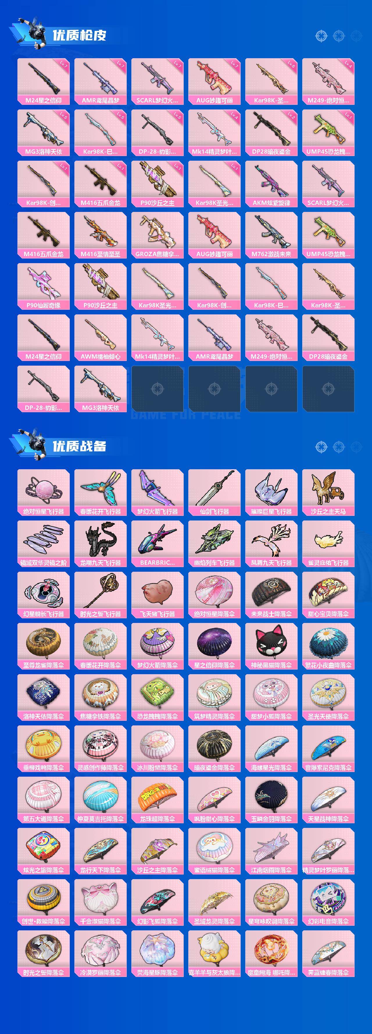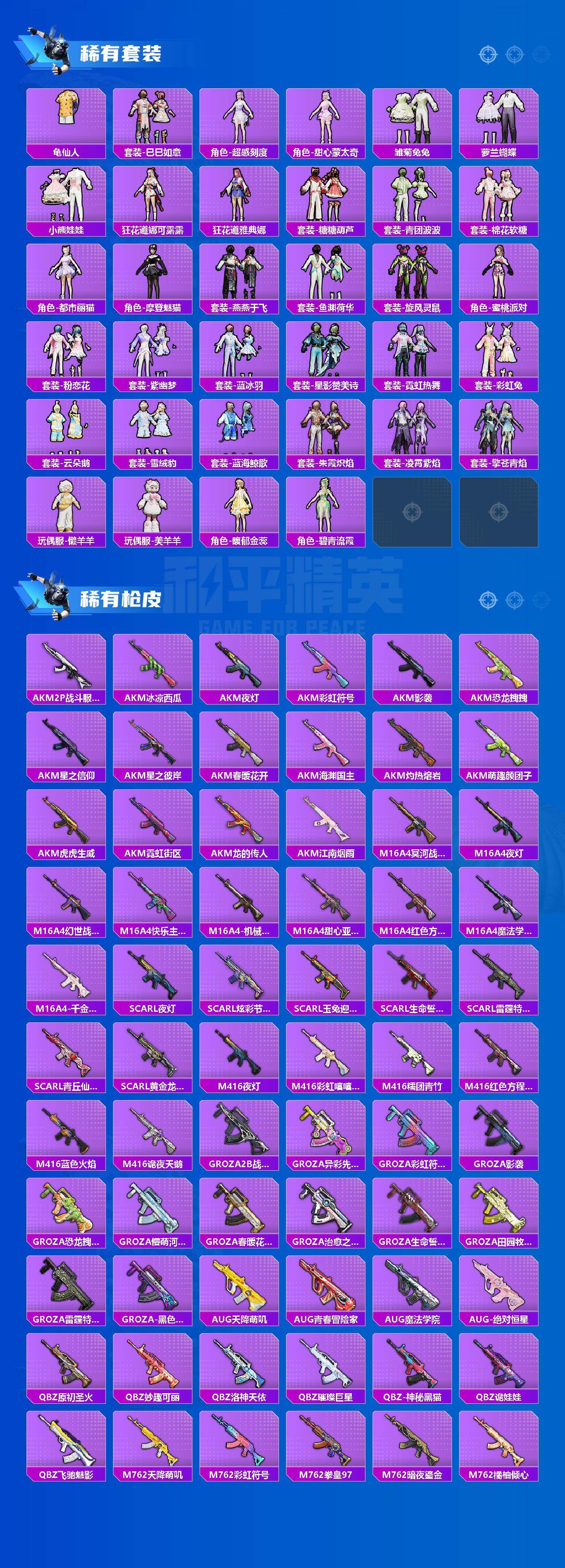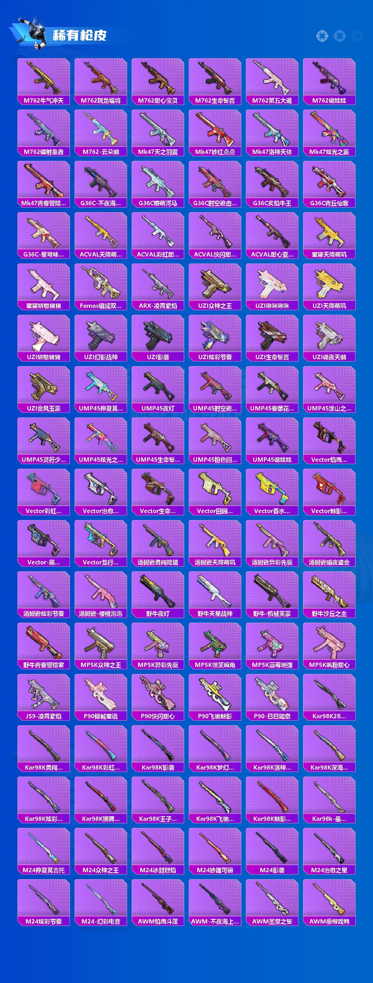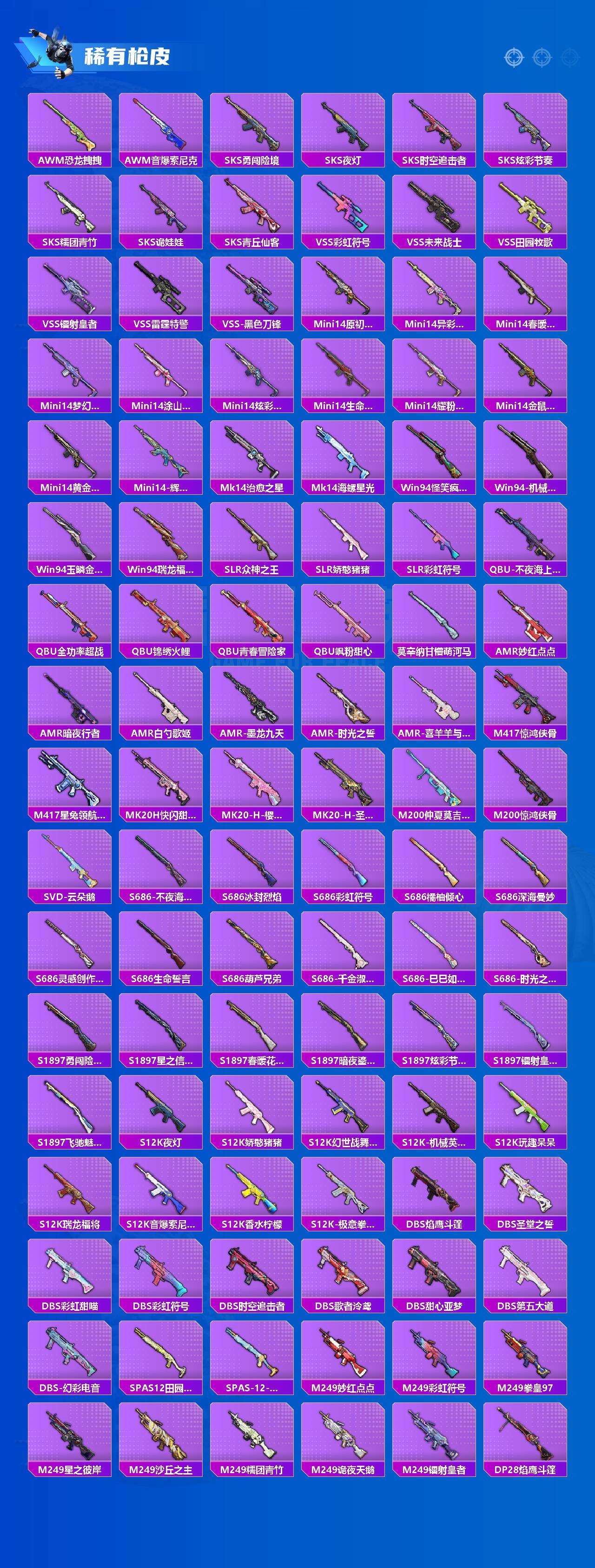 AKM-炫紫旋律,SCAR-L-梦幻火箭,M416-五爪金龙,M416-至情至圣,GROZA-焦糖拿铁,AUG-妙趣可丽,M762-激战未来,UMP45-恐龙拽拽,P90-仙履奇缘,P90-沙丘之主,Kar98K-圣光天使,Kar98K-创世·救赎,Kar98K-巳巳如意,Kar98K-圣域龙灵,M24-星之信仰,AWM-橘柚倾心,Mk14-精灵梦叶罗丽,AMR-鸢尾晶梦,DP-28-暗夜鎏金,MG3-洛神天依