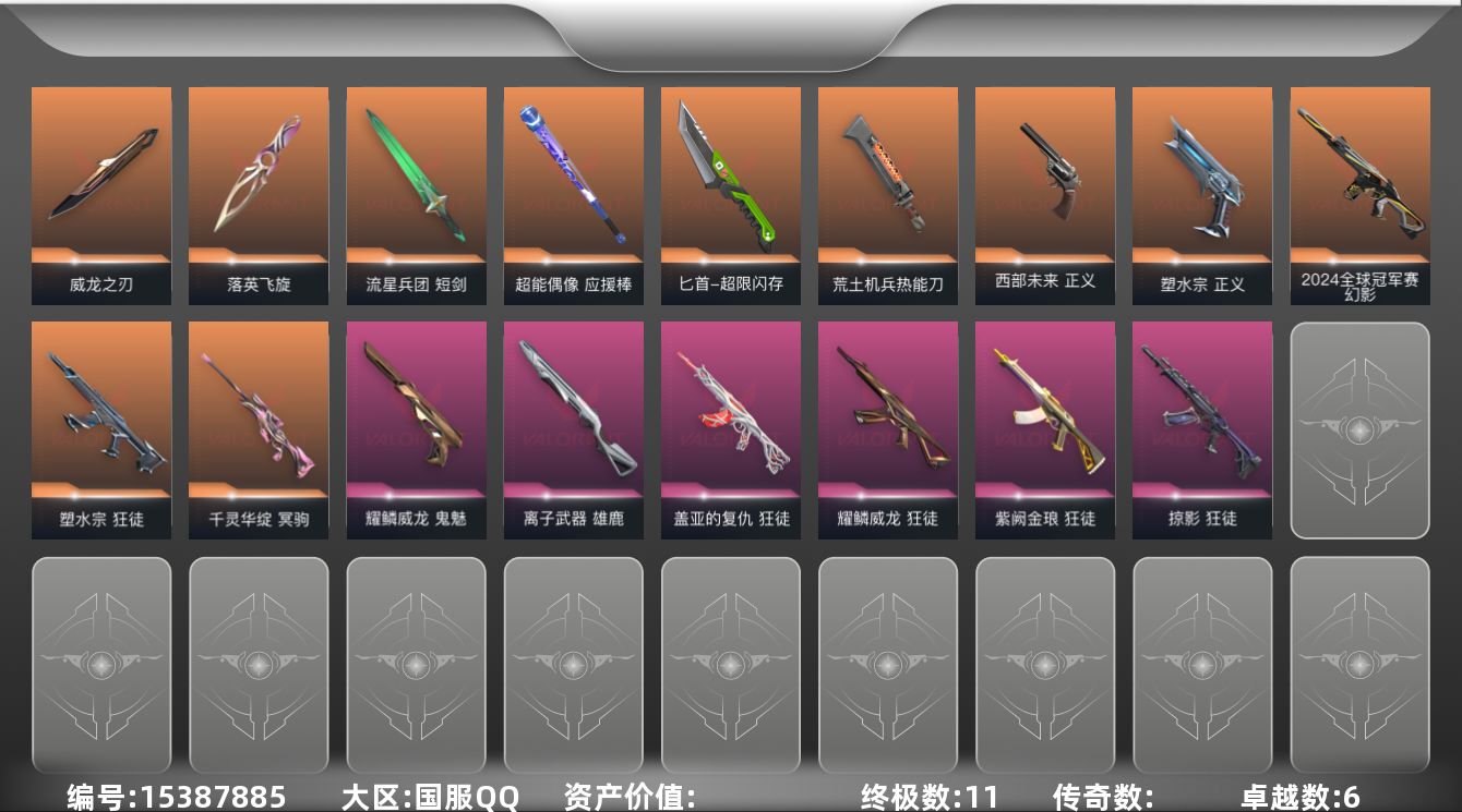 [15387885]【套装】:耀鳞威龙套装 【英雄】:幻棱,炼狱,维斯,暮蝶,钛狐,壹决,铁臂,捷风,雷兹,幽影,不死鸟,贤者,猎枭,蝰蛇,零,芮娜,奇乐,尚勃勒,霓虹,斯凯,夜露,星礈,K/O,海神,盖可,黑梦,钢锁 【近战武器】:近战武器-落英飞旋,近战武器-威龙之刃,近战武器-流星兵团 短剑,近战武器-超能偶像 应援棒,近战武器-超限闪存 匕首,近战武器-荒土机兵 热能刀 【狂徒】:狂徒-塑水宗,狂徒-掠影,狂徒-盖亚的复仇,狂徒-耀鳞威龙,狂徒-紫阙金琅,狂徒-超能偶像,狂徒-荒土机兵,狂徒-流星兵团 【幻影】:幻影-2024全球冠军赛,幻影-超限闪存,幻影-聚合之力,幻影-纳米打击 【戍卫】:戍卫-超能偶像,戍卫-浮光跃金,戍卫-逆冲蛮牛,戍卫-战术熊与伙伴们 【獠犬】:獠犬-采蜜小蜂队,獠犬-模拟赫兹,獠犬-逆冲蛮牛 【冥驹】:冥驹-千灵华绽,冥驹-荒土机兵,冥驹-模拟赫兹 【飞将】:飞将-聚合之力,飞将-战术熊与伙伴们 【莽侠】:莽侠-超限闪存,莽侠-纤云弄巧 【战神】:战神-采蜜小蜂队,战神-浮光跃金 【奥丁】:奥丁-流星兵团,奥丁-纳米打击 【判官】:判官-超能偶像,判官-采蜜小蜂队,判官-纳米打击x 【雄鹿】:雄鹿-离子武器,雄鹿-模拟赫兹,雄鹿-逆冲蛮牛 【骇灵】:骇灵-荒土机兵,骇灵-流星兵团,骇灵-无限竞技,骇灵-浮光跃金 【蜂刺】:蜂刺-超限闪存,蜂刺-聚合之力,蜂刺-纤云弄巧 【标配】:标配-超能偶像,标配-荒土机兵,标配-浮光跃金,标配-战术熊与伙伴们 【正义】:正义-塑水宗,正义-西部未来,正义-超限闪存,正义-幽海幻潮,正义-纳米打击,正义-纤云弄巧 【鬼魅】:鬼魅-耀鳞威龙,鬼魅-流星兵团,鬼魅-诡秘蛇影,鬼魅-采蜜小蜂队,鬼魅-模拟赫兹,鬼魅-星云暗涌 【狂怒】:狂怒-聚合之力,狂怒-逆冲蛮牛,狂怒-战术熊与伙伴们 【短炮】:短炮-纤云弄巧 【卡面】:进入射程 卡面,分崩离析 卡面,纳米打击 卡面,抑制技术 卡面,激斗汉堡 卡面,瓦娃脸雪糕 P2 卡面,从黄昏到黎明 卡面,荒土机兵 卡面,银弹猎手 卡面,逆冲蛮牛 卡面,《双城之战》拥抱 卡面,精灵大战 卡面,欢迎来到底城 卡面,南瓜盛典 卡面,唱片的故事 卡面,钢弓与箭弦 卡面,排除故障 卡面,战术桌游 卡面,悠享食光 卡面,修车达人 卡面,模拟赫兹 卡面,浮光跃金 卡面,超限闪存 卡面,维斯