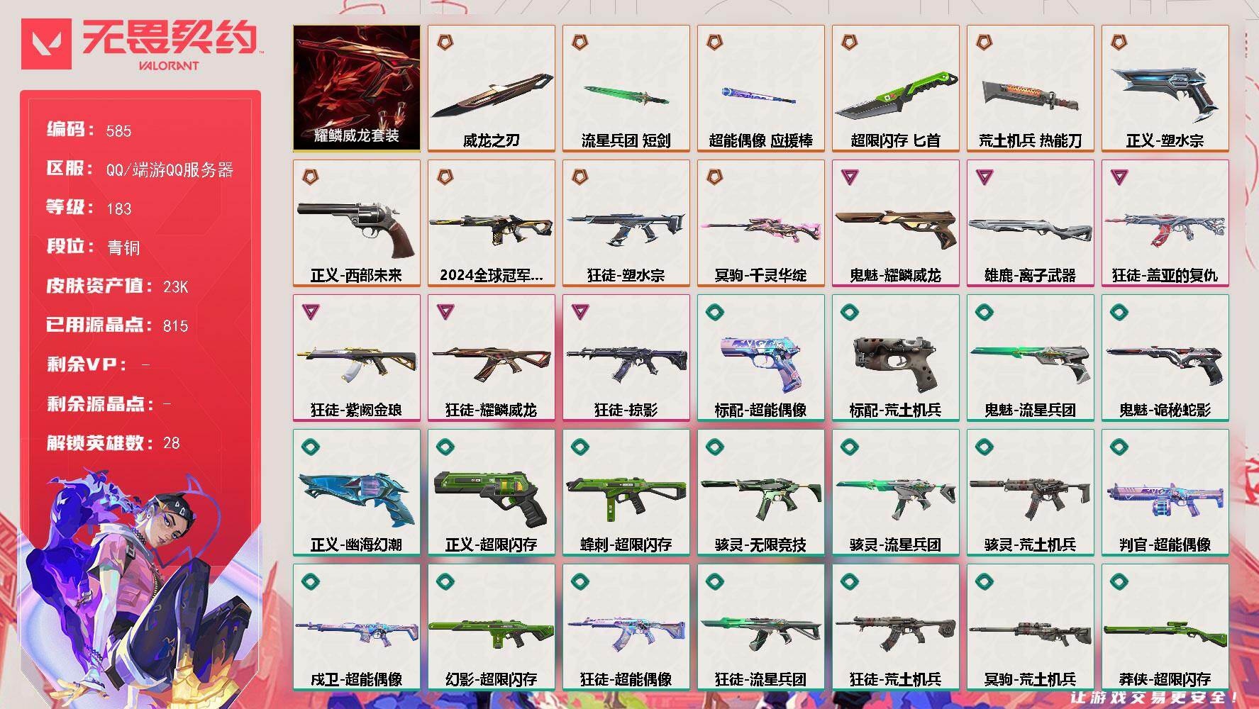 [15387963]【套装】:耀鳞威龙套装 【英雄】:幻棱,炼狱,维斯,暮蝶,钛狐,壹决,铁臂,捷风,雷兹,幽影,不死鸟,贤者,猎枭,蝰蛇,零,芮娜,奇乐,尚勃勒,霓虹,斯凯,夜露,星礈,K/O,海神,盖可,黑梦,钢锁 【近战武器】:近战武器-落英飞旋,近战武器-威龙之刃,近战武器-流星兵团 短剑,近战武器-超能偶像 应援棒,近战武器-超限闪存 匕首,近战武器-荒土机兵 热能刀 【狂徒】:狂徒-塑水宗,狂徒-掠影,狂徒-盖亚的复仇,狂徒-耀鳞威龙,狂徒-紫阙金琅,狂徒-超能偶像,狂徒-荒土机兵,狂徒-流星兵团 【幻影】:幻影-2024全球冠军赛,幻影-超限闪存,幻影-聚合之力,幻影-纳米打击 【戍卫】:戍卫-超能偶像,戍卫-浮光跃金,戍卫-逆冲蛮牛,戍卫-战术熊与伙伴们 【獠犬】:獠犬-采蜜小蜂队,獠犬-模拟赫兹,獠犬-逆冲蛮牛 【冥驹】:冥驹-千灵华绽,冥驹-荒土机兵,冥驹-模拟赫兹 【飞将】:飞将-聚合之力,飞将-战术熊与伙伴们 【莽侠】:莽侠-超限闪存,莽侠-纤云弄巧 【战神】:战神-采蜜小蜂队,战神-浮光跃金 【奥丁】:奥丁-流星兵团,奥丁-纳米打击 【判官】:判官-超能偶像,判官-采蜜小蜂队,判官-纳米打击x 【雄鹿】:雄鹿-离子武器,雄鹿-模拟赫兹,雄鹿-逆冲蛮牛 【骇灵】:骇灵-荒土机兵,骇灵-流星兵团,骇灵-无限竞技,骇灵-浮光跃金 【蜂刺】:蜂刺-超限闪存,蜂刺-聚合之力,蜂刺-纤云弄巧 【标配】:标配-超能偶像,标配-荒土机兵,标配-浮光跃金,标配-战术熊与伙伴们 【正义】:正义-塑水宗,正义-西部未来,正义-超限闪存,正义-幽海幻潮,正义-纳米打击,正义-纤云弄巧 【鬼魅】:鬼魅-耀鳞威龙,鬼魅-流星兵团,鬼魅-诡秘蛇影,鬼魅-采蜜小蜂队,鬼魅-模拟赫兹,鬼魅-星云暗涌 【狂怒】:狂怒-聚合之力,狂怒-逆冲蛮牛,狂怒-战术熊与伙伴们 【短炮】:短炮-纤云弄巧 【卡面】:进入射程 卡面,分崩离析 卡面,纳米打击 卡面,抑制技术 卡面,激斗汉堡 卡面,瓦娃脸雪糕 P2 卡面,从黄昏到黎明 卡面,荒土机兵 卡面,银弹猎手 卡面,逆冲蛮牛 卡面,《双城之战》拥抱 卡面,精灵大战 卡面,欢迎来到底城 卡面,南瓜盛典 卡面,唱片的故事 卡面,钢弓与箭弦 卡面,排除故障 卡面,战术桌游 卡面,悠享食光 卡面,修车达人 卡面,模拟赫兹 卡面,浮光跃金 卡面,超限闪存 卡面,维斯