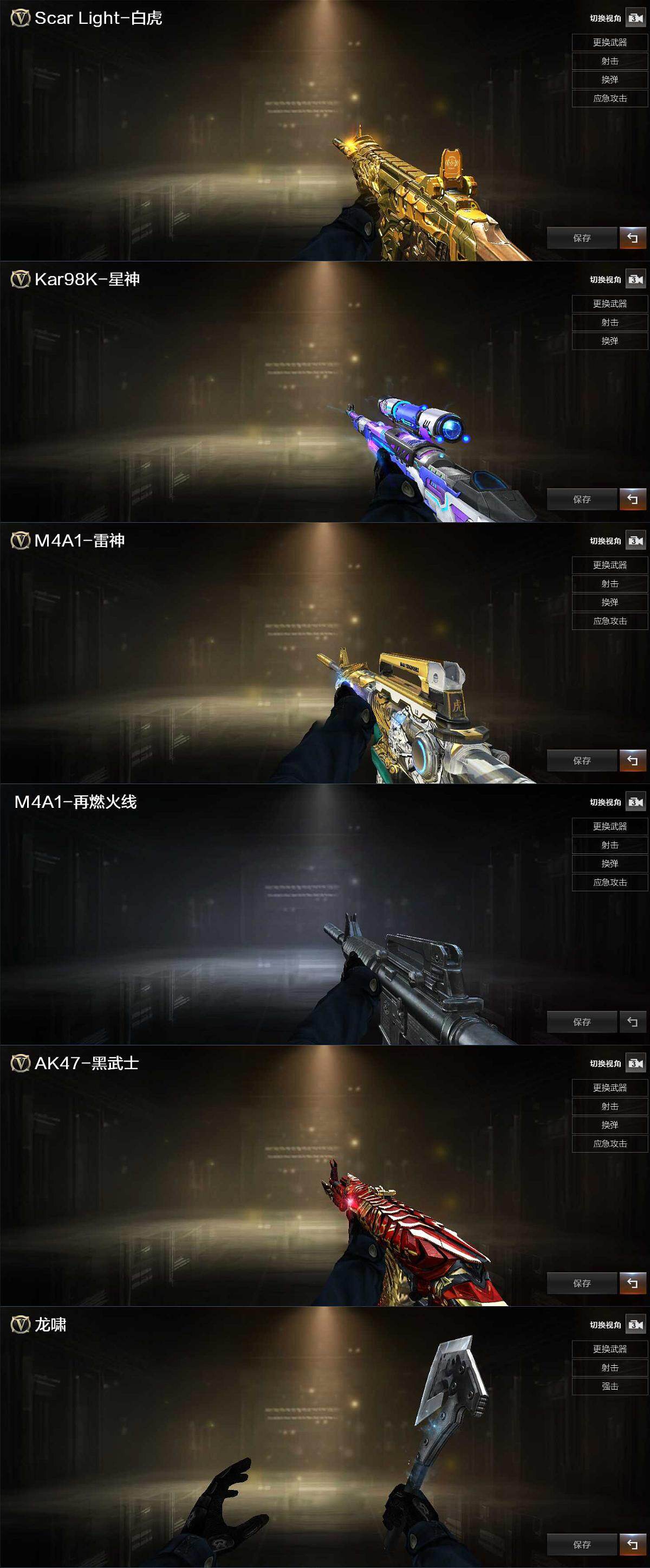 【皮肤】:白虎-百战金芒 皮肤,星神-漫游,雷神-虎将,M4A1-再燃火线,黑武士-典韦皮肤,轻型军用手斧-再燃火线