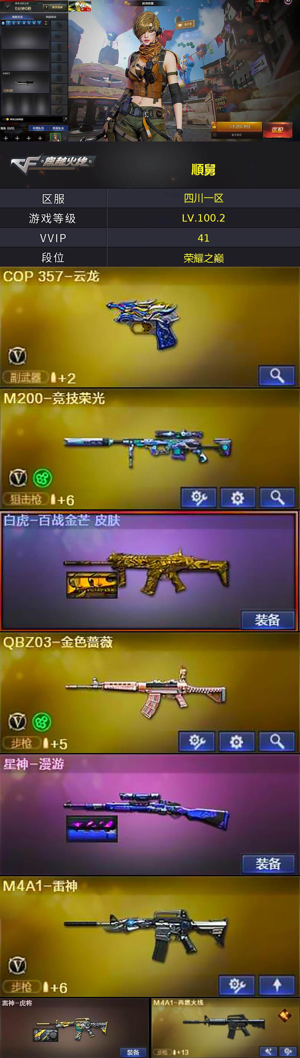 [15388196]四川一区-36V-2王者-0炫金 【热门武器】:QBZ03-金色蔷薇,M200-竞技荣光,死亡之眼,C.A.T 【音效卡】:Barrett-碧霄极光音效卡,炼狱-百战金芒-庆典舞曲音效卡 【皮肤】:白虎-百战金芒 皮肤,星神-漫游,雷神-虎将,M4A1-再燃火线,黑武士-典韦皮肤,轻型军用手斧-再燃火线 【角色】:战地猎狐,蛇隐宗,奇洋探员,暗夜-X,北极狐-X,初恋灵狐,电竞少女,飞虎队-X,嘉年华灵狐,娟娟,麻雀,潘多拉-甜心教官,潜龙队-X,青霞仙子,蛇姬,斯沃特-X,新娜塔莎,游珑儿 【人偶武器】:天龙-曼陀罗,AWM-灵狐-15周年嘉年华*4,C.A.T,迷你裂空之翼,生化手雷-机甲核心,迷你艾比,灵狐娃娃手雷*2 【暴走生化】:死亡之眼 【挑战大师】:冰龙粉碎者-白马银枪,激光毁灭者III-白马银枪,神圣爆裂者-末日III,阐释者III 【英雄级武器】:M4A1-雷神,黑武士-锦绣游龙,超新星-热带奇洋,QBZ03-金色蔷薇,AK-47-猩红传说,黑骑士-海王,M200-竞技荣光,炼狱-百战金芒,COP 357-云龙,擎天-竞技荣光,龙啸-热带奇洋,麒麟刺-百战金芒,高爆手雷-竞技荣光*3,高爆手雷-云龙*2,手雷-热带奇洋,高爆手雷-古蛇迷踪,高爆手雷-玄豹,闪光弹-竞技荣光*2,闪光弹-玄豹*3,闪光弹-雷霆王者-觉醒版,烟雾弹-竞技荣光*2,烟雾弹-云龙*2,烟雾弹-古蛇迷踪,烟雾弹-玄豹,烟雾弹-雷霆王者-觉醒版,M4A1-赤狱骑士,M4A1-苍鸣雷神,AWM-昌龙,Barrett-碧霄极光 【道具】:CFS限定背包,云山科技背包,全能枪王背包,奇洋探员-海龟背包,炫彩背包,热带奇洋炫彩背包,百战金芒炫彩背包,背包-洛丽塔,超级背包,哔哩哔哩名片,女皇终结者-魔龙之吻,救世主-黑桃战神,绿色巨人,灵魂忍者*3,变异宝贝,迷雾幽灵*2,夺命之镰,防化服*3,金色流光-枪王排位*2,星辰流光-枪王排位,巅峰赛先锋-金色流光,枪王排位28赛季金色流光,枪王排位29赛季金色流光,语音特效-盛典烟火,蛇隐宗表情,萌萌小葵表情,热带奇洋表情,EP战队名片,EP战队喷图,EP战队击杀图标,防弹头盔*5,防弹衣*5,C4工具钳*5,手雷包*5 【特殊枪械】: