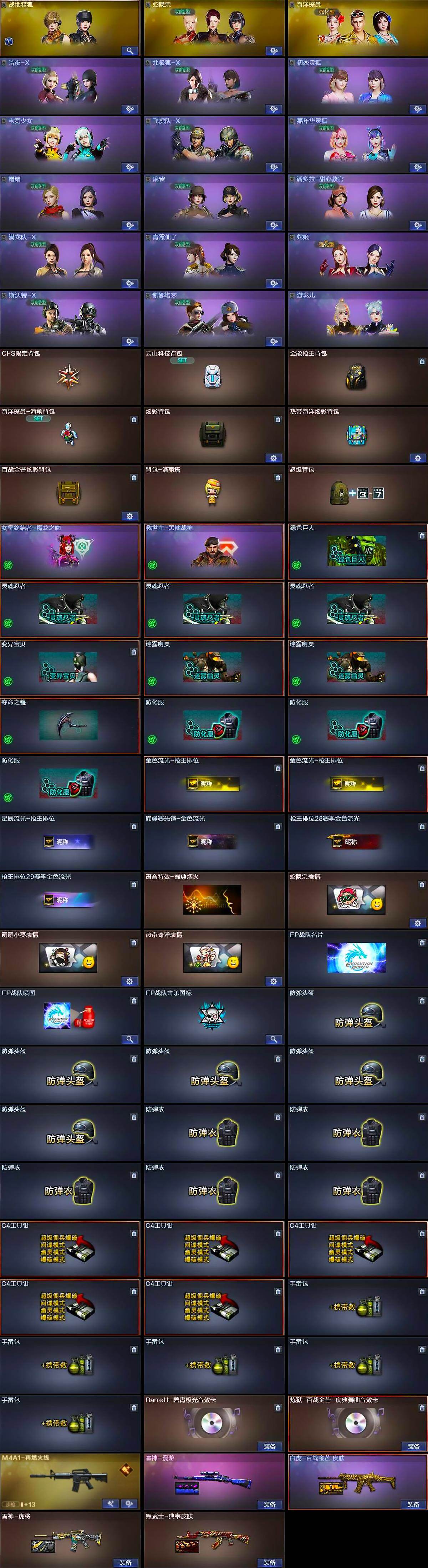 【道具】:CFS限定背包,云山科技背包,全能枪王背包,奇洋探员-海龟背包,炫彩背包,热带奇洋炫彩背包,百战金芒炫彩背包,背包-洛丽塔,超级背包,哔哩哔哩名片,女皇终结者-魔龙之吻,救世主-黑桃战神,绿色巨人,灵魂忍者*3,变异宝贝,迷雾幽灵*2,夺命之镰,防化服*3,金色流光-枪王排位*2,星辰流光-枪王排位,巅峰赛先锋-金色流光,枪王排位28赛季金色流光,枪王排位29赛季金色流光,语音特效-盛典烟火,蛇隐宗表情,萌萌小葵表情,热带奇洋表情,EP战队名片,EP战队喷图,EP战队击杀图标,防弹头盔*5,防弹衣*5,C4工具钳*5,手雷包*5