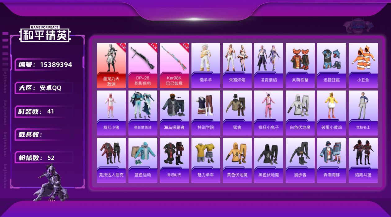 [15389394]【店主推荐捡漏号!可直接换绑】 安卓 手Q-1神装-2特效枪-1.5w热力值-0王牌印记-41套装-52枪皮【红色神装等级】:墨龙九天-敖渊(二级)【热门品类】:套装-小丑鱼,套装-粉红小猪【粉色枪皮等级】:Kar98K-巳巳如意(二级),DP-28-豹影疾电(三级)