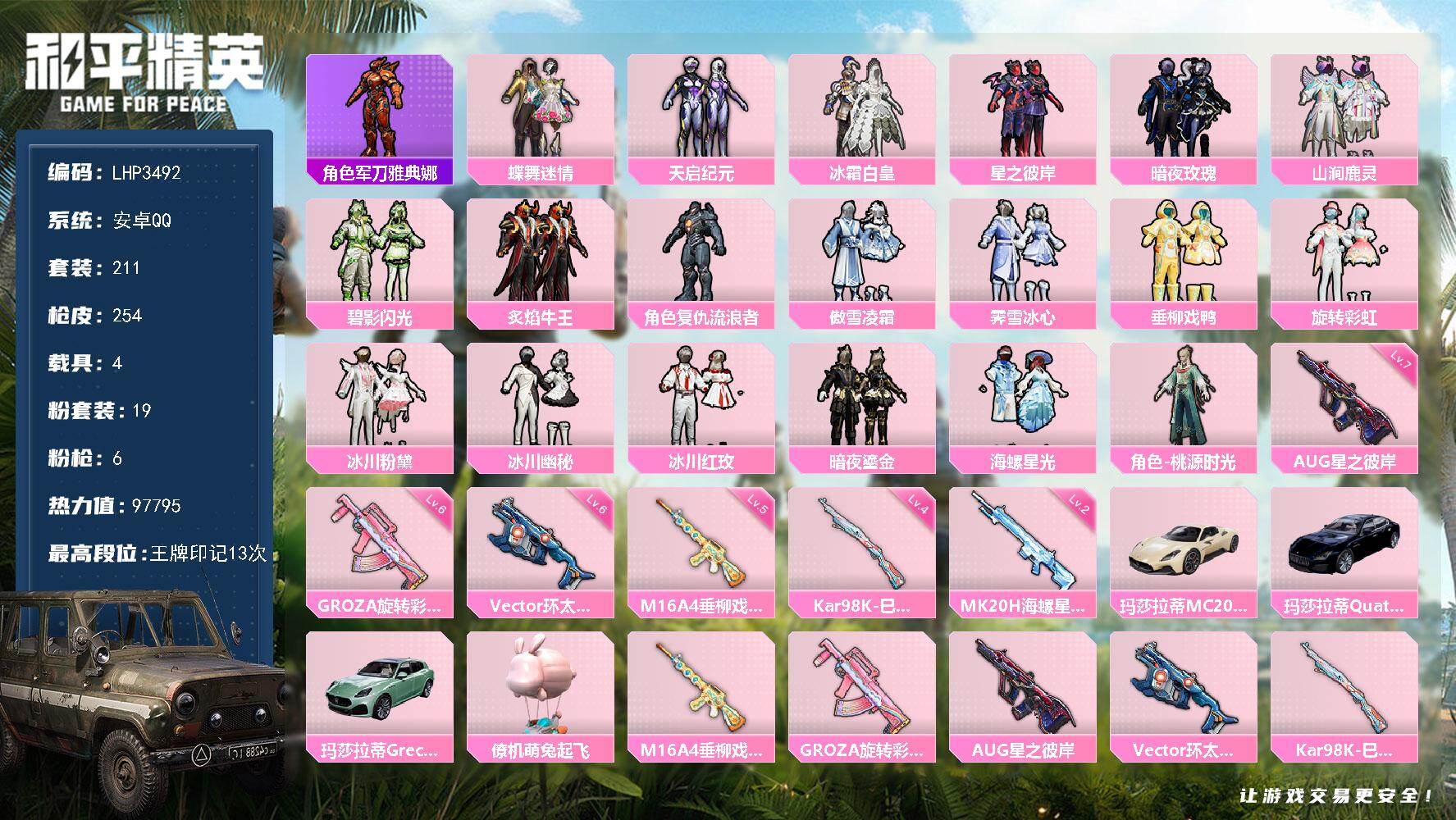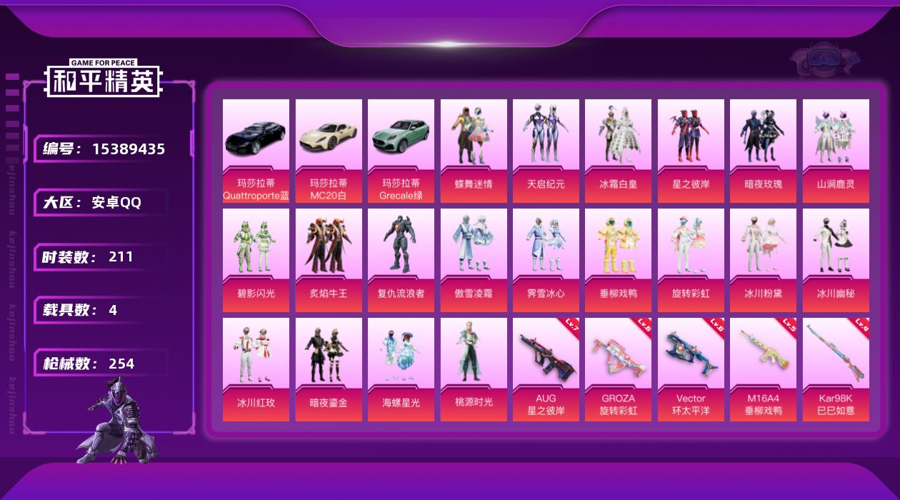 [15389435]暑期末清货/特价急出/永久包赔安卓 手Q-19粉装-6特效枪-4载具-9.7w热力值-13印记-211套装-254枪皮【热门品类】:角色-军刀雅典娜【稀有载具】:玛莎拉蒂MC20(星石白),玛莎拉蒂Quattroporte(夜幕蓝),玛莎拉蒂Grecale(薄荷绿),僚机-萌兔起飞【特效枪等级】:M16A4-垂柳戏鸭(五级),GROZA-旋转彩虹(六级),AUG-星之彼岸(七级),Vector-环太平洋(六级),Kar98K-巳巳如意(四级),MK20-H-海螺星光(二级)【优质套装】:粉装-蝶舞迷情,粉装-天启纪元,粉装-冰霜白皇,粉装-星之彼岸,粉装-暗夜玫瑰,粉装-山涧鹿灵,粉装-碧影闪光,粉装-炙焰牛王,角色-复仇流浪者,粉装-傲雪凌霜,粉装-霁雪冰心,粉装-垂柳戏鸭,粉装-旋转彩虹,粉装-冰川粉黛,粉装-冰川幽秘,粉装-冰川红玫,粉装-暗夜鎏金,粉装-海螺星光,角色-桃源时光【优质飞行器】:夏日绵绵冰飞行器,星之彼岸飞行器,太空嘟嘟飞行器,歌者泠鸢飞行器