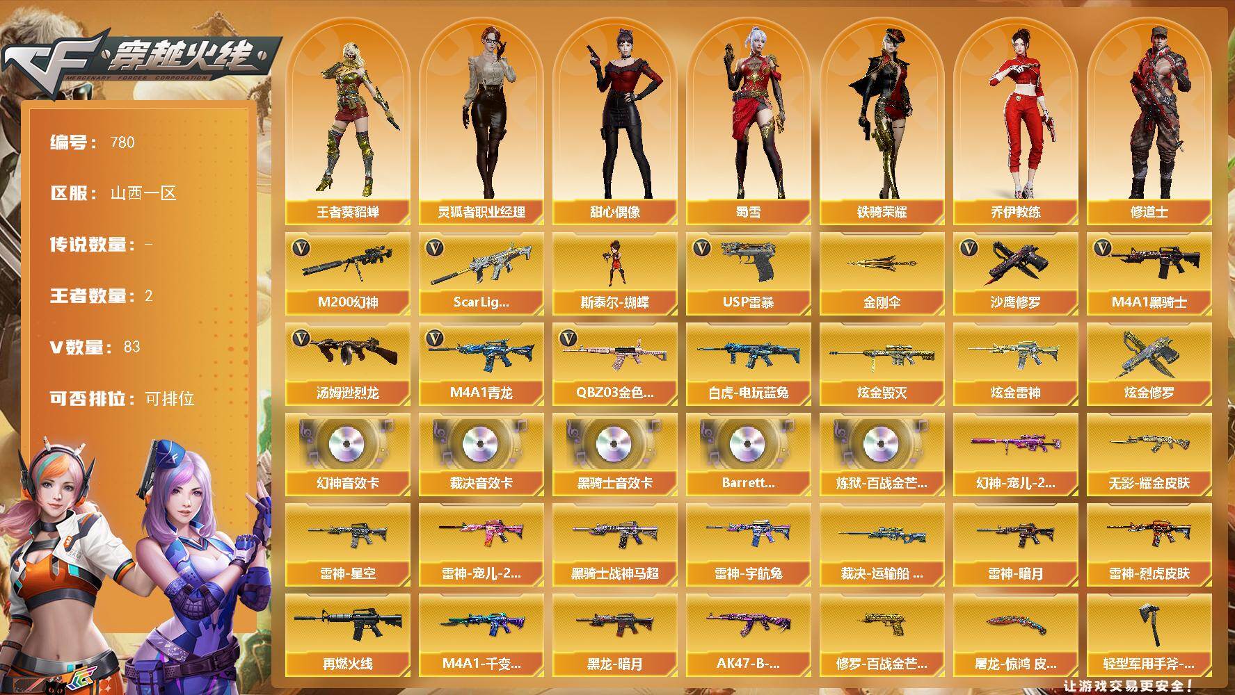 [15389417]山西一区-83V-2王者-3炫金 【热门武器】:QBZ03-金色蔷薇,Scar Light-白虎,M4A1-青龙*2,M200-幻神,白虎-电玩蓝兔,M4A1-黑骑士*2,汤姆逊-烈龙,斯泰尔-蝴蝶,USP-雷暴,沙鹰-修罗*2,金刚伞 【王者炫金武器】:炫金雷神,炫金毁灭,炫金修罗 【音效卡】:M200-幻神音效卡,M4A1-黑骑士音效卡*2,AWM-裁决音效卡,Barrett-碧霄极光音效卡*2,炼狱-百战金芒-庆典舞曲音效卡 【皮肤】:幻神-宠儿-2021MVP,裁决-运输船 皮肤,雷神-暗月,雷神-星空,雷神-宠儿-2019MVP,雷神-烈虎皮肤,雷神-宇航兔皮肤,M4A1-再燃火线,M4A1-千变-孔明皮肤,黑龙-暗月,黑骑士-战神马超,无影耀金皮肤,AK47-B-常胜将军-曹操,修罗-百战金芒 皮肤,屠龙-惊鸿 皮肤,轻型军用手斧-再燃火线 【角色】:王者-葵-貂蝉,乔伊教练,修道士,空,暗夜-X,电竞少女,飞虎队-X,风暴女*2,虎妞,嘉年华灵狐,娟娟,兰妹妹,灵狐-花神,灵狐者-X,灵狐者-职业经理,龙儿,龙儿-小淘气,麻雀,潘多拉-X,潘多拉-甜心教官,斯沃特-X,甜心偶像,蜀雪,铁骑荣耀,雪莉杨,影武者-X 【人偶武器】:迷你救赎猎手,斯泰尔-蝴蝶,AWM-灵狐-15周年嘉年华,迷你深渊冰龙,迷你牛牛,深渊终结者手雷,闪光弹-小乔,闪光弹-貂蝉,高爆手雷-大乔,迷你艾比,迷你超能女侍 【挑战大师】:神圣爆裂者III,AK47-冰龙粉碎者,冰龙粉碎者-白马银枪,激光毁灭者III-白马银枪,激光毁灭者III,神圣爆裂者-末日III 【英雄级武器】:M4A1-千变,AK47-火麒麟,M4A1-黑龙,M4A1-雷神,M4A1-黑骑士*2,AK47-无影,M4A1-死神,AK47-黑武士,M4A1-青龙*2,Scar Light-白虎,无影-神兵利器,黑武士-锦绣游龙,M4A1-玫瑰精灵,QBZ03-金色蔷薇,M4A1-猎神,AK-47-猩红传说*7,AK47-B-战神,AK47-B-常胜将军*2,QBZ-03-王者蔷薇-觉醒版,白虎-电玩蓝兔,AWM-裁决,M200-幻神,Barrett-朱雀,炼狱-百战金芒,汤姆逊-烈龙,AA-12-雷霆,沙鹰-修罗*2,沙鹰-天神,USP-雷暴,柯尔特-荣耀世冠EP,屠龙*2,麒麟刺-堕天神*2,麒麟刺*2,龙啸-