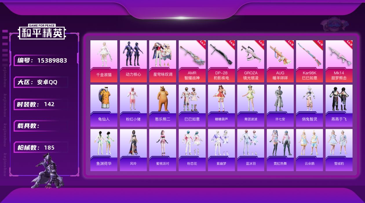 - [11547378]1粉装 4特效枪 6印记 可二次 可修改实名 优质装备:SLR暗夜玫瑰,M417第五大道,七级M417-第五大道,七级SLR-暗夜玫瑰,幻彩电音,Kar98K-巳巳如意 稀有枪皮:DP-28-豹影疾电 五级特效枪:五级Kar98K-巳巳如意,五级DP-28-豹影疾电 紫色装扮:田园牧歌,轻风白浪,和煦暖阳,SS22特训,莱茵河畔,SS23特训,幻彩翩翩,灵蜜圈圈,妙红点点,香榭午后,白兰地假日,娇憨猪猪,萌趣咩咩,SS21特训,SS31特训套装,冰川特警,冷焰舞者,旭日情侣,SS30特训套装,SS33特训套装,顶瓜瓜,SS20特训,魔力冰咖,都市魅力,长空猛禽,霓虹街区,青年教官,缤纷果语,耀眼新星,蓝色运动,街头潮人,超能勇士,魅力单车,鹤鸣,麻辣教官,黄色伏地魔,黄色名流,黄色运动,黑色伏地魔,龙的传人,龟仙人,冰河战士,龙魂突击队,柠萌假日,海岛探路者,涂山之恋,幻影武者,完美偶像,帅气教官,幻世战舞者,绮丽涂鸦,白色伏地魔,甜蜜告白,空岛之星,竞技达人朋克,王牌教练,牛气冲天,灰色格斗者,燃烧卡路里,猎鹰,SS29特训,星途旅人,纯真浪花,热情海星,SS28特训,玉兔迎春,巳巳如意,竞技名士,SS24特训(SS24特训套装),SS25特训,锦衣飞扬,焰鹰斗篷,幻羽潜行,幽夜迷踪,SS27特训,浪漫天命,SS26特训,春光漫游,快闪甜心,贝斯之夜,大橘大利,SS32特训服(SS32特训套装),青玉碎影,绯格组合,白糯汤圆,恋语绒绒,光之冒险 优质战备:圣堂之誓降落伞,星途旅人降落伞,繁龙极客降落伞,垂柳戏鸭降落伞,歌者泠鸢降落伞,第五大道降落伞,黄族统领降落伞,凝视深渊降落伞