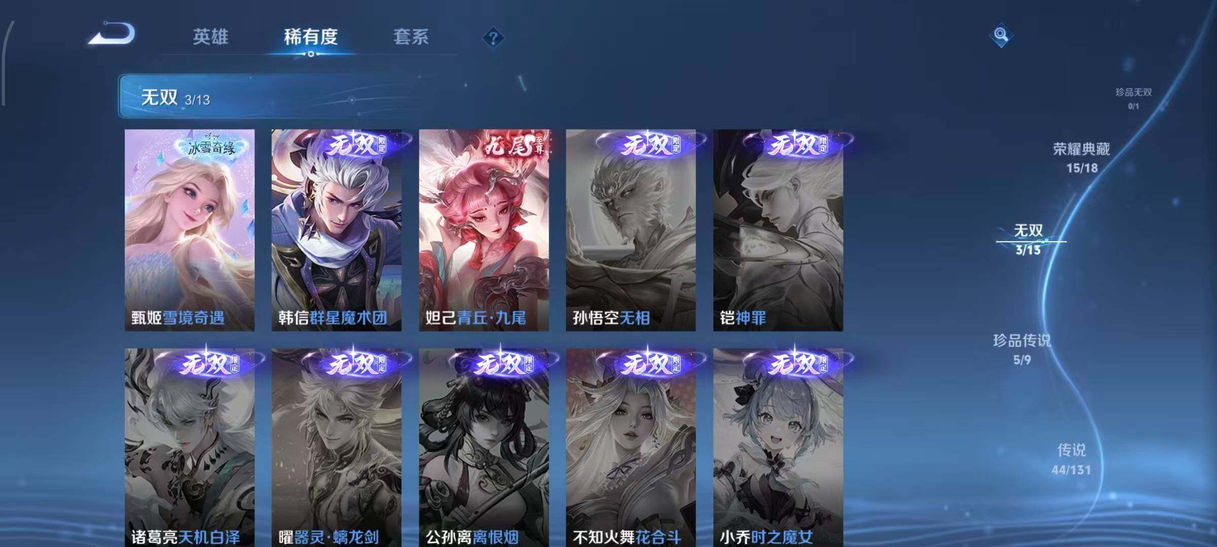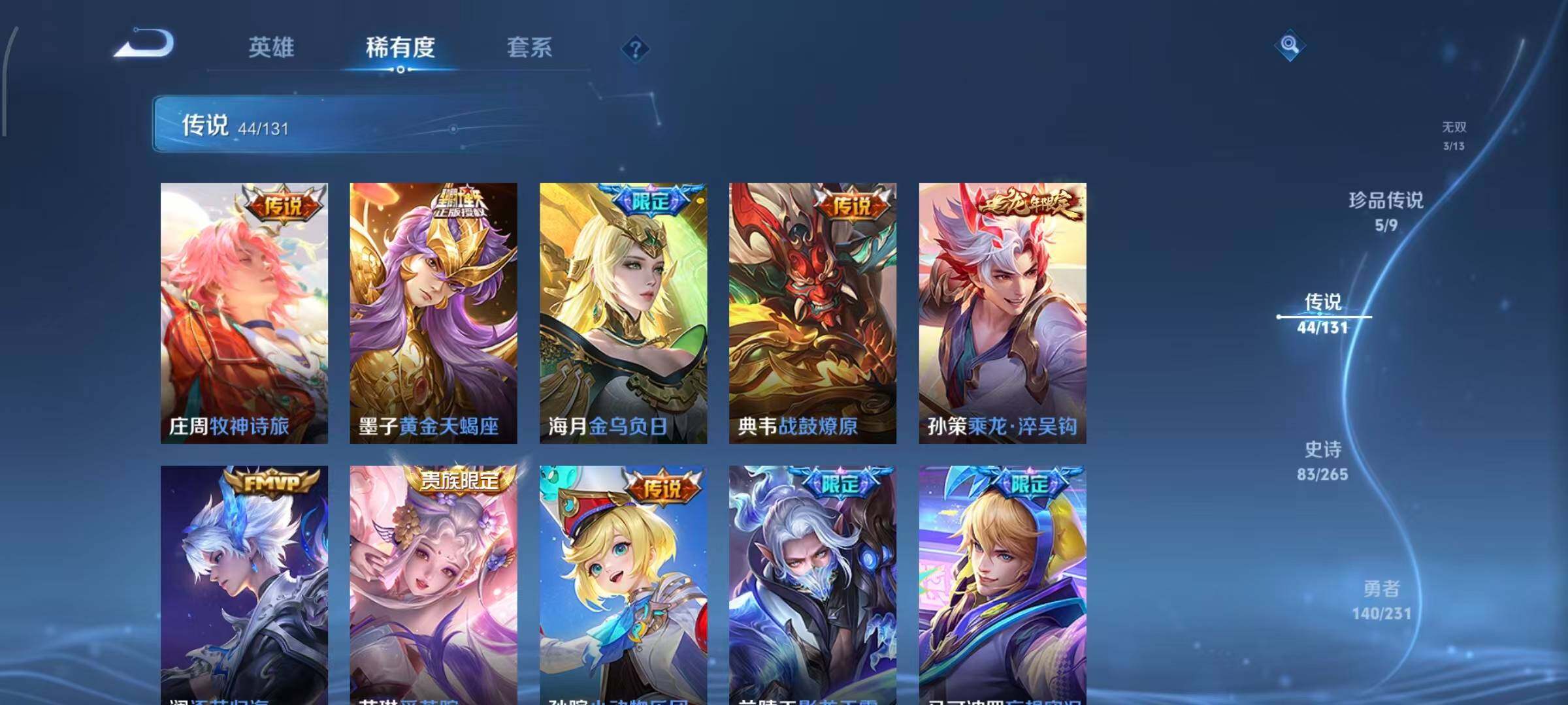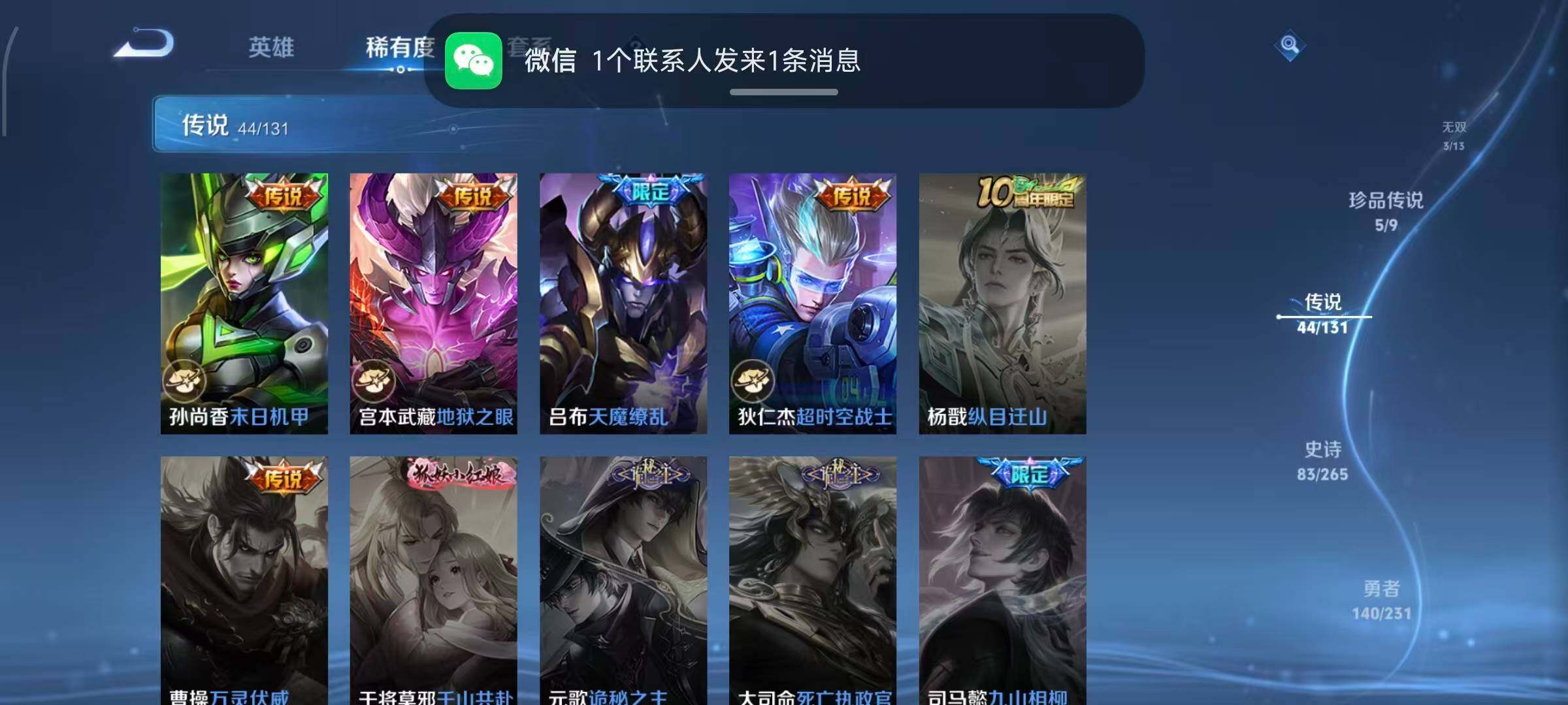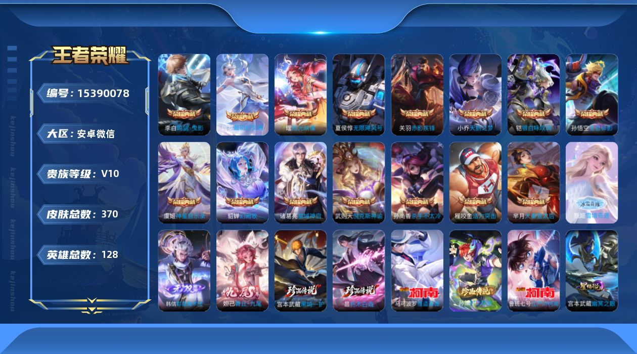 [15390078]安卓WX-V10-最强王者段位-128英雄-370皮肤-16典藏-3无双-5珍品传说-44传说-83史诗-3星传