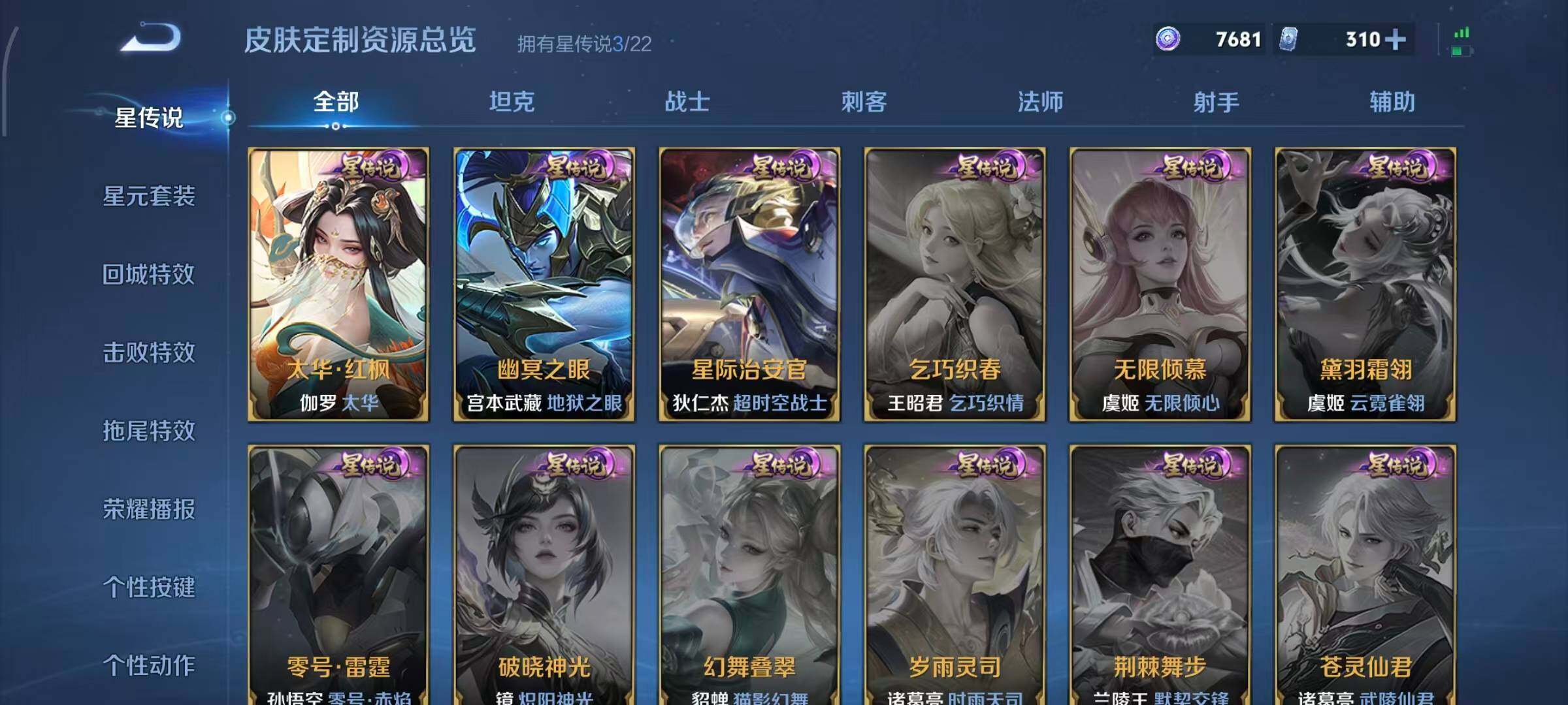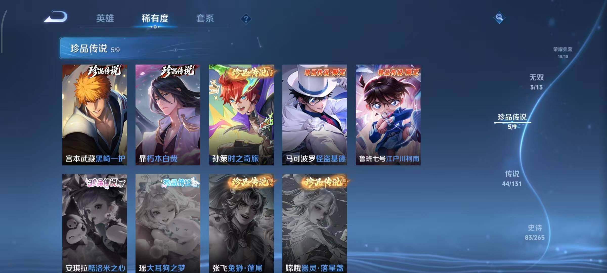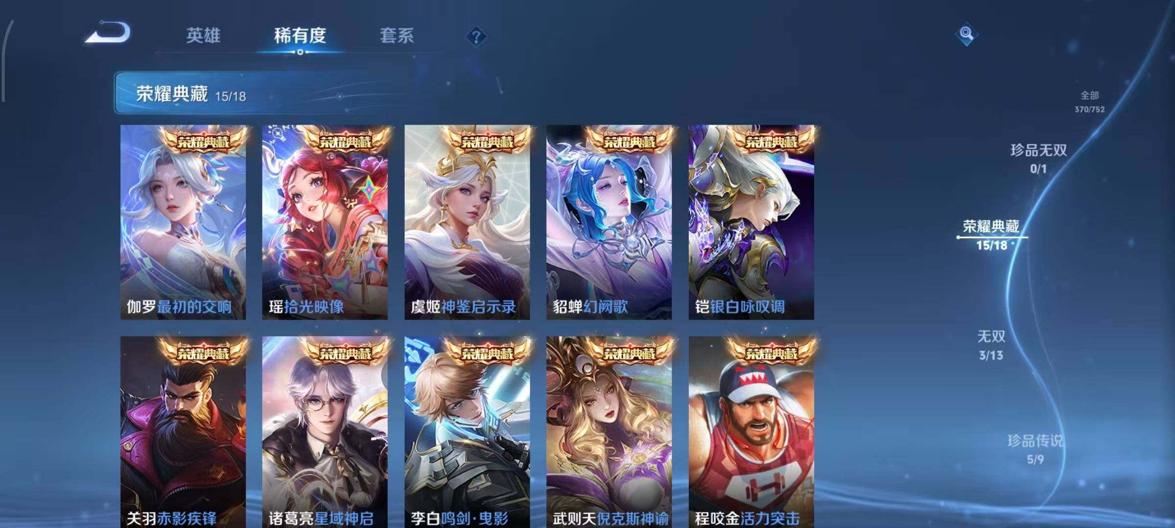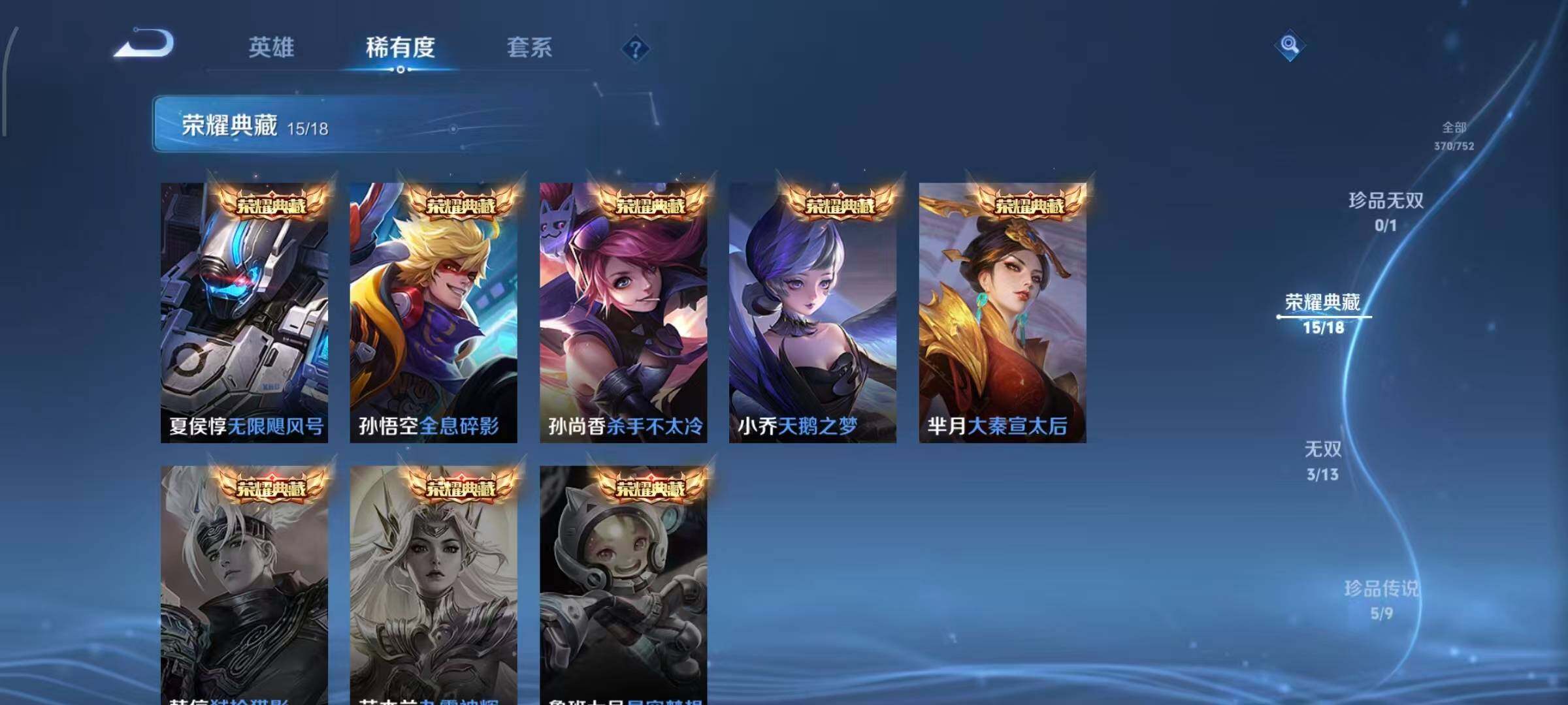 【荣耀典藏】:武则天英雄,孙悟空全息碎影,武则天倪克斯神谕,夏侯惇无限飓风号,小乔天鹅之梦,孙尚香杀手不太冷,芈月大秦宣太后,程咬金活力突击,李白鸣剑曳影,诸葛亮星域神启,关羽赤影疾锋,铠银白咏叹调,貂蝉幻阙歌,虞姬神鉴启示录,瑶拾光映像,伽罗最初的交响