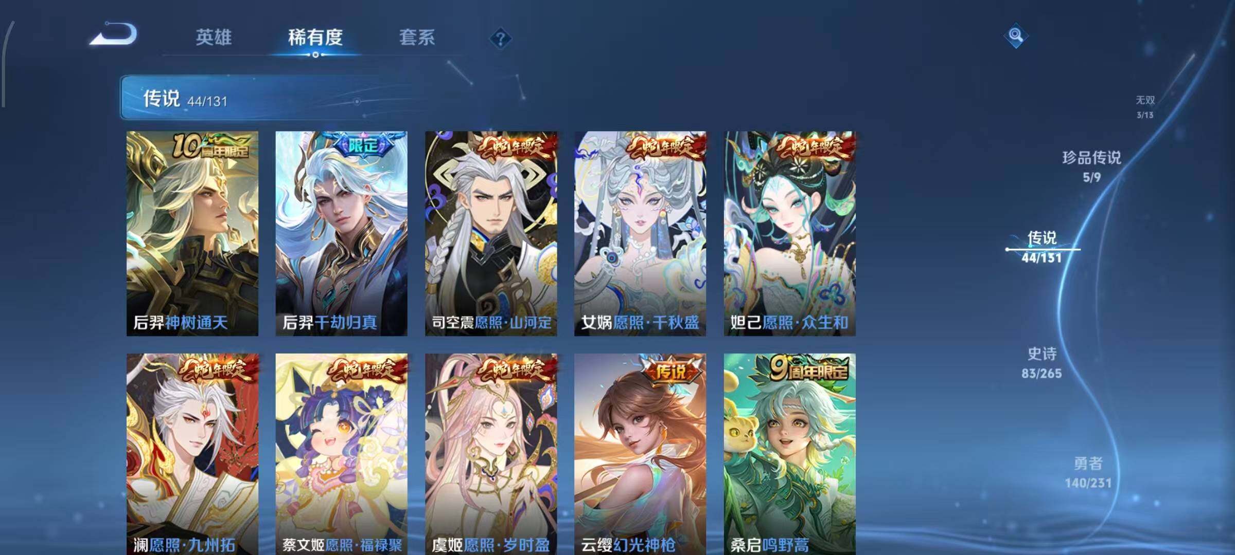 【传说皮肤】:后羿神树通天,后羿千劫归真,司空震愿照山河定,女娲愿照千秋盛,妲己愿照众生和,澜愿照九州拓,蔡文姬愿照福禄聚,虞姬愿照岁时盈,云缨幻光神枪,桑启鸣野蒿,庄周牧神诗旅,墨子黄金天蝎座,海月金乌负日,典韦战鼓燎原,孙策乘龙淬吴钩,澜逐花归海,艾琳觅芳踪,孙膑小动物乐团,兰陵王影龙天霄,马可波罗妄想实况,东皇太一灼幽烈阳,公孙离记忆之芯,干将莫邪画中仙,吕布怒海麟威,百里守约碎云,马超无双飞将,蔡文姬花朝如约,赵云淬星耀世,李元芳飞鸢探春,诸葛亮时雨天司,镜炽阳神光,虞姬启明星使,曜云鹰飞将,李信一念神魔,刘备时之恋人,伽罗太华,张良黄金白羊座,达摩黄金狮子座,花木兰冠军飞将,后羿黄金射手座,孙尚香末日机甲,宫本武藏地狱之眼,吕布天魔缭乱,狄仁杰超时空战士