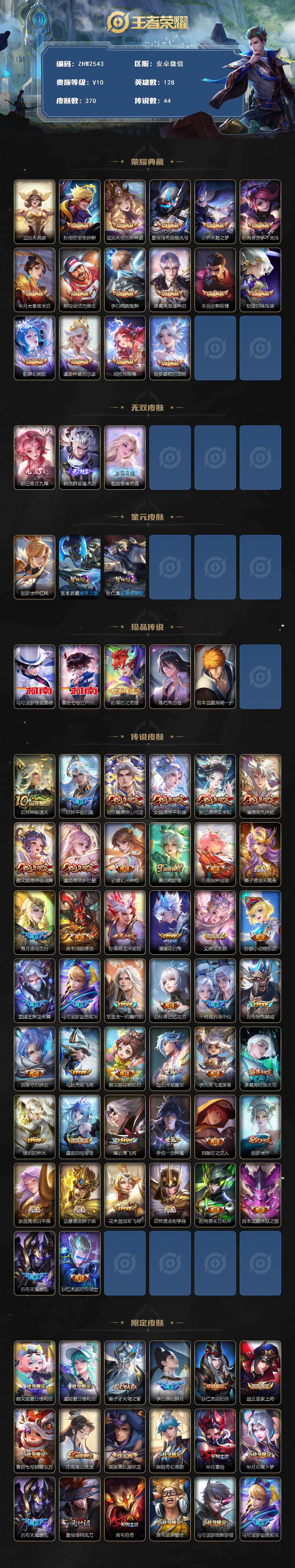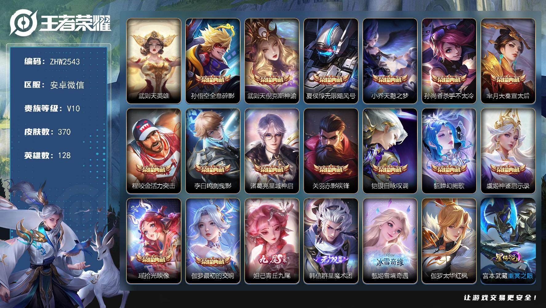 [15390078]安卓WX-V10-最强王者段位-128英雄-370皮肤-16典藏-3无双-5珍品传说-44传说-83史诗-3星传 【英雄全皮】:孙权全皮,影全皮 【荣耀典藏】:武则天英雄,孙悟空全息碎影,武则天倪克斯神谕,夏侯惇无限飓风号,小乔天鹅之梦,孙尚香杀手不太冷,芈月大秦宣太后,程咬金活力突击,李白鸣剑曳影,诸葛亮星域神启,关羽赤影疾锋,铠银白咏叹调,貂蝉幻阙歌,虞姬神鉴启示录,瑶拾光映像,伽罗最初的交响 【无双皮肤】:妲己青丘九尾,韩信群星魔术团,甄姬雪境奇遇 【珍品传说】:马可波罗怪盗基德,鲁班七号江户川柯南,孙策时之奇旅,暃朽木白哉,宫本武藏黑崎一护 【传说皮肤】:后羿神树通天,后羿千劫归真,司空震愿照山河定,女娲愿照千秋盛,妲己愿照众生和,澜愿照九州拓,蔡文姬愿照福禄聚,虞姬愿照岁时盈,云缨幻光神枪,桑启鸣野蒿,庄周牧神诗旅,墨子黄金天蝎座,海月金乌负日,典韦战鼓燎原,孙策乘龙淬吴钩,澜逐花归海,艾琳觅芳踪,孙膑小动物乐团,兰陵王影龙天霄,马可波罗妄想实况,东皇太一灼幽烈阳,公孙离记忆之芯,干将莫邪画中仙,吕布怒海麟威,百里守约碎云,马超无双飞将,蔡文姬花朝如约,赵云淬星耀世,李元芳飞鸢探春,诸葛亮时雨天司,镜炽阳神光,虞姬启明星使,曜云鹰飞将,李信一念神魔,刘备时之恋人,伽罗太华,张良黄金白羊座,达摩黄金狮子座,花木兰冠军飞将,后羿黄金射手座,孙尚香末日机甲,宫本武藏地狱之眼,吕布天魔缭乱,狄仁杰超时空战士 【限定皮肤】:蔡文姬夏日便利店,虞姬夏日便利店,姜子牙天穹之誓,李白谪仙醉月,狄仁杰阴阳师,赵云皇家上将,鲁班七号狮舞东方,庄周高山流水,高渐离玩趣恶龙,扁鹊奇幻香踪,芈月重明,芈月幻夜卜梦,吕布天魔缭乱,夏侯惇朔风刀,典韦穷奇,典韦蓝屏警告,马可波罗暗影游猎,马可波罗妄想实况,狄仁杰魔术师,狄仁杰万华元夜,达摩沙漠行僧,项羽海滩派对,老夫子醍醐杖,程咬金演武夺筹,王昭君午后时光,兰陵王影龙天霄,兰陵王金庭之子,花木兰瑞麟志,牛魔御旌,后羿如梦令,后羿圣弓游侠,李元芳云中旅人,虞姬启明星使,钟馗神迹守卫,钟馗驱傩正仪,杨玉环遇见飞天,杨戬潮玩骑兵,女娲朔望之晖,干将莫邪真爱魔法,干将莫邪画中仙,雅典娜黎明之约,鬼谷子原初探秘者,鬼谷子五谷丰年,诸葛亮时雨天司,黄忠火炮绅士,苏烈千军破阵,百里玄策原初追逐者,弈星混沌棋,梦奇顽趣,沈梦溪大漠名商,明世隐疑决卦,
