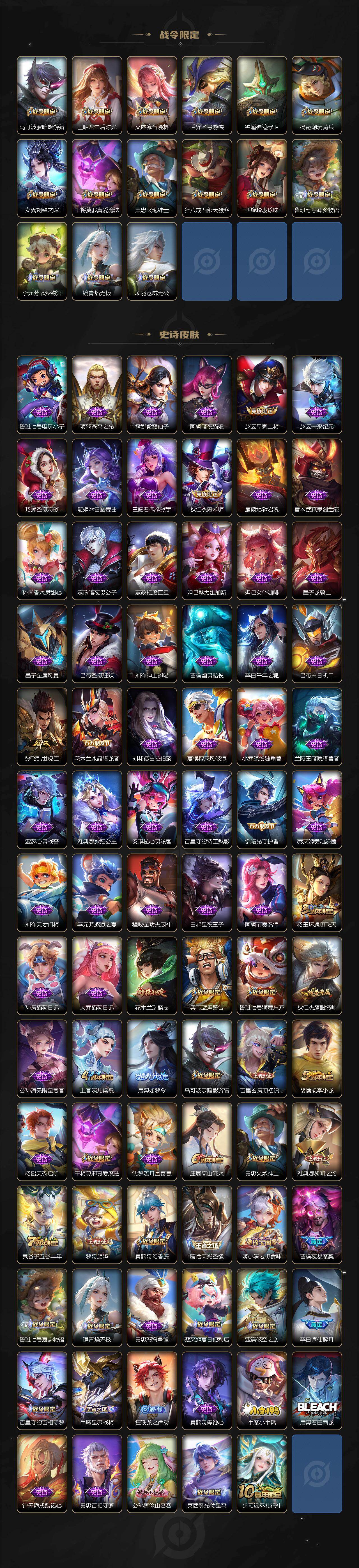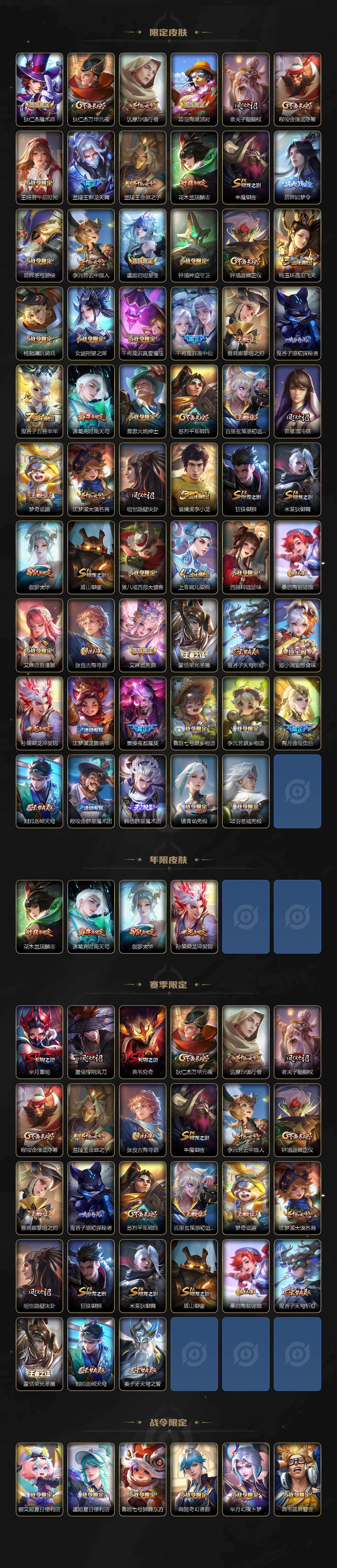 【限定皮肤】:蔡文姬夏日便利店,虞姬夏日便利店,姜子牙天穹之誓,李白谪仙醉月,狄仁杰阴阳师,赵云皇家上将,鲁班七号狮舞东方,庄周高山流水,高渐离玩趣恶龙,扁鹊奇幻香踪,芈月重明,芈月幻夜卜梦,吕布天魔缭乱,夏侯惇朔风刀,典韦穷奇,典韦蓝屏警告,马可波罗暗影游猎,马可波罗妄想实况,狄仁杰魔术师,狄仁杰万华元夜,达摩沙漠行僧,项羽海滩派对,老夫子醍醐杖,程咬金演武夺筹,王昭君午后时光,兰陵王影龙天霄,兰陵王金庭之子,花木兰瑞麟志,牛魔御旌,后羿如梦令,后羿圣弓游侠,李元芳云中旅人,虞姬启明星使,钟馗神迹守卫,钟馗驱傩正仪,杨玉环遇见飞天,杨戬潮玩骑兵,女娲朔望之晖,干将莫邪真爱魔法,干将莫邪画中仙,雅典娜黎明之约,鬼谷子原初探秘者,鬼谷子五谷丰年,诸葛亮时雨天司,黄忠火炮绅士,苏烈千军破阵,百里玄策原初追逐者,弈星混沌棋,梦奇顽趣,沈梦溪大漠名商,明世隐疑决卦,