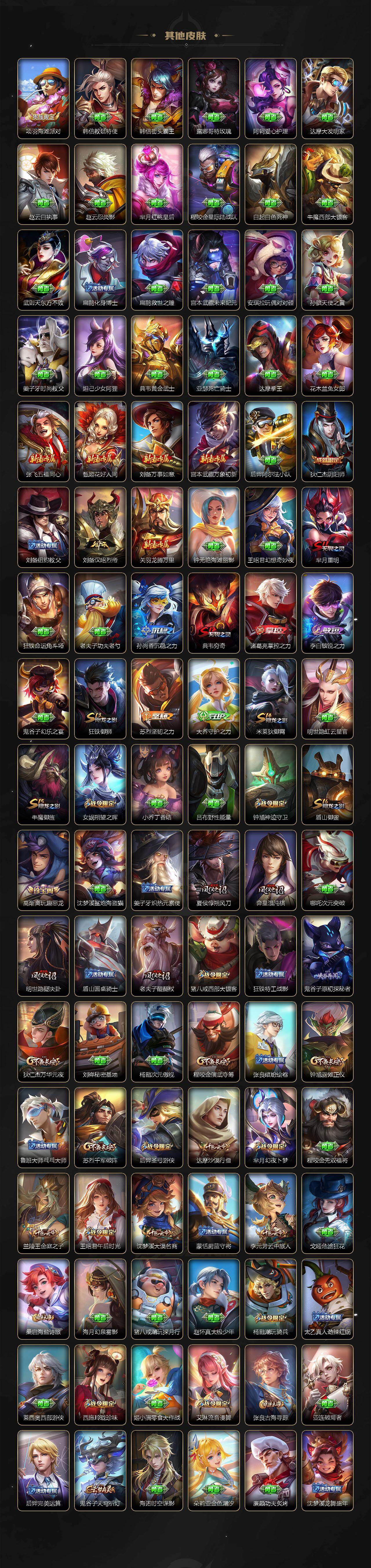 李元芳逐浪之夏,公孙离无限星赏官,大乔猫狗日记,孙策猫狗日记,阿轲节奏热浪,露娜紫霞仙子,王昭君偶像歌手,项羽苍穹之光,阿轲暗夜猫娘,雅典娜冰冠公主,吕布末日机甲,鲁班七号电玩小子,墨子龙骑士,嬴政摇滚巨星,刘禅绅士熊喵,刘禅天才门将,白起星夜王子,安琪拉心灵骇客,程咬金功夫厨神,刘邦德古拉伯爵,兰陵王暗隐猎兽者,曹操幽灵船长,宫本武藏鬼剑武藏,亚瑟心灵战警,杨戬天秀·启明,蔡文姬舞动绿茵,廉颇地狱岩魂,小乔缤纷独角兽,夏侯惇乘风破浪,花木兰水晶猎龙者,铠曙光守护者,墨子金属风暴,百里玄策原初追逐者,吕布圣诞狂欢,貂蝉圣诞恋歌,百里守约特工魅影,嬴政暗夜贵公子,雅典娜黎明之约,李白千年之狐,曹操夜都魔契,李白谪仙醉月