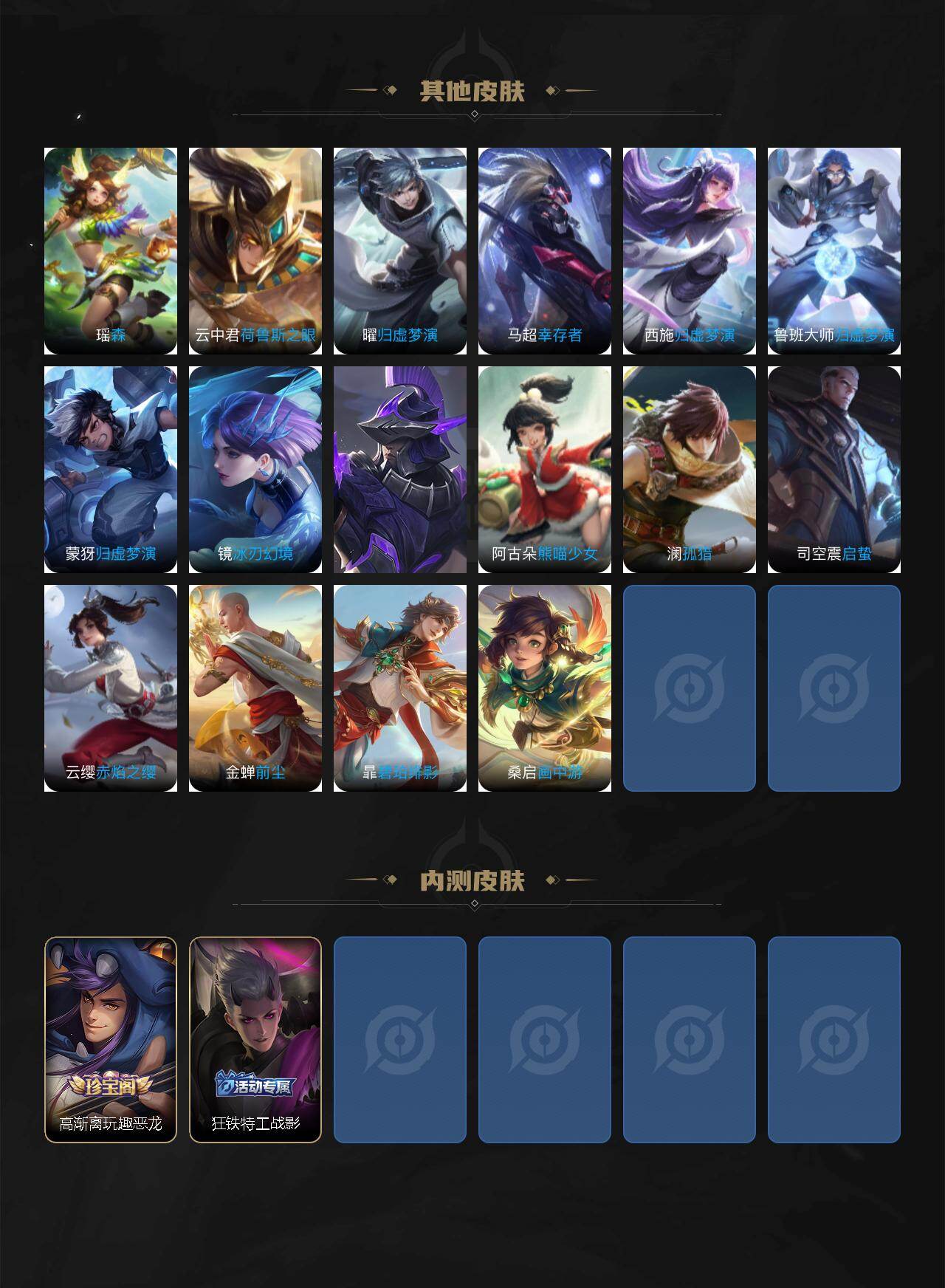 裴擒虎李小龙,上官婉儿梁祝,诸葛亮时雨天司,伽罗太华,花木兰瑞麟志,后羿如梦令,兰陵王影龙天霄,桑启鸣野蒿,澜愿照·九州拓,蔡文姬愿照·福禄聚,虞姬愿照·岁时盈,司空震愿照·山河定,妲己愿照·众生和,女娲愿照·千秋盛