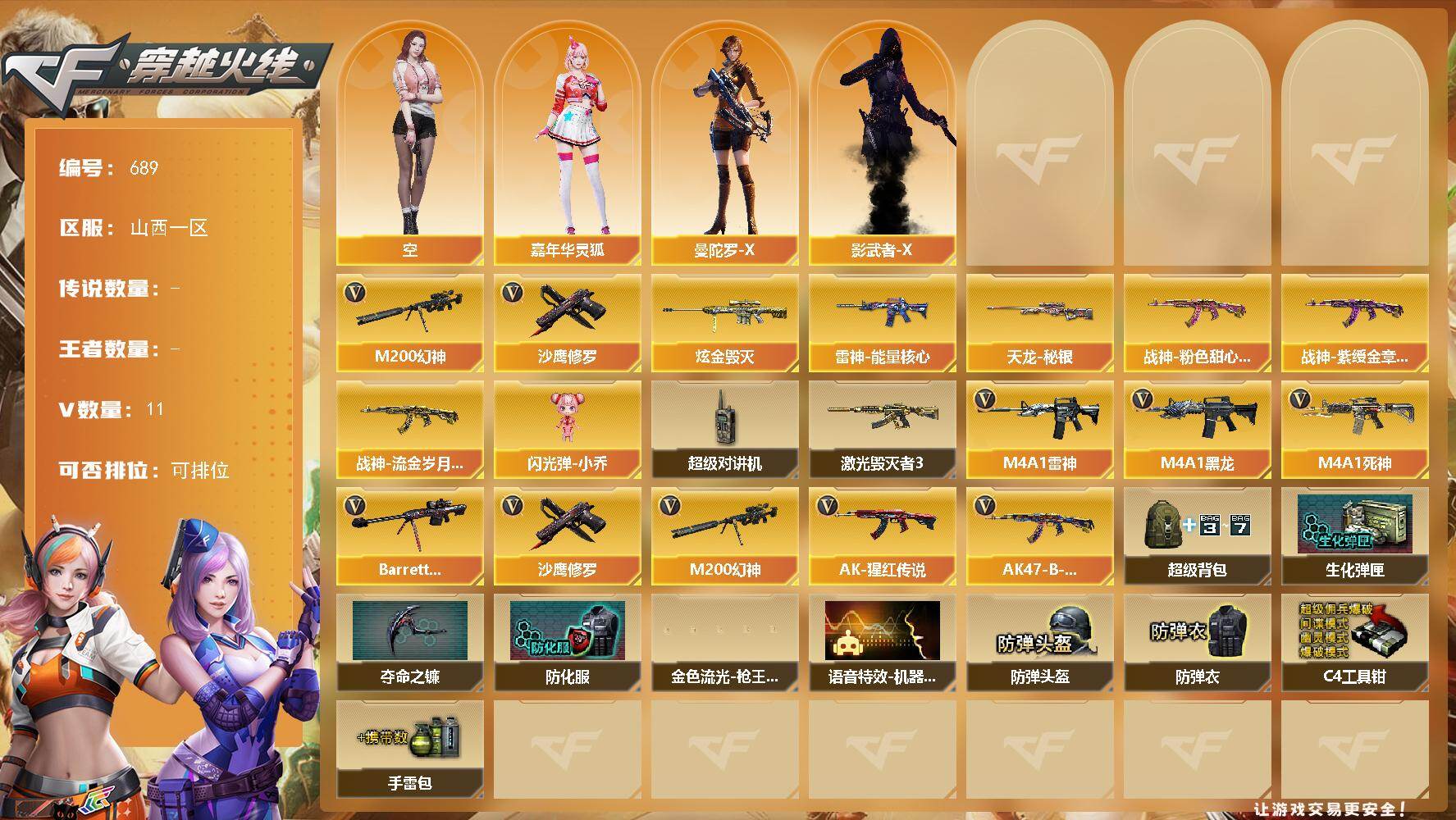 [15391453]山西一区-11V-0王者-1炫金 【热门武器】:M200-幻神,沙鹰-修罗*2 【王者炫金武器】:炫金毁灭 【皮肤】:雷神-能量核心,战神-粉色甜心皮肤,战神-紫绶金章皮肤,战神-流金岁月皮肤,天龙-秘银 【角色】:空,嘉年华灵狐,曼陀罗-X,影武者-X 【人偶武器】:闪光弹-小乔 【暴走生化】:超级对讲机 【挑战大师】:激光毁灭者III 【英雄级武器】:M4A1-黑龙,M4A1-雷神,M4A1-死神,AK-47-猩红传说,AK47-B-战神,Barrett-毁灭,M200-幻神,沙鹰-修罗*2 【道具】:超级背包,生化弹匣,夺命之镰,防化服,金色流光-枪王排位*2,星辰流光-枪王排位,枪王排位28赛季金色流光,语音特效-机器人,防弹头盔*4,防弹衣*4,C4工具钳*3,手雷包*5 【特殊枪械】: