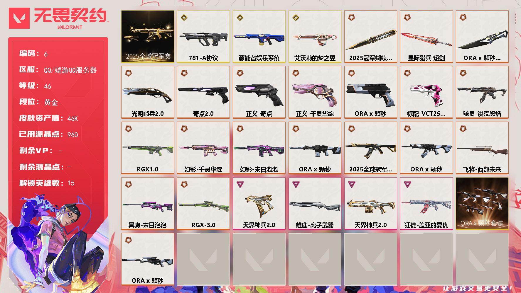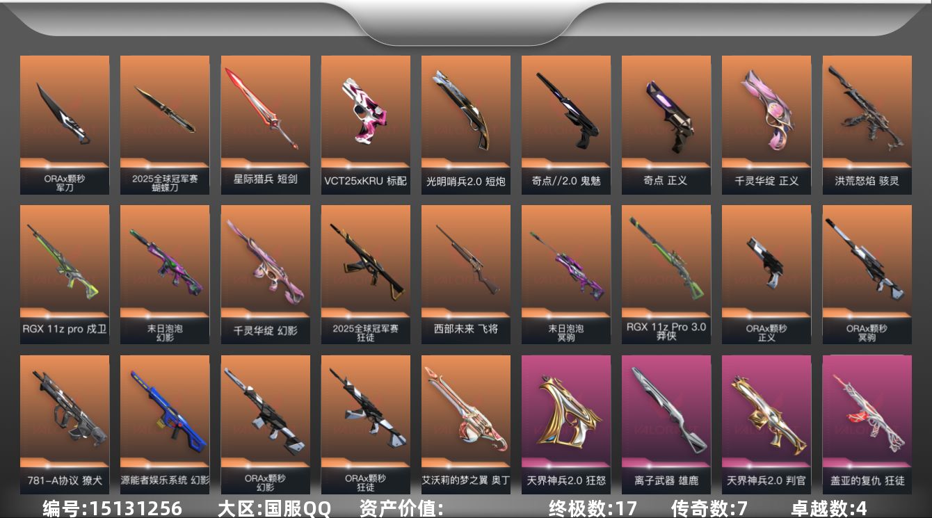 [15131256]【套装】:2025全球冠军赛套装,ORA x 颗秒套装 【英雄】:炼狱,暮蝶,铁臂,捷风,不死鸟,贤者,猎枭,芮娜,奇乐,尚勃勒,K/O,盖可,黑梦,钢锁 【近战 武器】:近战武器-2025全球冠军赛 蝴蝶刀,近战武器-ORA x 颗秒 军刀,近战武器-星际猎兵 短剑 【狂徒】:狂徒-2025全球冠军赛,狂徒-ORA x 颗秒,狂徒-盖亚的复仇 【幻影】:幻影-源能者娱乐系统,幻影-千灵华绽,幻影-末日泡泡,幻影-ORA x 颗秒 【戍卫】:戍卫-RGX 11z Pro 【獠犬】:獠犬-781-A协议 【冥驹】:冥驹-末日泡泡,冥驹-ORA x 颗秒 【飞将】:飞将-西部未来 【莽侠】:莽侠-RGX 11z Pro//3.0 【奥丁】:奥丁-艾沃莉的梦之翼 【判官】:判官-天界神兵//2.0 【雄鹿】:雄鹿-离子武器 【骇灵】:骇灵-洪荒怒焰 【VCT手枪】:标配-VCT25 x KRÜ 【正义】:正义-奇点,正义-千灵华绽,正义-ORA x 颗秒 【鬼魅】:鬼魅-奇点//2.0 【狂怒】:狂怒-天界神兵//2.0 【短炮】:短炮-光明哨兵//2.0 【卡面】:代号红色 卡面,新兵报到 卡面,V契约 卡面,无畏契约 卡面 【喷漆】:胜利属于无畏契约 喷漆,GLHF 喷漆,无畏契约 喷漆 【挂饰】:无畏契约 纪念币 挂饰
