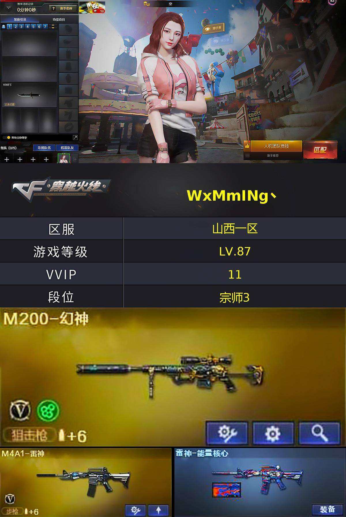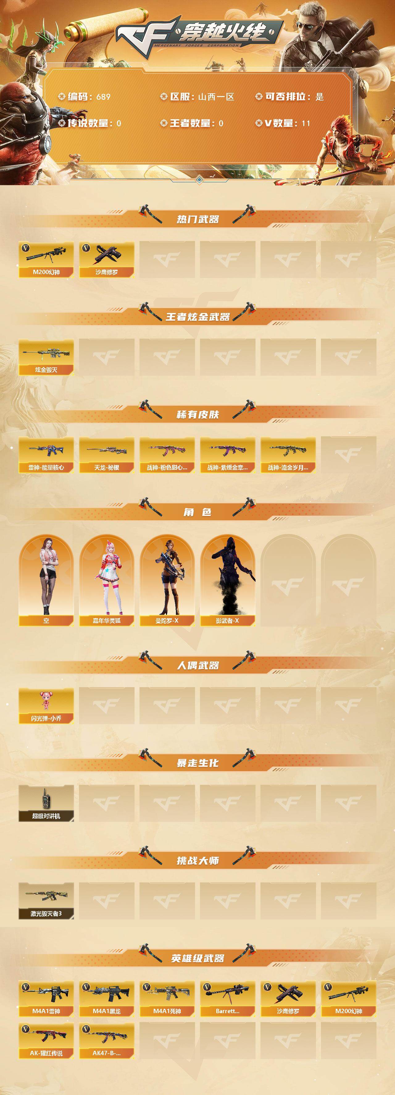 [15391453]山西一区-11V-0王者-1炫金 【热门武器】:M200-幻神,沙鹰-修罗*2 【王者炫金武器】:炫金毁灭 【皮肤】:雷神-能量核心,战神-粉色甜心皮肤,战神-紫绶金章皮肤,战神-流金岁月皮肤,天龙-秘银 【角色】:空,嘉年华灵狐,曼陀罗-X,影武者-X 【人偶武器】:闪光弹-小乔 【暴走生化】:超级对讲机 【挑战大师】:激光毁灭者III 【英雄级武器】:M4A1-黑龙,M4A1-雷神,M4A1-死神,AK-47-猩红传说,AK47-B-战神,Barrett-毁灭,M200-幻神,沙鹰-修罗*2 【道具】:超级背包,生化弹匣,夺命之镰,防化服,金色流光-枪王排位*2,星辰流光-枪王排位,枪王排位28赛季金色流光,语音特效-机器人,防弹头盔*4,防弹衣*4,C4工具钳*3,手雷包*5 【特殊枪械】: