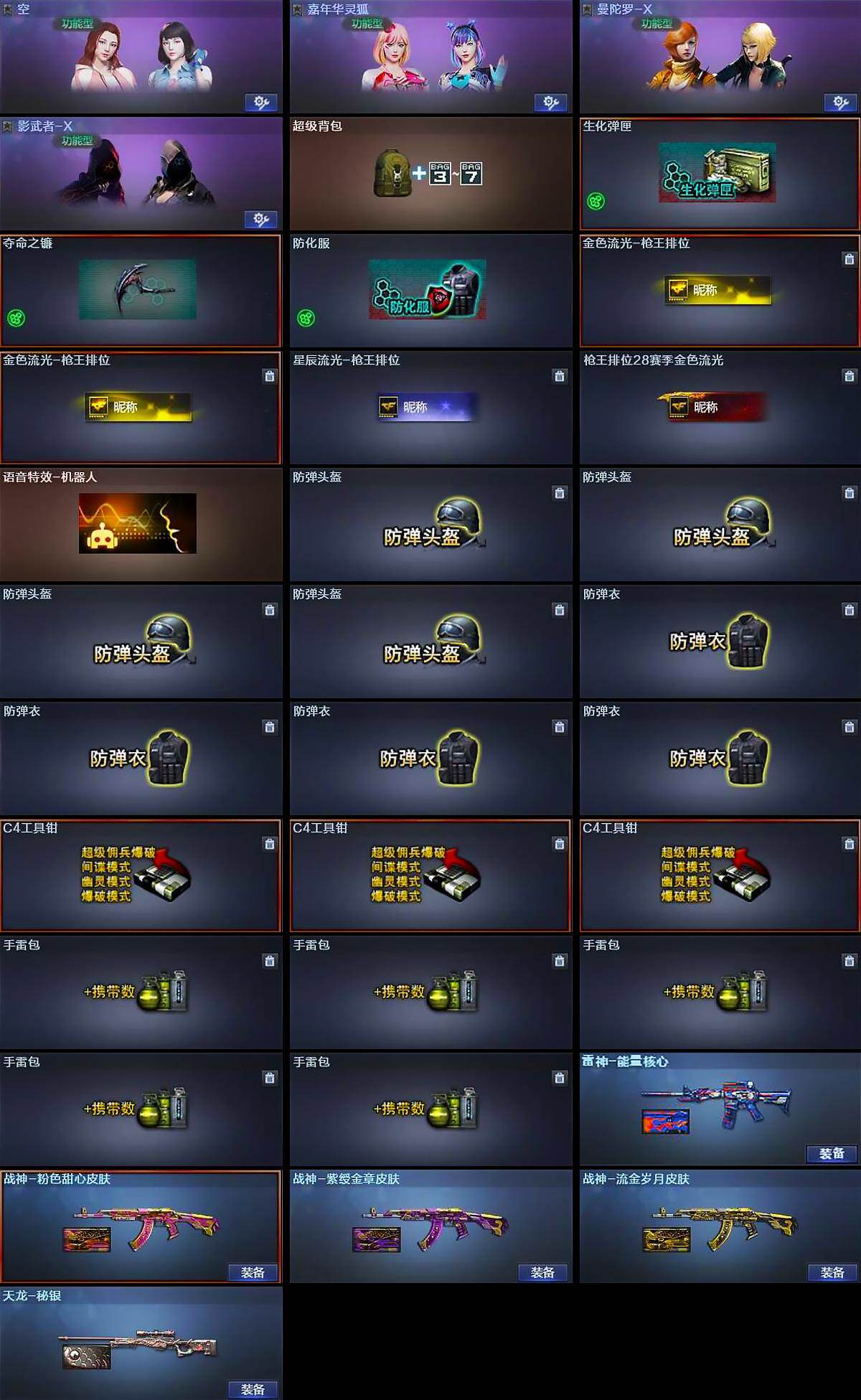 【道具】:超级背包,生化弹匣,夺命之镰,防化服,金色流光-枪王排位*2,星辰流光-枪王排位,枪王排位28赛季金色流光,语音特效-机器人,防弹头盔*4,防弹衣*4,C4工具钳*3,手雷包*5